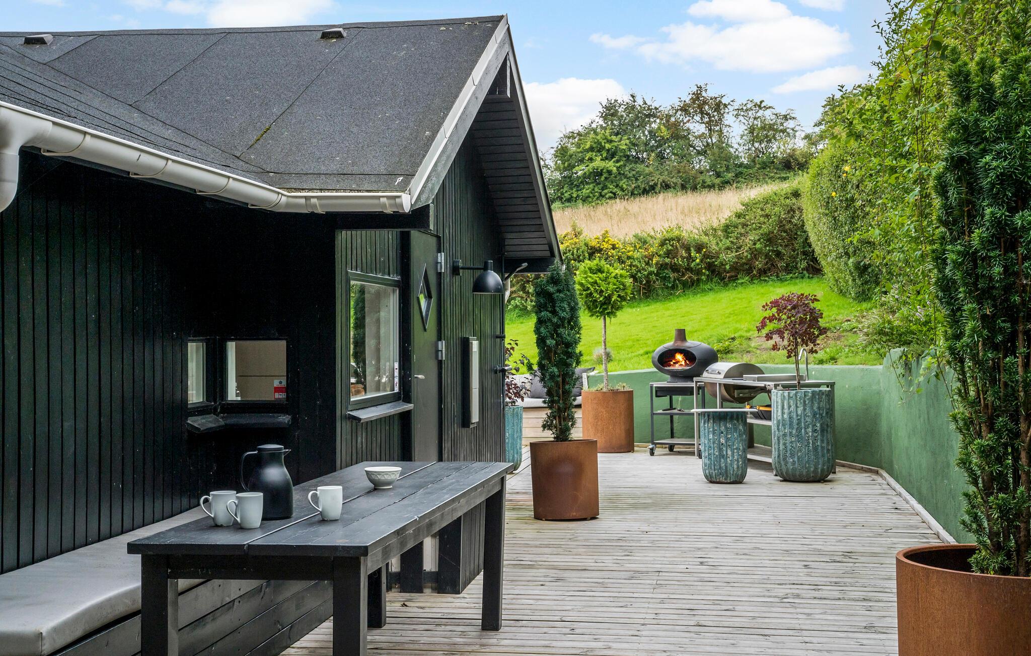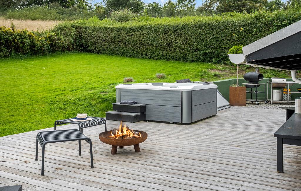 Terrassen indbyder til, at I kan nyde jeres måltider under åben himmel, mens I suger den friske luft og den smukke udsigt til jer. Slap af i spabadet, eller gør det hyggeligt omkring ildstedet om aftenen og nyd den rolige natur omkring jer.