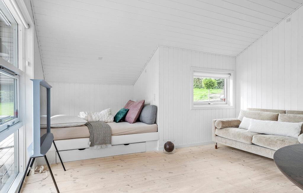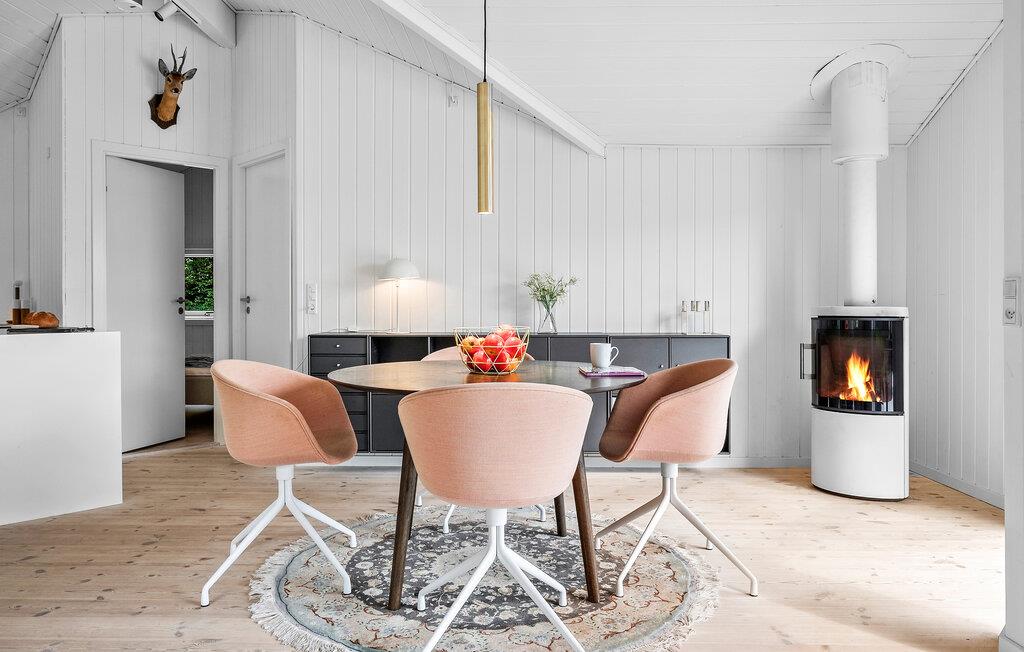 Allerede ved indgangen til den lyse og moderne stue i jeres feriehus i Drejens vil I mærke den hyggelige og indbydende atmosfære. De store vinduer giver en fantastisk udsigt over fjorden og lader masser af dagslys strømme ind. Sæt jer på den komfortable sofa og nyd afslappende timer foran brændeovnen, der på kølige dage skaber en behagelig varme. Det åbne køkken er ikke kun moderne og veludstyret, men også perfekt til hyggelige madlavningsaftener. Tilbered en lækker morgenmad her, inden I samles ved det store spisebord for at planlægge jeres dag.
