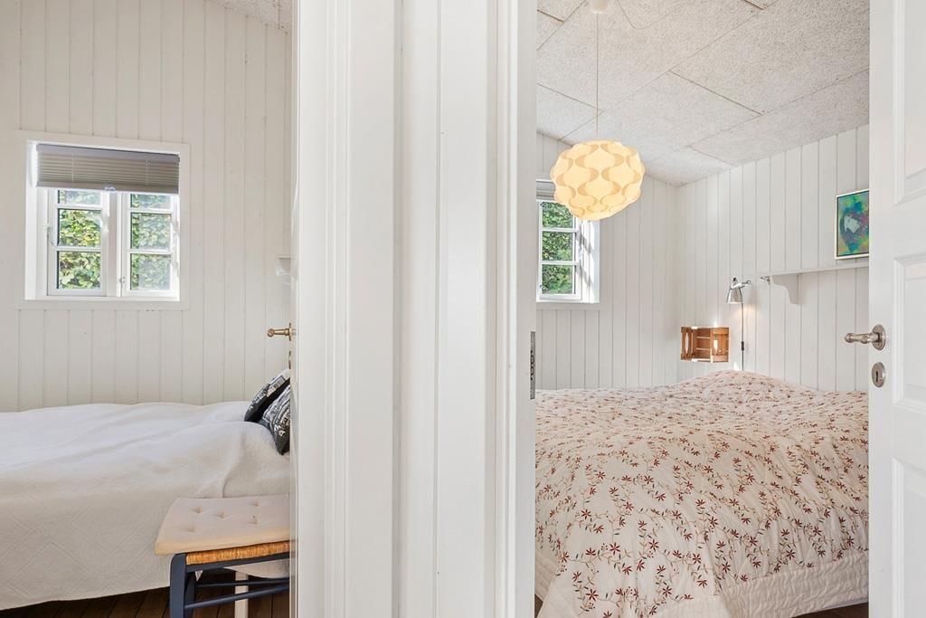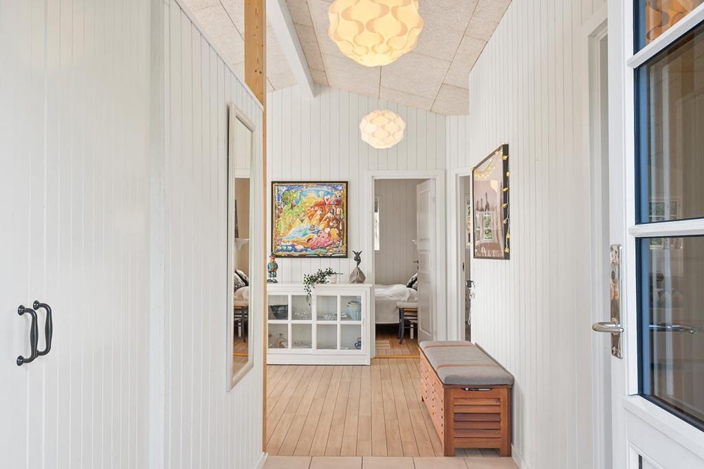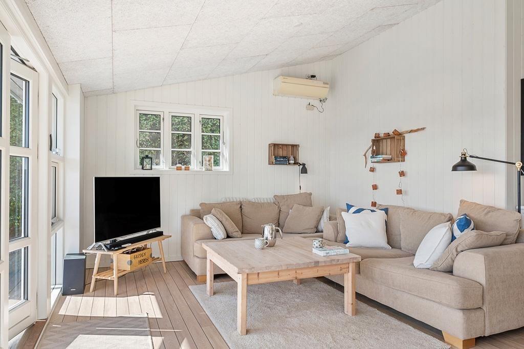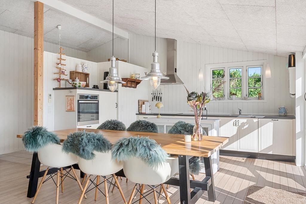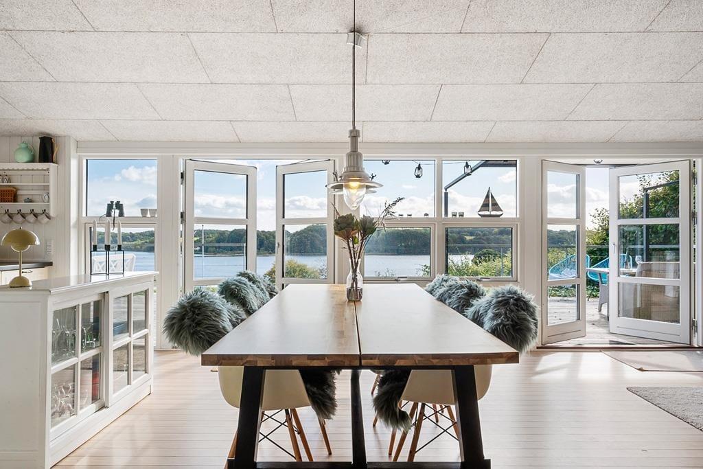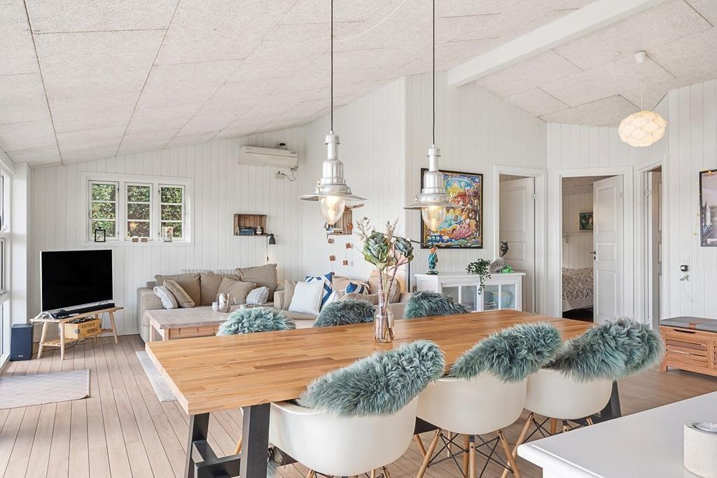 Når du træder ind i sommerhuset på Fjorddalen, mødes du af en lys og venlig atmosfære, hvor indretningen er præget af hygge og funktionalitet. Store vinduespartier trækker fjorden helt ind i stuen og giver en følelse af at være i ét med naturen – selv når du sidder i sofaen med en kop kaffe eller en god bog. Det åbne køkken-alrum skaber en naturlig ramme for hyggelige middage, hvor samtalerne flyder frit, mens du samtidig kan nyde udsigten til vandet. De rolige omgivelser og den gennemtænkte indretning gør det nemt at finde ro og føle sig hjemme fra første øjeblik. Her er plads til både fælles aktiviteter og stille stunder, hvor du kan lade op i dit eget tempo.