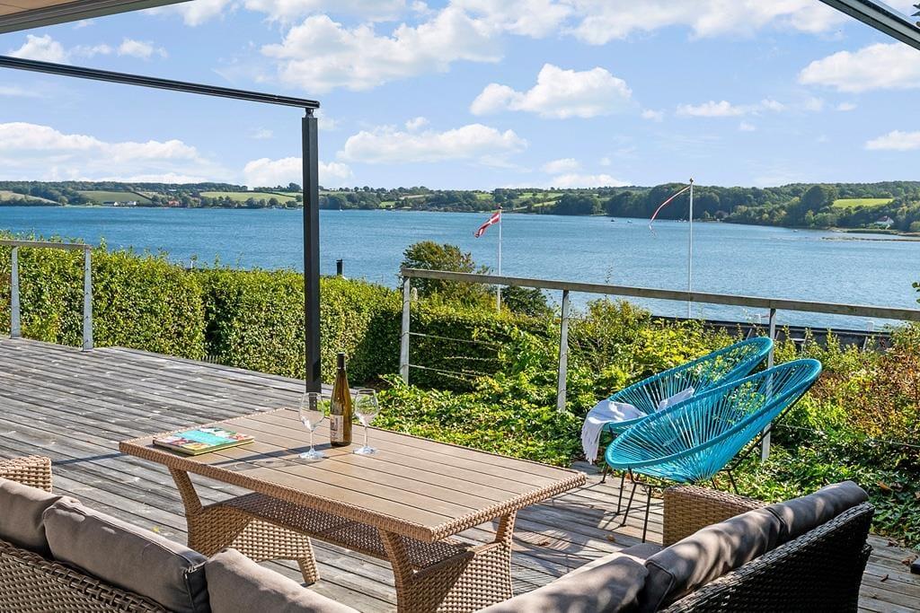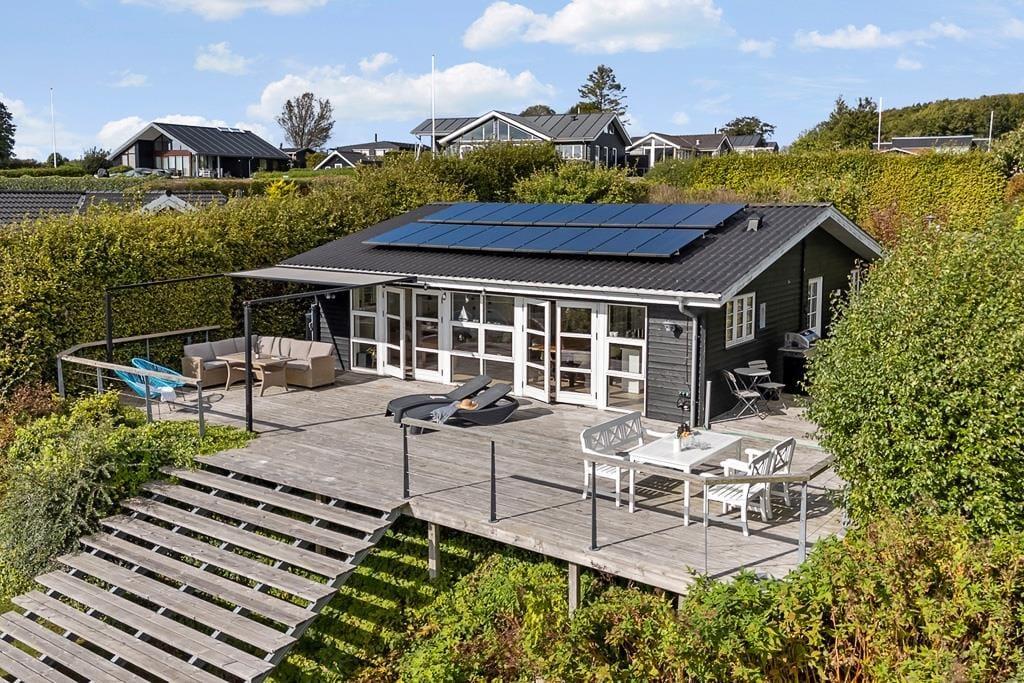 Sommerhusets store træterrasse er et af de steder, hvor livet virkelig leves. Her kan du slå markisen ud og finde skygge på varme sommerdage eller sidde beskyttet, når aftenduggen falder. Udsigten til fjorden gør enhver stund på terrassen til noget særligt – uanset om du nyder en friskbrygget morgenkaffe, en god middag med familien eller bare lader blikket hvile på det rolige vand. Den naturskønne have omkring sommerhuset indbyder til afslapning og samvær, hvor børnene kan lege frit, mens de voksne finder en stille krog at trække sig tilbage til. Her får du fornemmelsen af ægte sommerhusliv, hvor tiden går lidt langsommere, og naturen er en naturlig del af ferien.