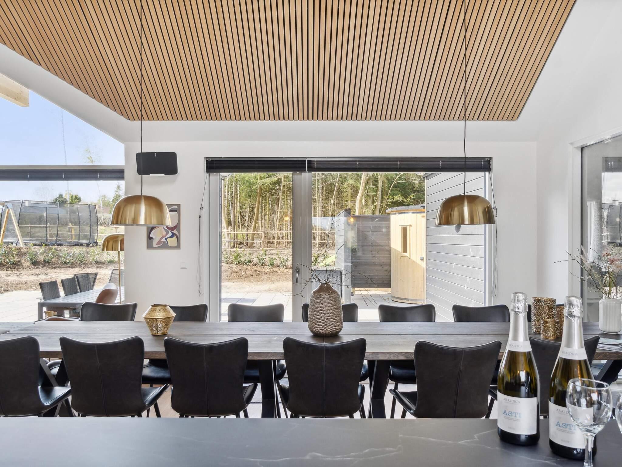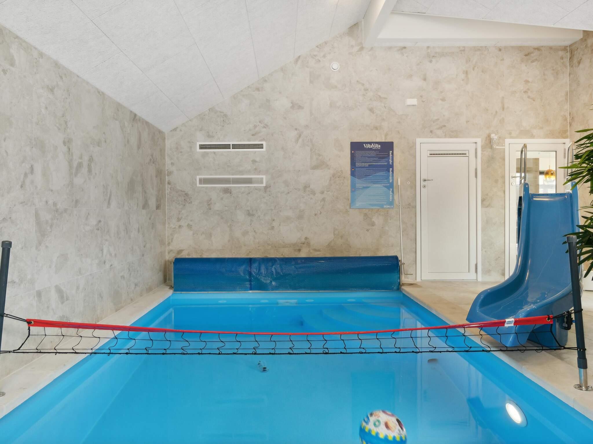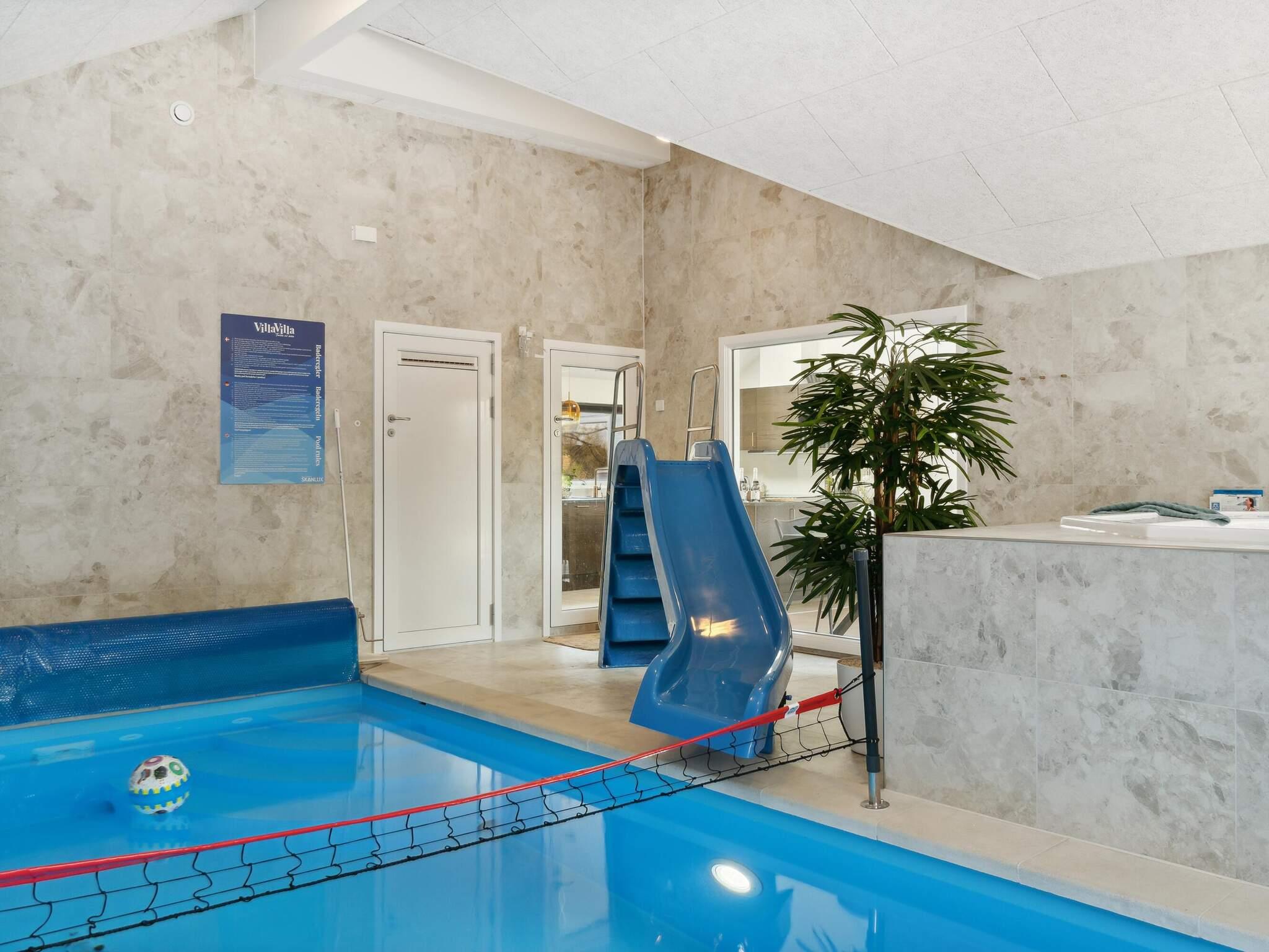 I dette feriehus kan du opfylde ethvert ønske om wellness og afslapning i luksuriøse omgivelser. Her har du dit helt eget wellnessområde. Du kan nyde en stille stund under stjernerne i det udendørs spabad eller varme dig i den udendørs sauna. Vil du have noget lidt mere aktivt, kan du tage en dukkert i den indendørs swimmingpool med rutsjebane og volleyballnet. Ved poolen finder du endnu et spabad med plads til 7-9 personer.