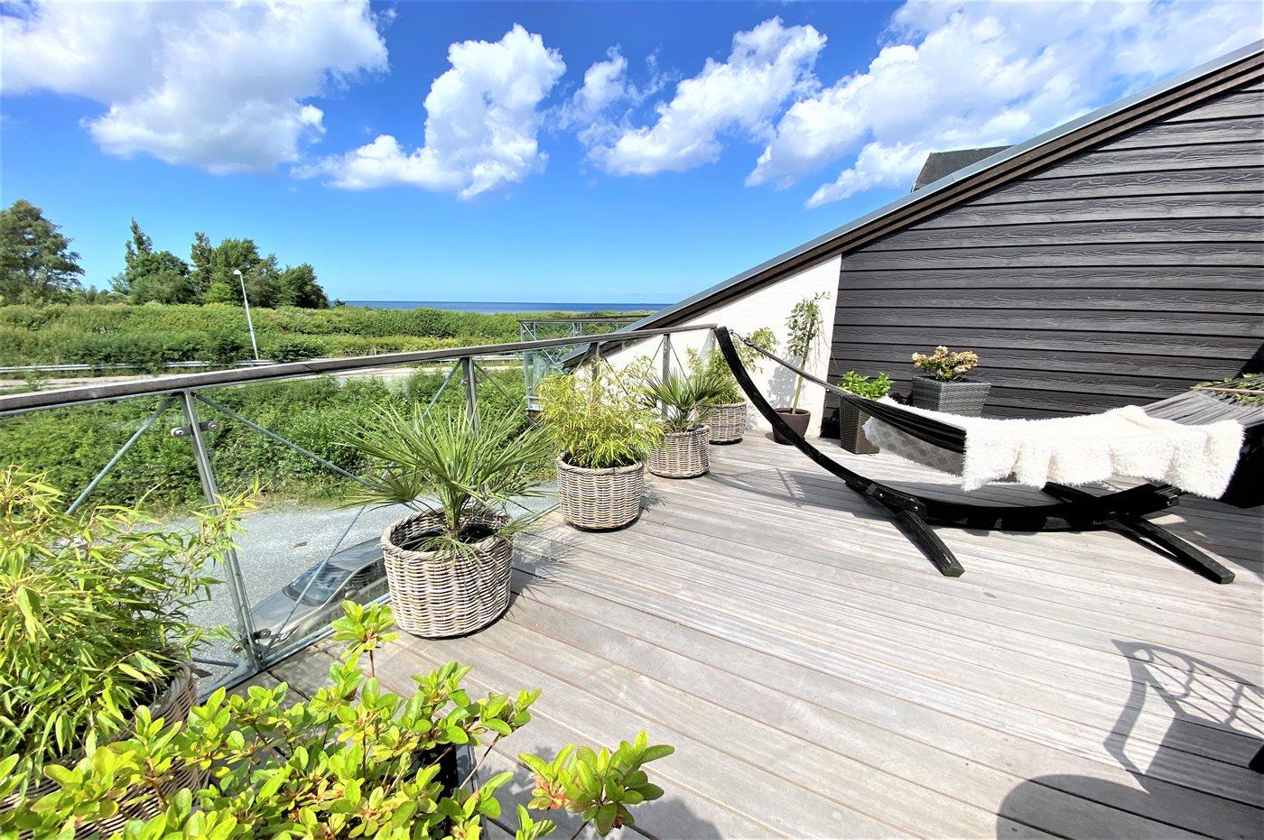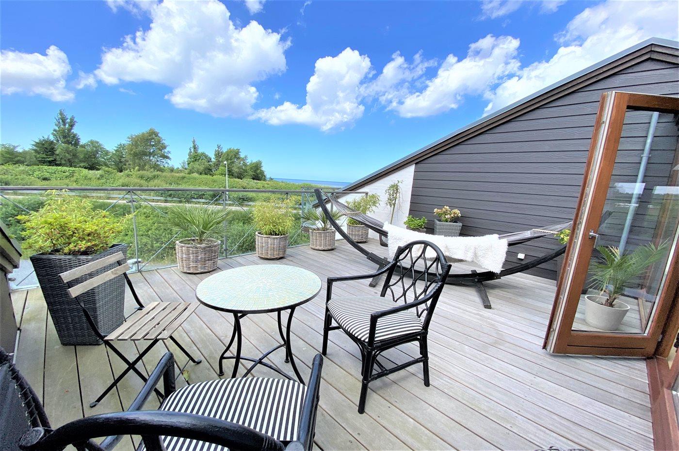 Feriebolig i Dronningmølle med havudsigt, stor tagterrasse og tæt på børnevenlig sandstrand.