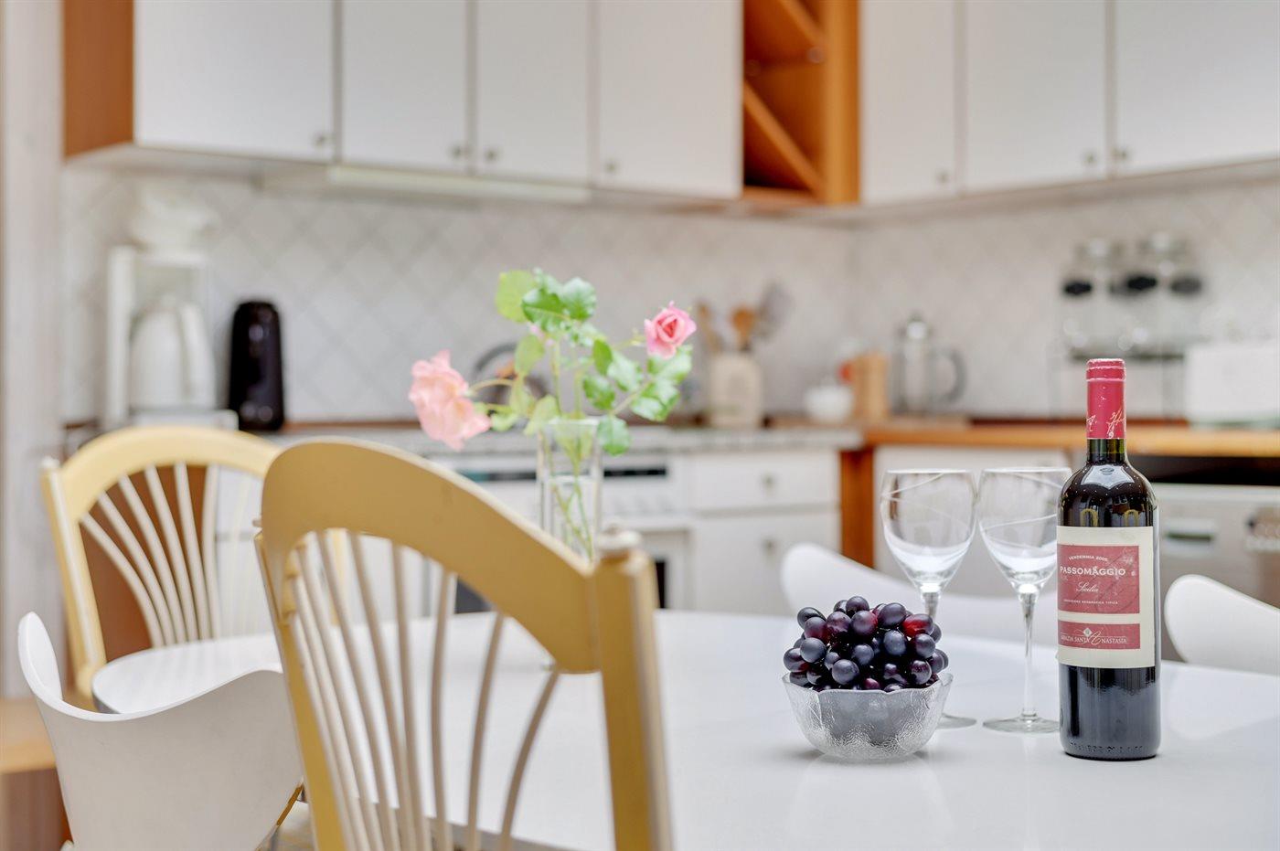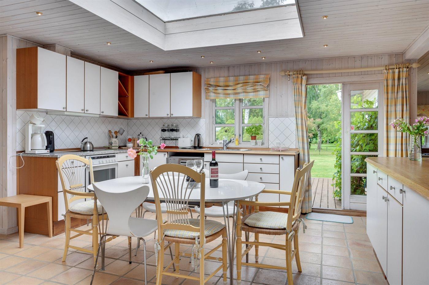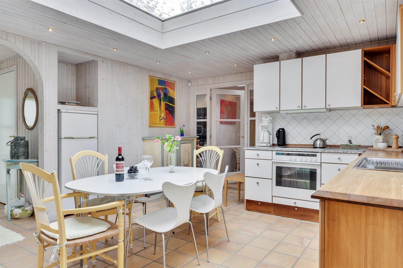 Køkkenet er udstyret med 1 køleskab. Der er 4 keramiske kogeplader, varmluftovn, mikrobølgeovn samt opvaskemaskine.