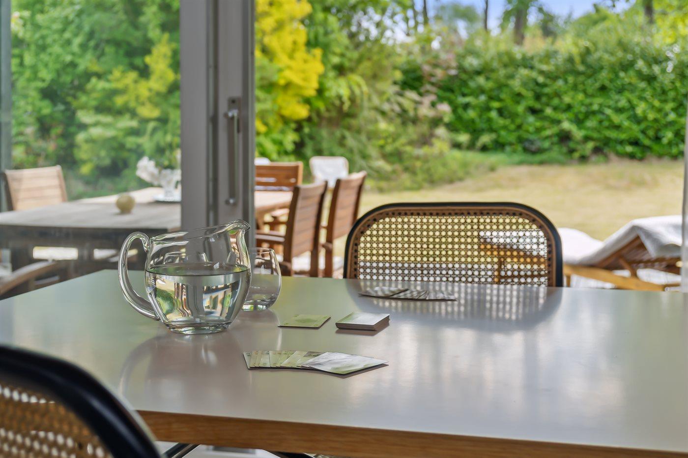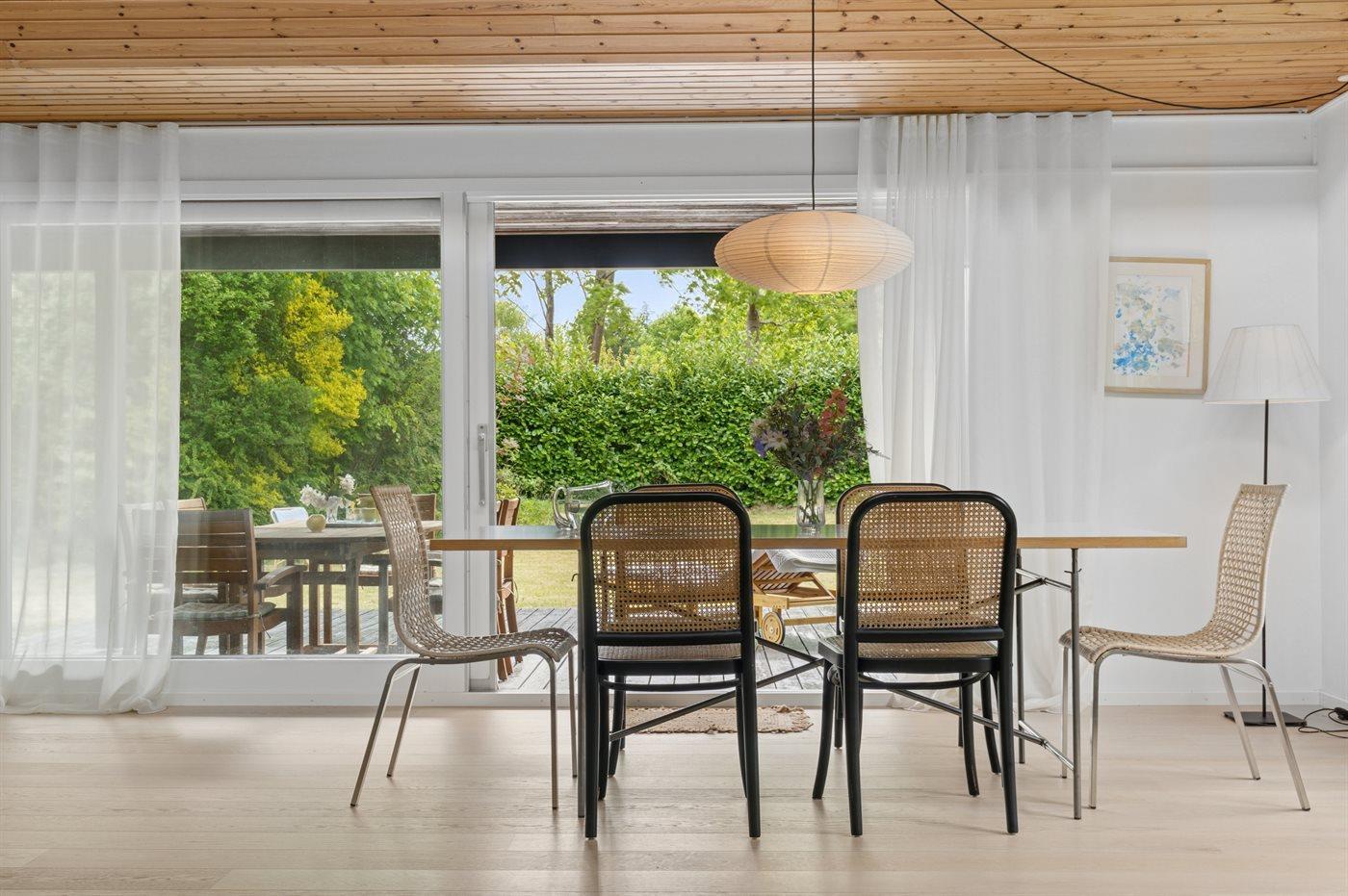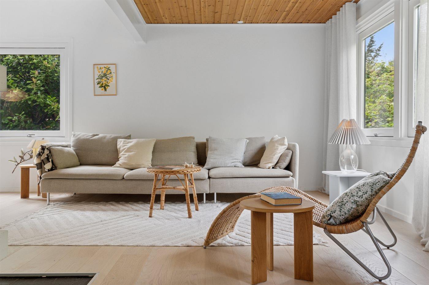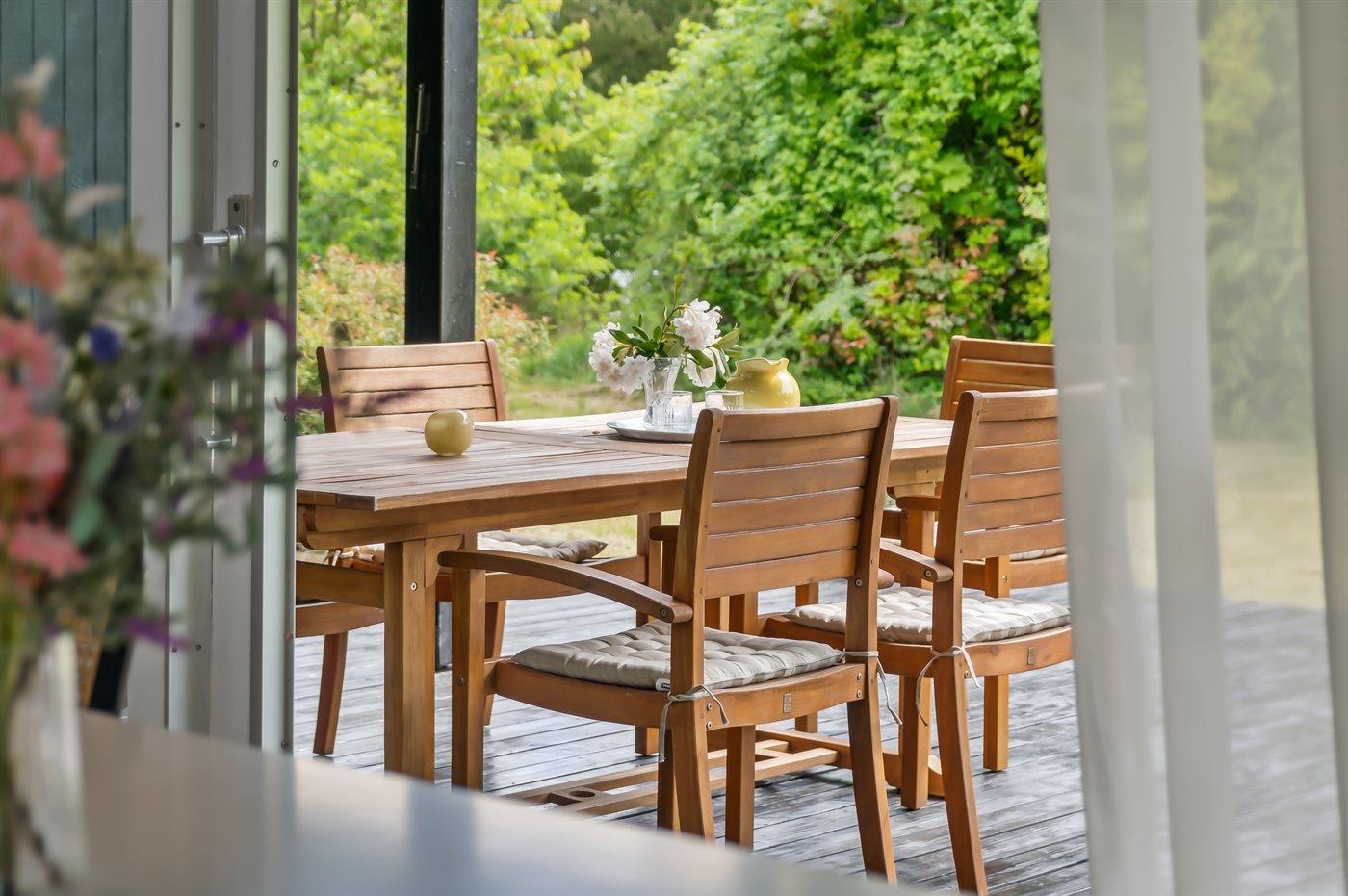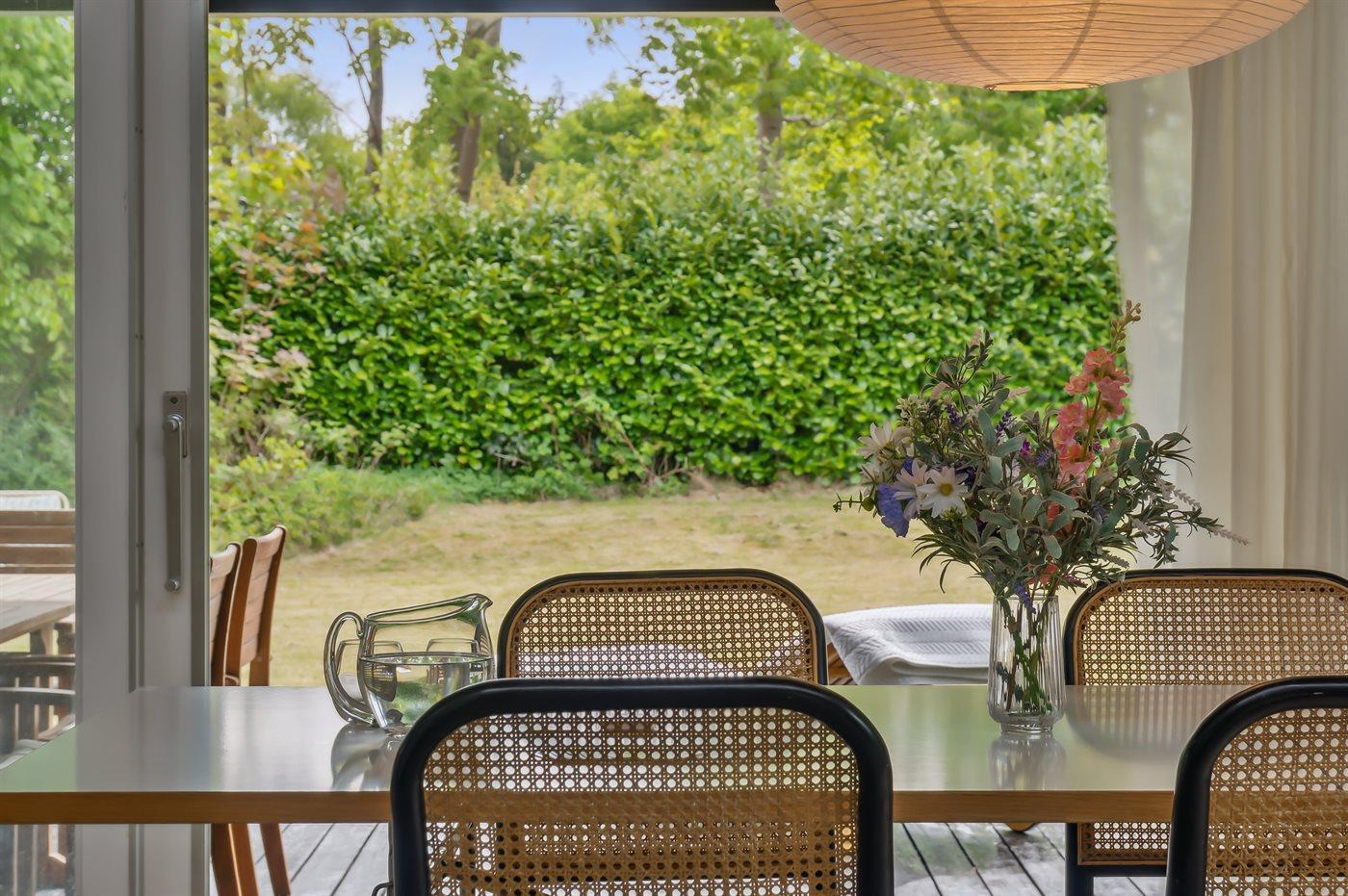 Huset har et stort, åbent køkken-alrum med højt til loftet og udgang til overdækket terrasse. Her kan du nyde din ferie – både inde og ude i haven.
