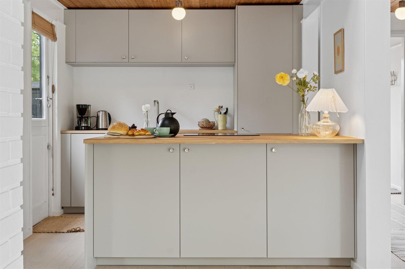 Køkkenet er udstyret med 1 køleskab. Der er 4 induktionskogeplader, varmluftovn samt opvaskemaskine.