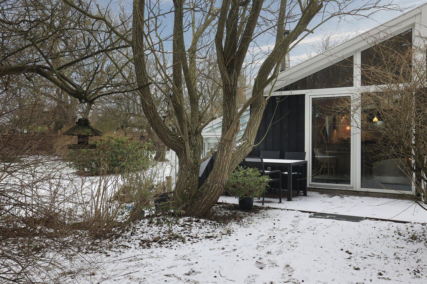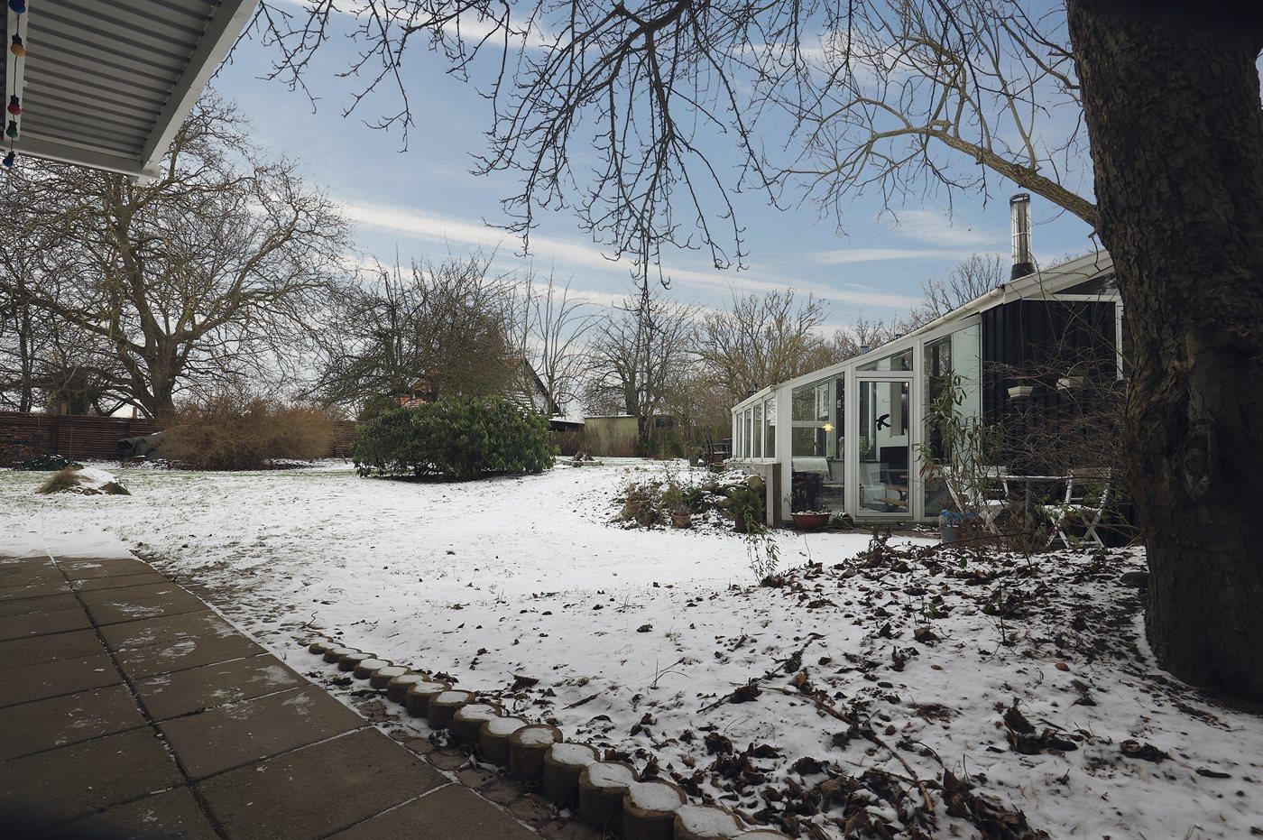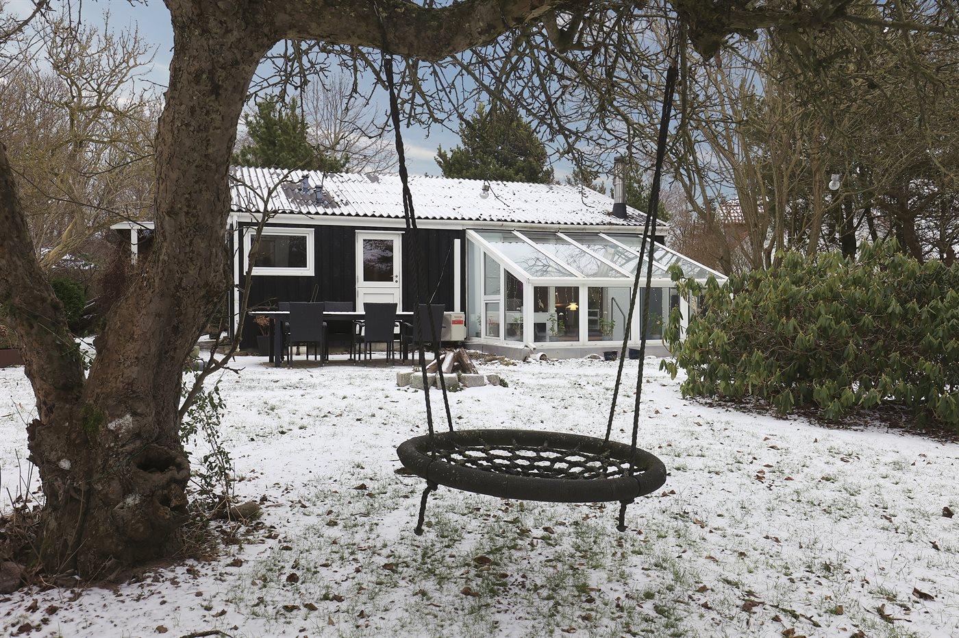 Huset ligger på en solrig og ugenert grund med en frodig have, hvor gamle frugttræer skaber både stemning og læ. Haven byder på små, rolige oaser, der indbyder til afslapning, måltider i det fri og lange sommeraftener på terrassen omgivet af grønt.