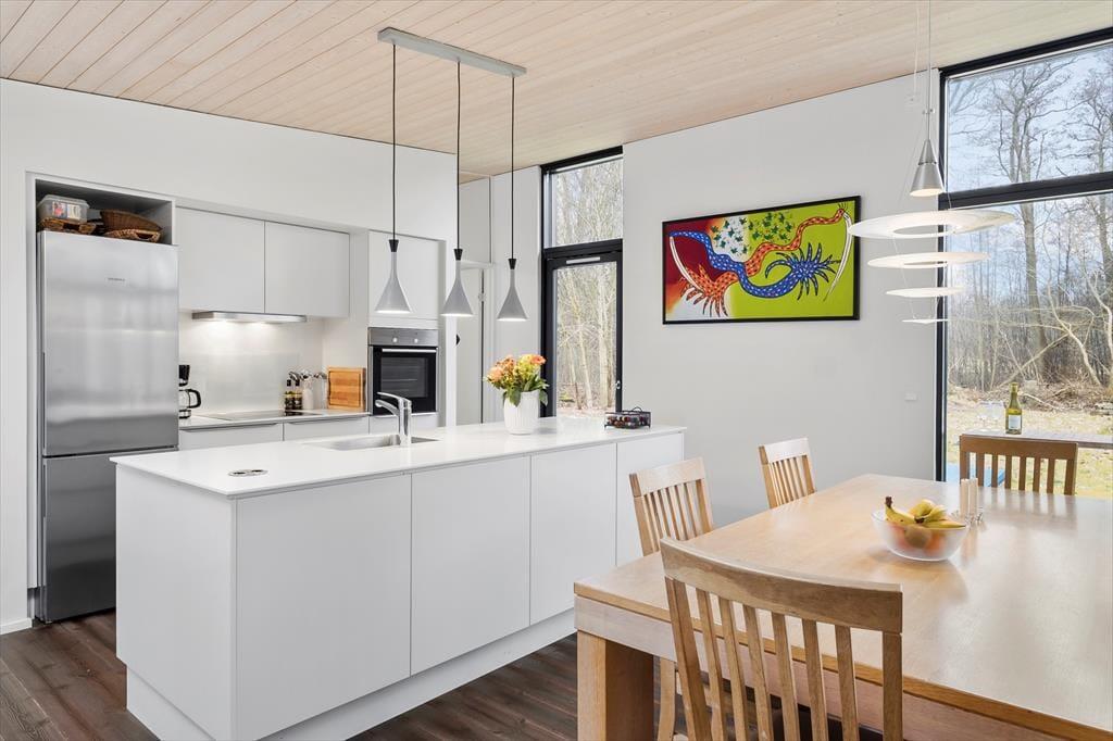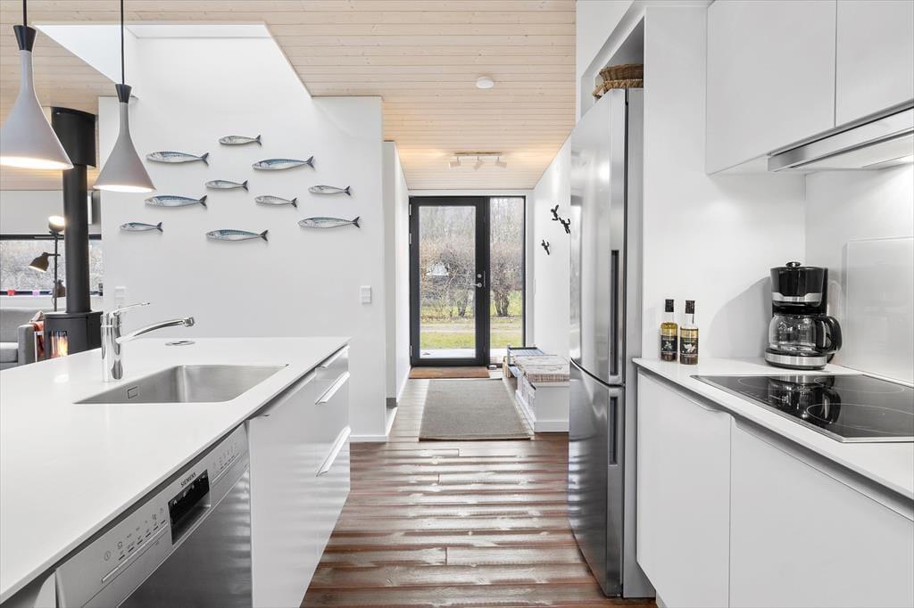 Det stilrene køkken er åbent og veludstyret, perfekt til at lave feriens måltider, mens samtalen flyder frit.