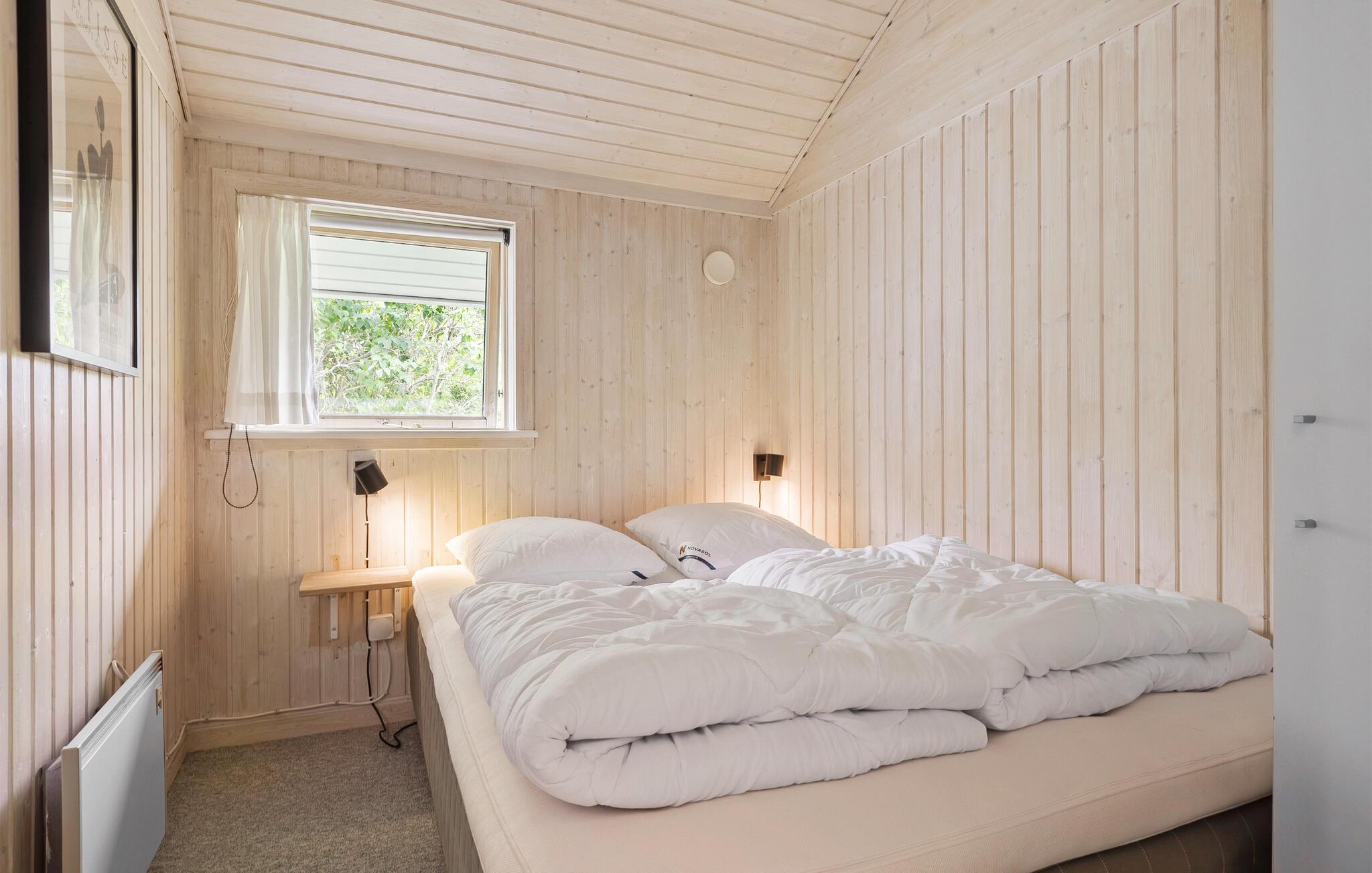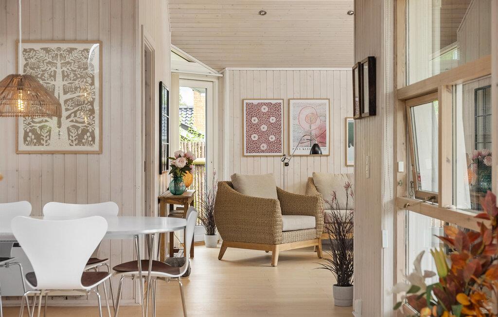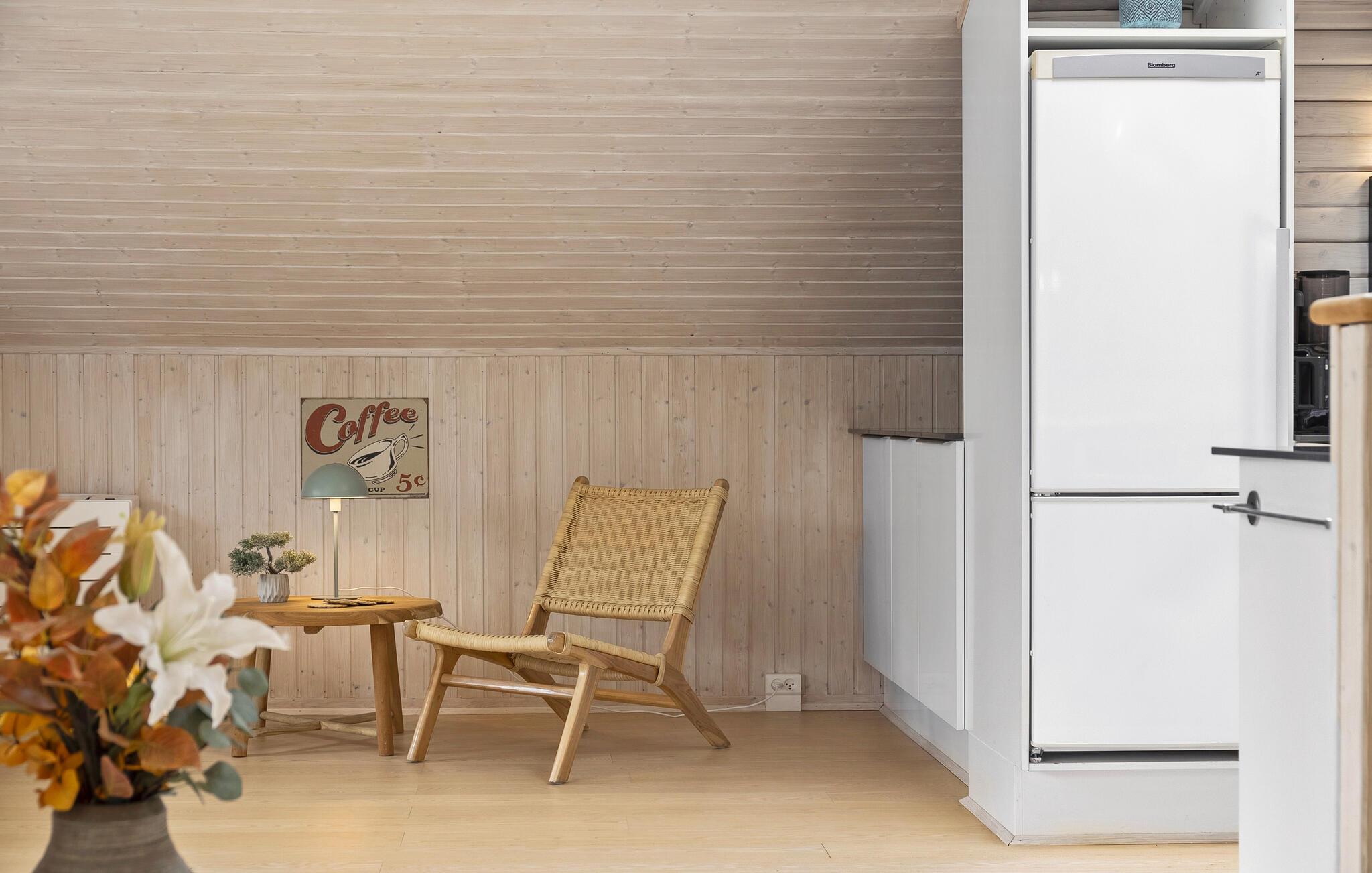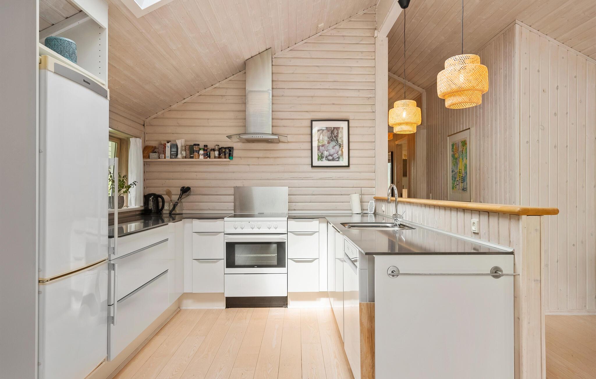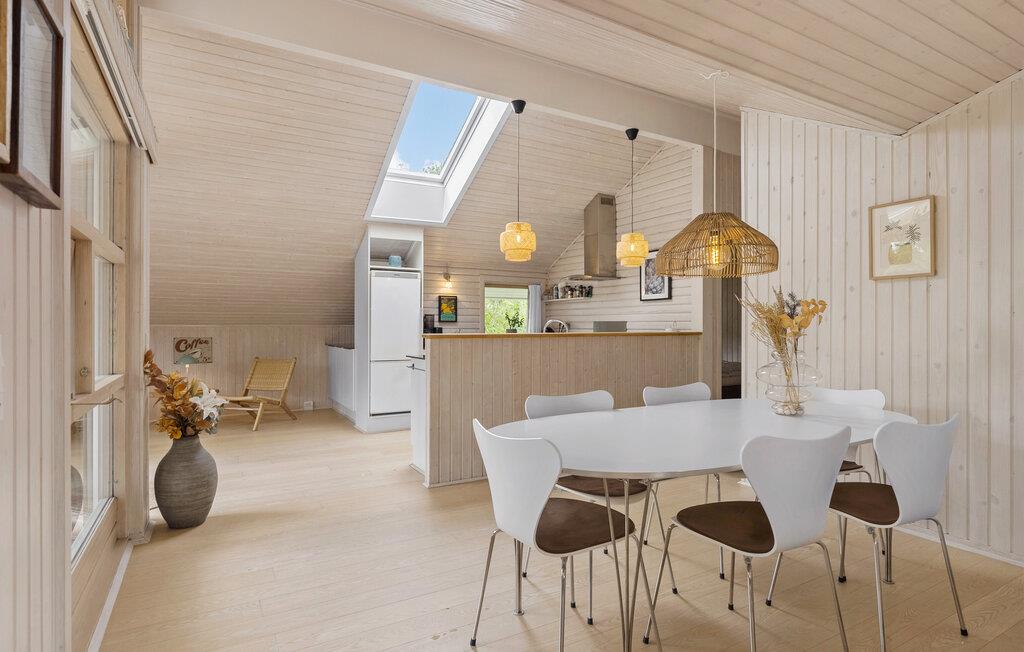 Velkommen til en skøn ferie, hvor hele familien kommer helt ned i tempo. Her bliver dette hus den optimale ramme, for både inde og ude emmer stedet af ro. Giv jer i kast med lækre retter i køkkenet, mens børnene spiller brætspil i stuen. Dæk op til en hyggelig middag, hvor I rigtig kan nyde opholdsrummets lyse trævægge, høje lofter og store vinduespartier ud mod haven. Sidst på dagen kan I læne jer tilbage med en god bog i sofaen, mens ilden knitrer i brændeovnen.