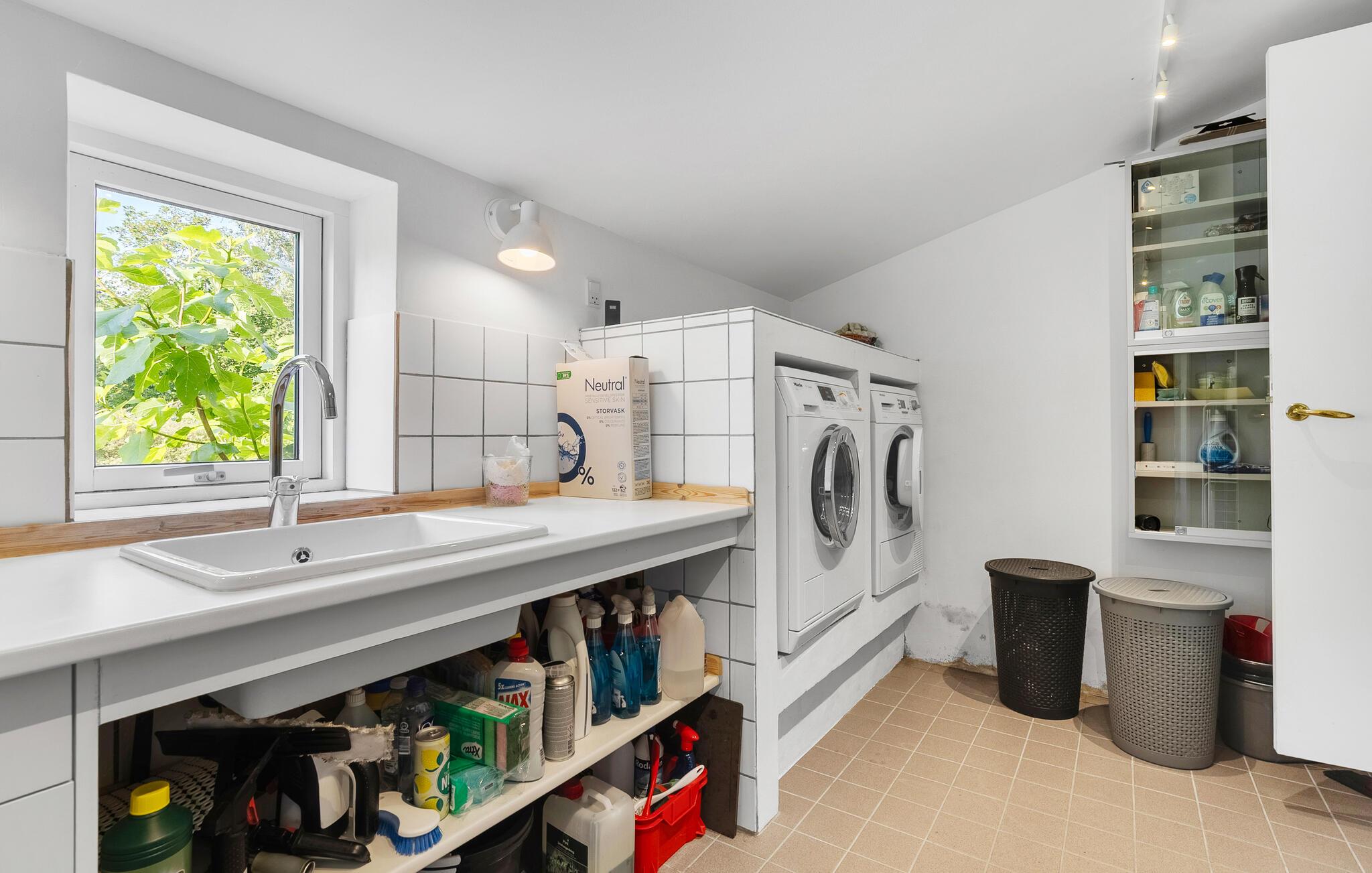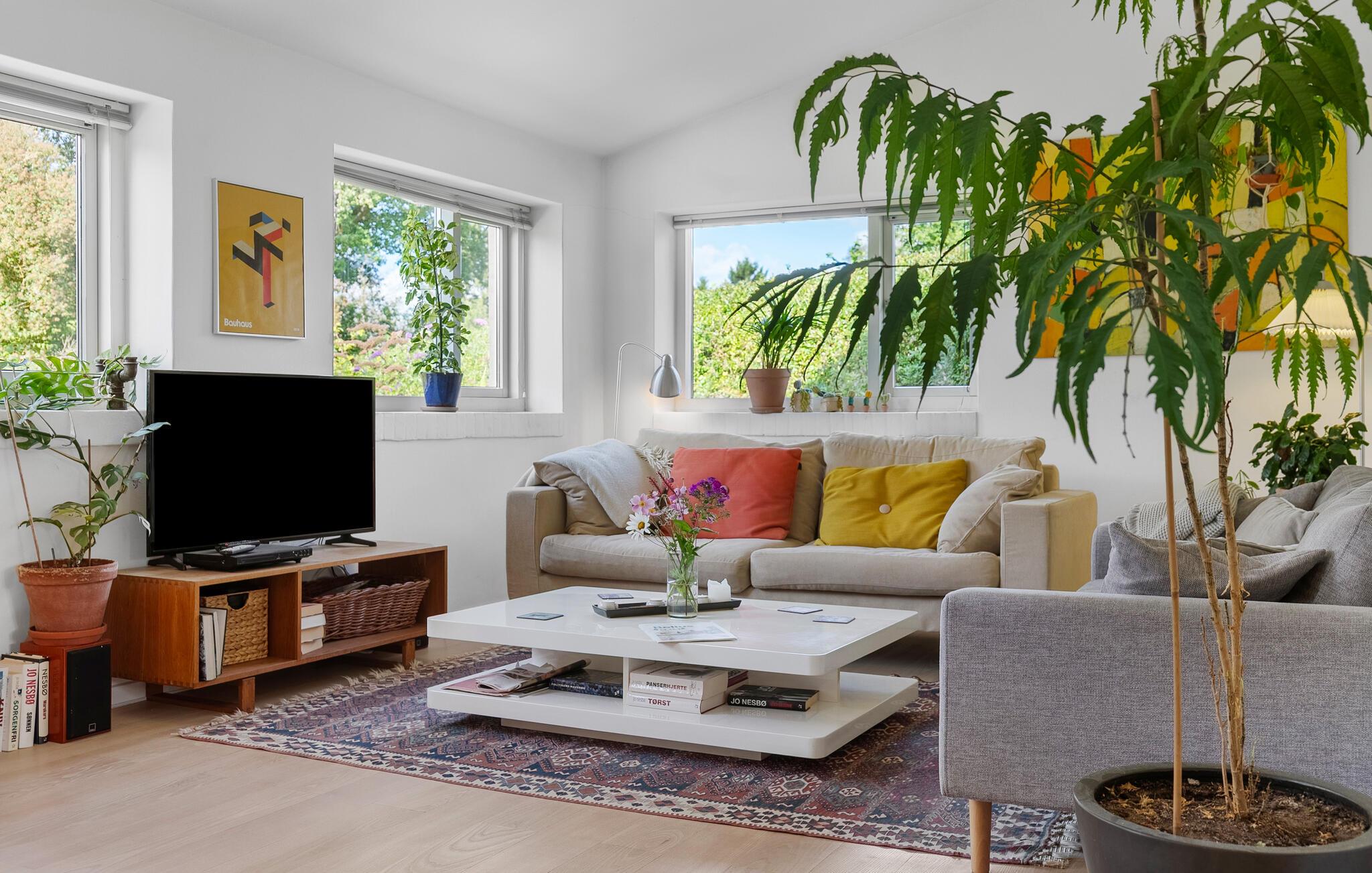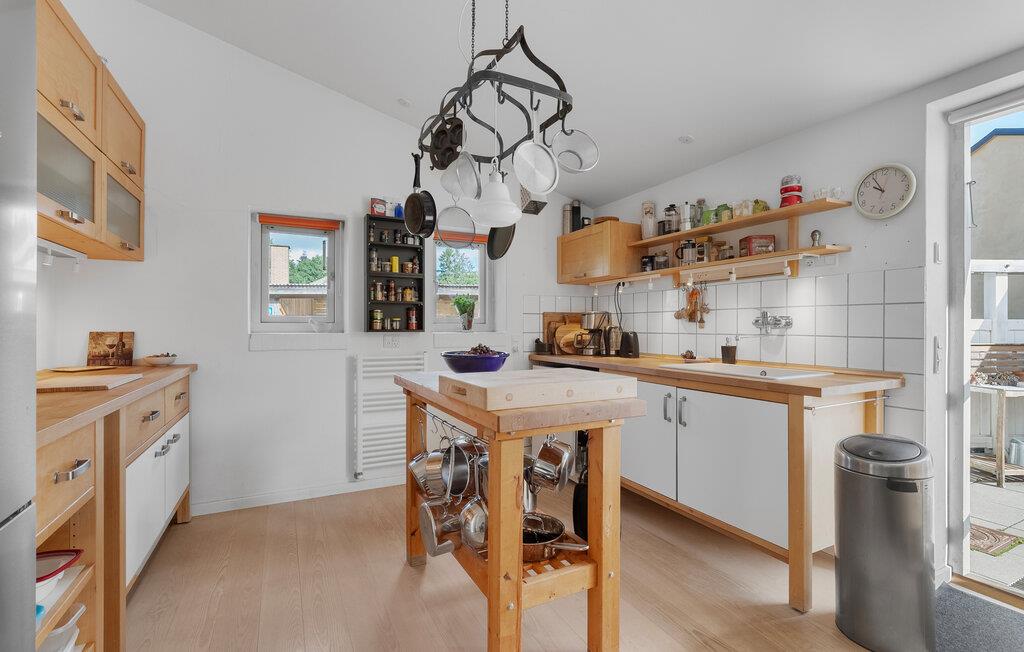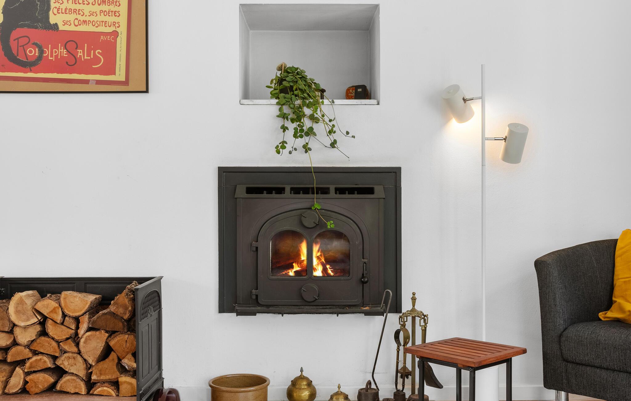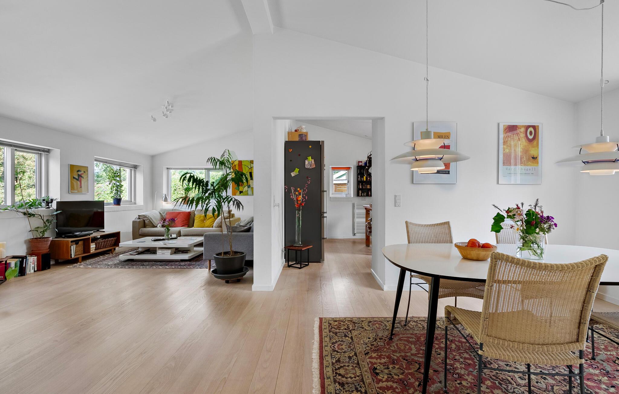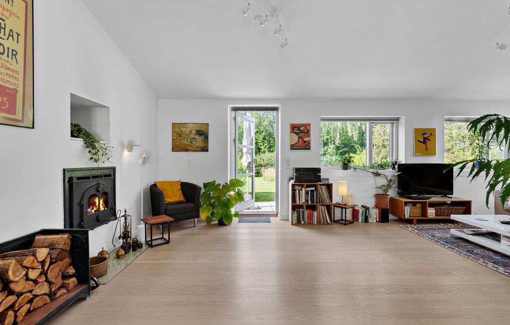 I den lyse opholdsstue skaber den lyse og smagfulde indretning en venlig atmosfære. Hyg jer sammen i den komfortable sofa, læs en god bog, eller afslut dagen med et glas vin ved brændeovnen. Spiseområdet byder på god plads til fælles måltider, mens køkkenet med den rummelige bordplads indbyder til madlavning sammen.
