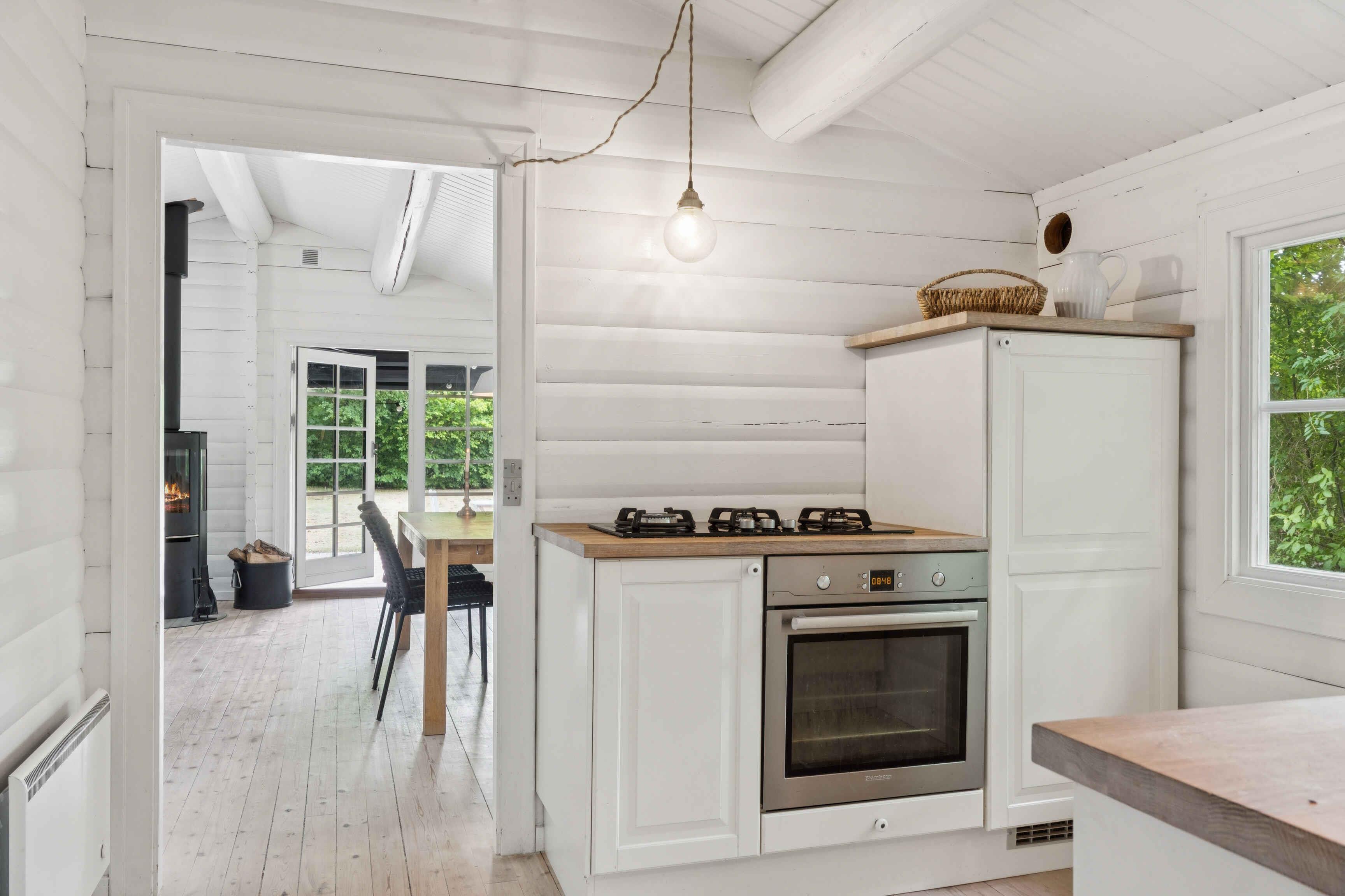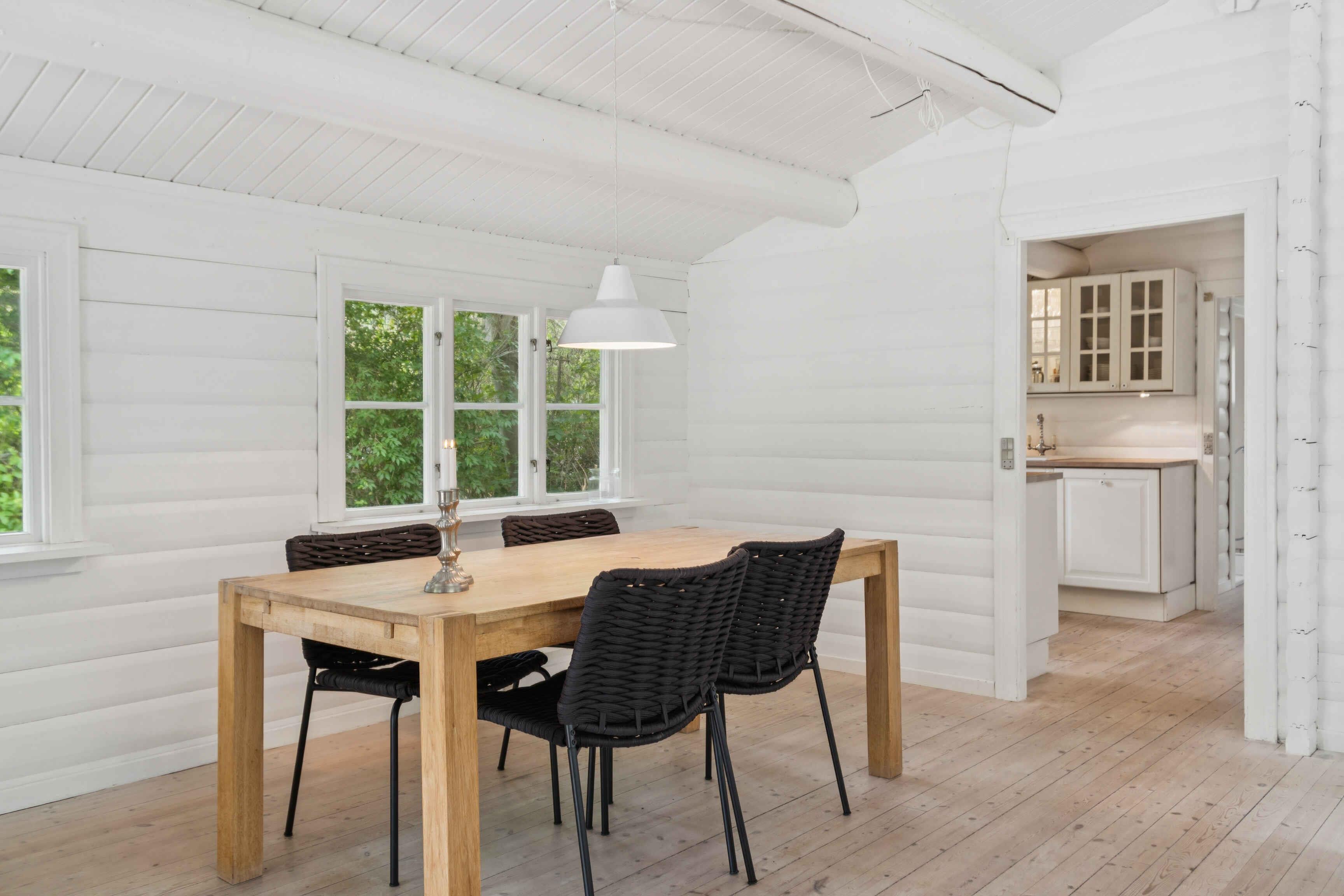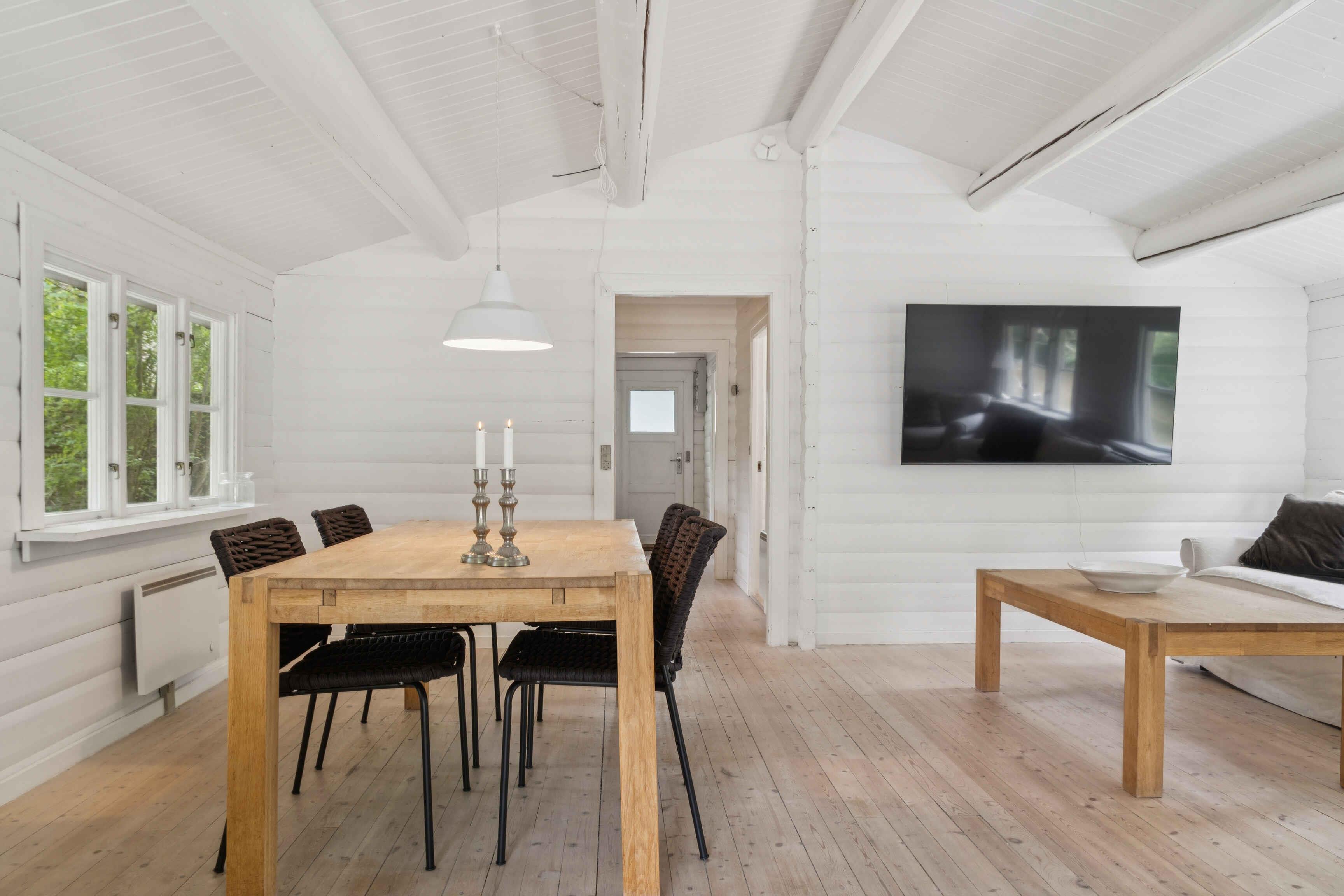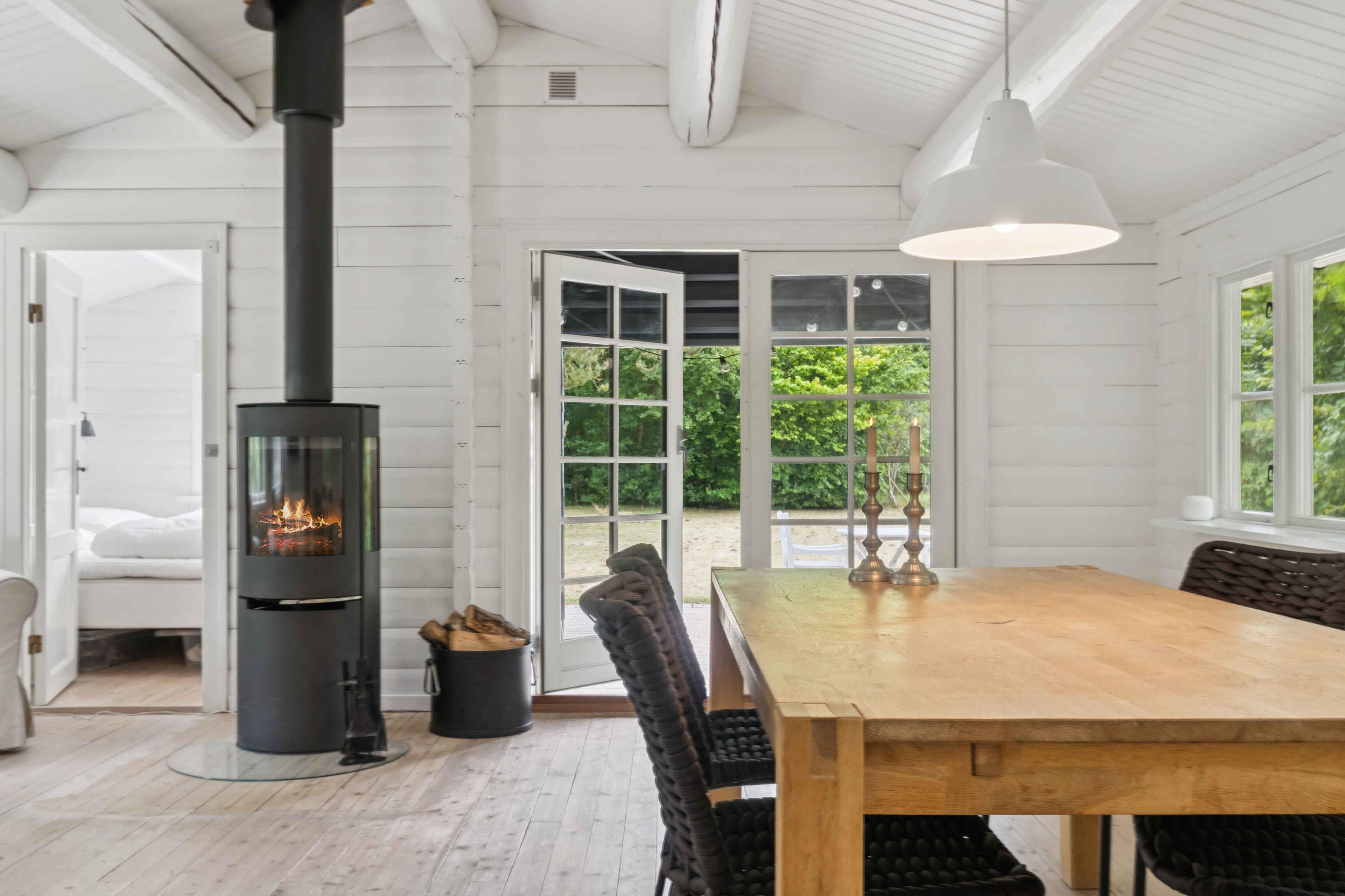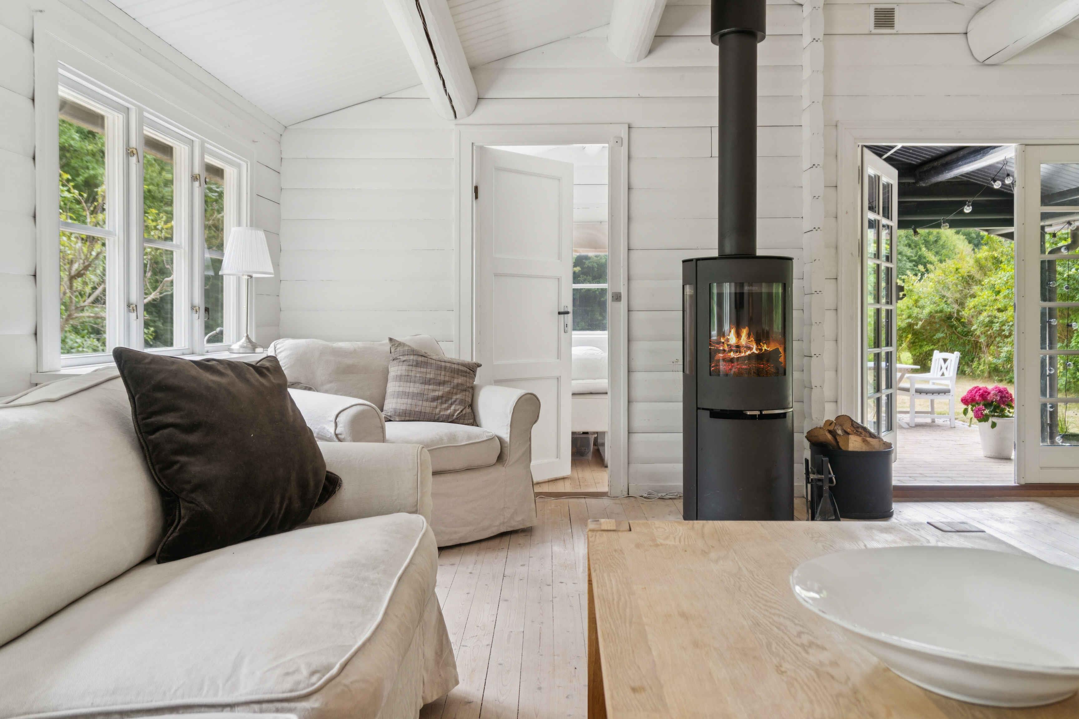 Dette sommerhus er et charmerende sort bjælketræhus med hvide vinduer, beliggende på en rolig grund med direkte udsigt til naturskov. Huset er 69 m² og indrettet med omtanke, så du kan nyde ferien i afslappede og hjemlige rammer – året rundt. Indenfor finder du tre gode soveværelser og i alt fem sovepladser. Det åbne køkken og det pæne, hvide badeværelse er begge velholdte. Stuen har både en hyggelig spiseplads og en hørsofagruppe foran en 65" fladskærm og en nyere brændeovn med glaslåger. En stor, sydvendt terrasse indbyder til måltider i det fri og udsigt til naturen. Haven er hyggelig og rummelig med frugttræer, bålplads og en stor græsplæne, hvor børn og voksne kan lege og slappe af i fredelige omgivelser. Området er særligt attraktivt for dig, der søger ro, nærhed til natur og strand. Kun 150 meter fra huset finder du en meget privat badestrand, næsten udelukkende brugt af vejens beboere. Her kan du nyde morgenbadning, solnedgange eller bare en tur i vandet uden trængsel og støj. Dronningmølle og nærområdet byder på alt fra hyggelige caféer og gallerier til naturskønne cykel- og vandreruter. I nærheden ligger også Tegners Museum og Rusland, samt Hornbæk og Gilleleje med fiskerihavn, butikker og stemningsfulde spisesteder. Alt er tæt på, men stadig langt fra hverdagens støj.