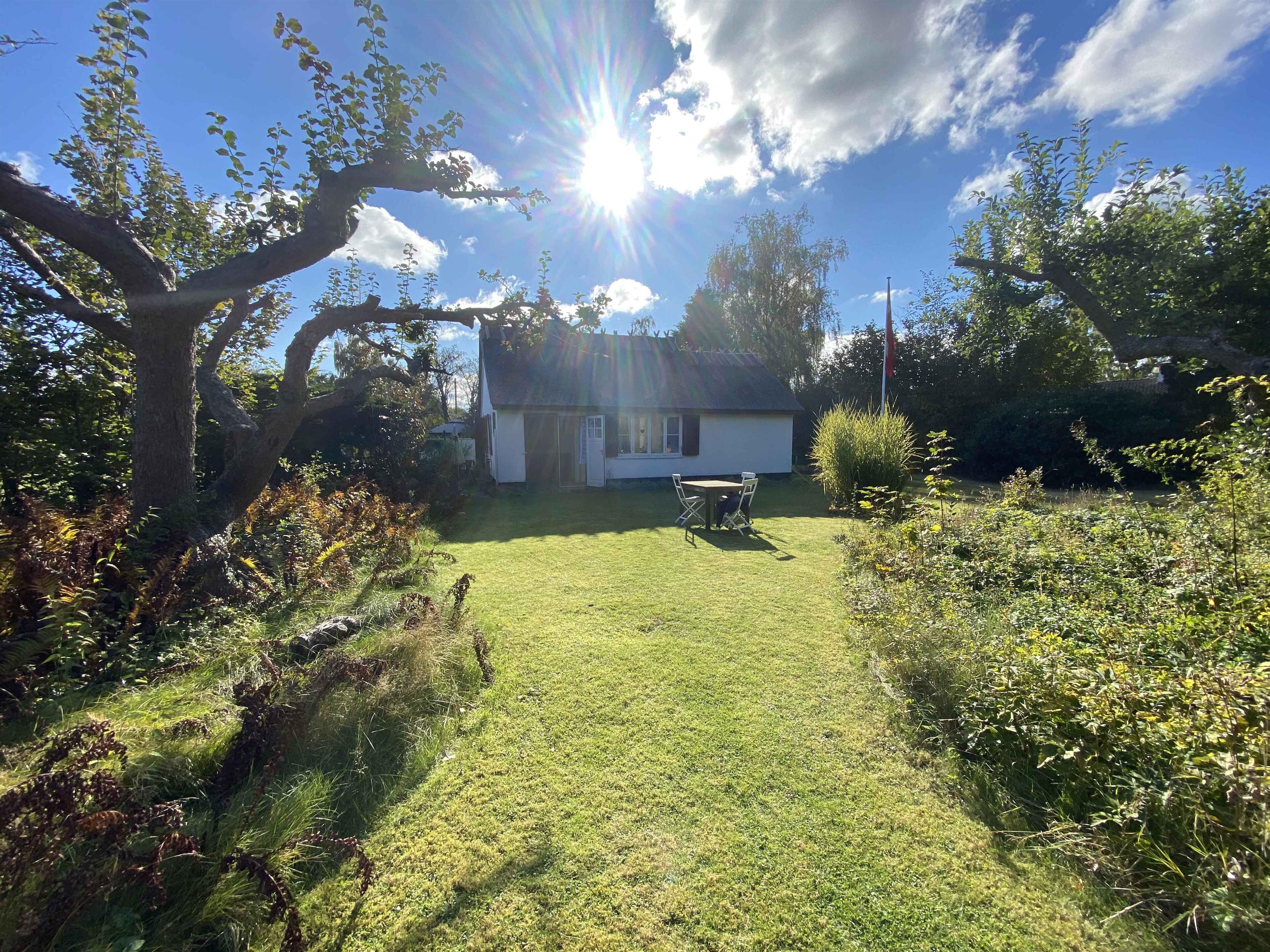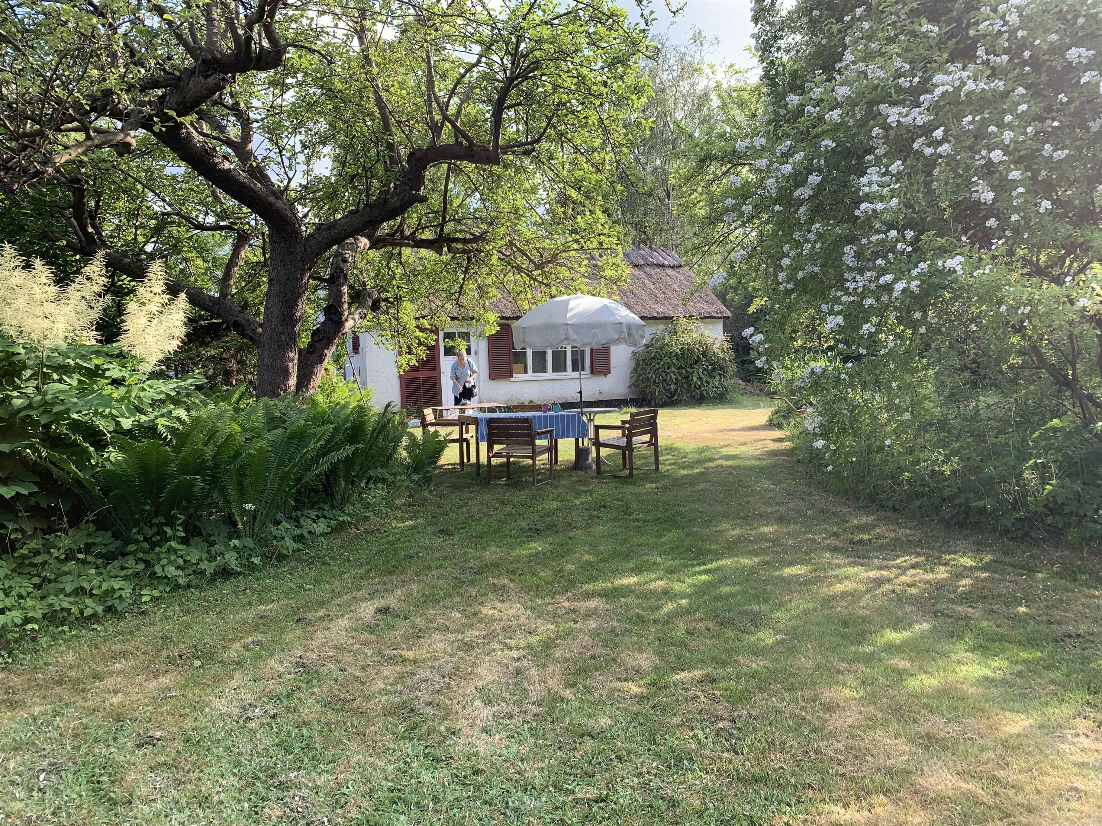Sommeridyl i Dronningmølle nær en af Nordsjællands mest børnevenlige sandstrande, tæt på centrum, indkøb og station. stråtækt lille hus på55m2 beliggende på ugenert grund, omgivet af den gamle have, der som huset, er fra 1947.