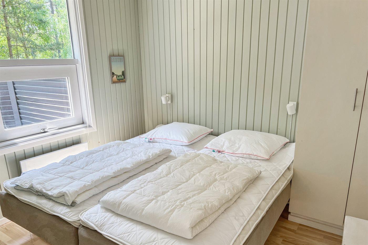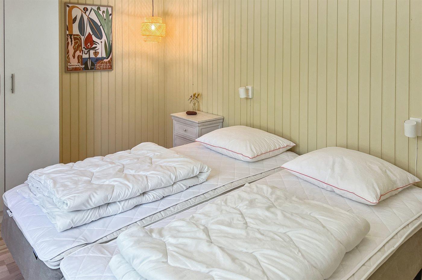 Huset er meget velegnet til to familier, da dets sovepladser er fordelt i to afdelinger med to soverum og et badeværelse i hver sin ende af huset. Sovepladserne i de 4 soveværelser fordeler sig med 4 sovepladser i 2 dobbeltsenge, 2 sovepladser i enkeltsenge og 2 sovepladser i udtræksseng (med tykke madrasser). Soverummene er malet i lækre, lyse, rolige farver, som bidrager til den hyggelige sommerhusstemning.