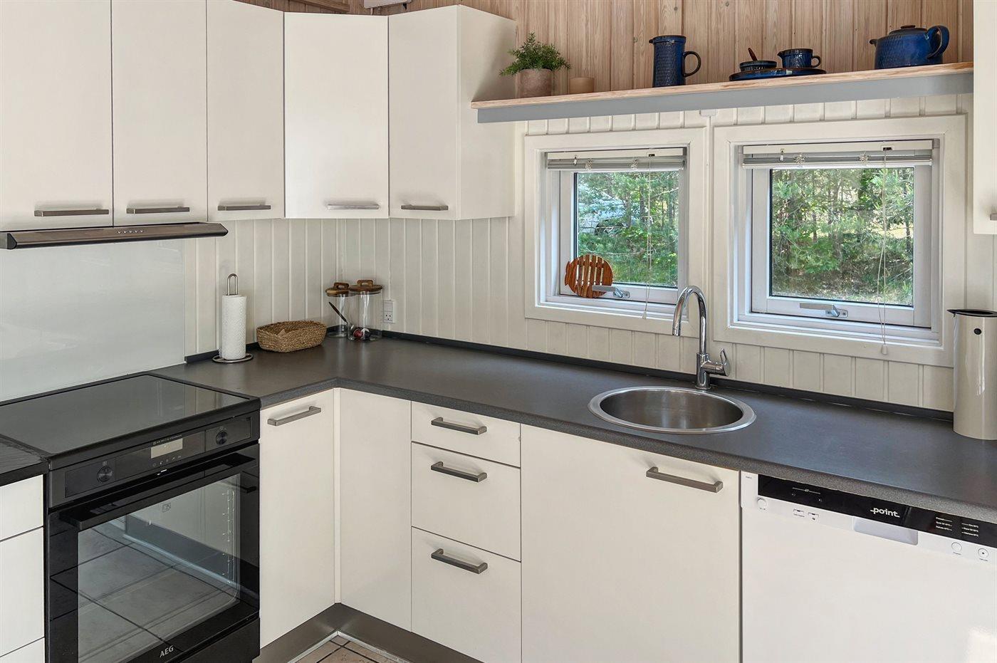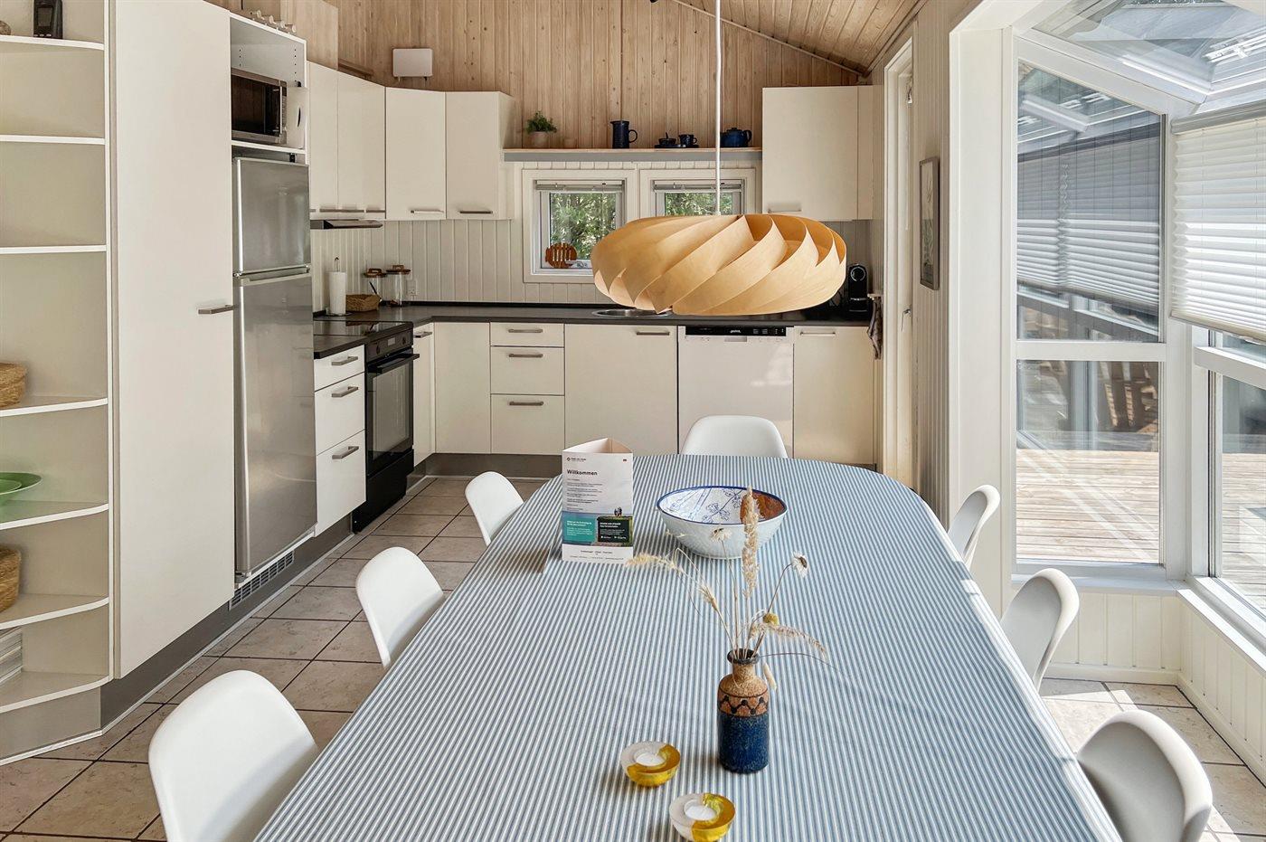 Indvendig er huset flot indrettet med et dejligt køkken med bl.a. varmluftovn, mikrobølgeovn, nespresso og almindelig kaffemaskine, opvaskemaskine og komfur med induktionskogeplader og varmluftsovn samt køleskab med fryser.