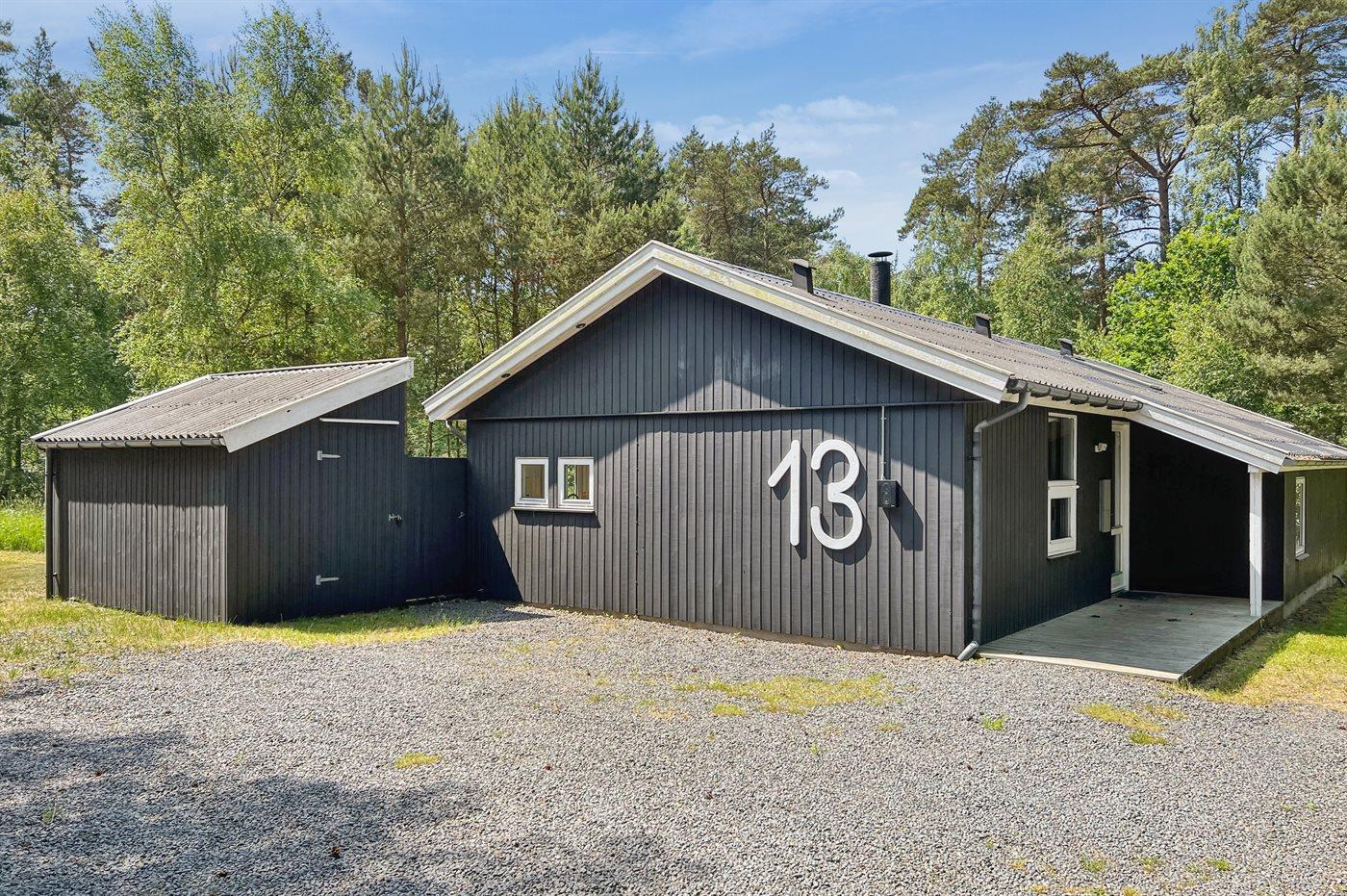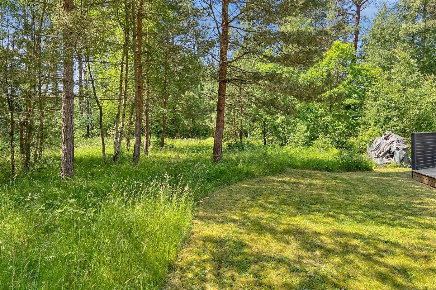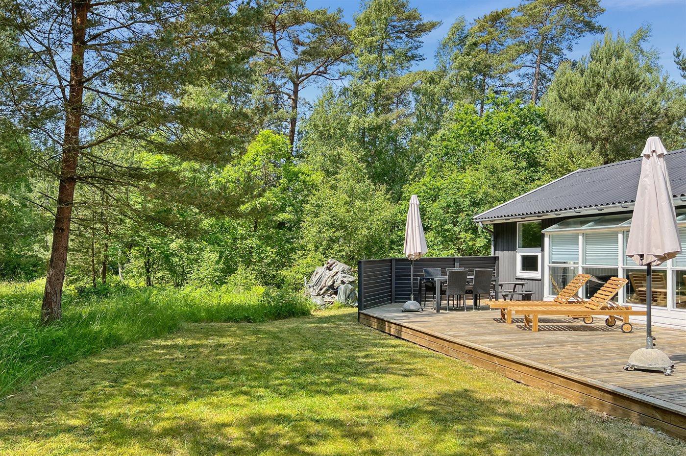 Flot rummeligt sommerhus i træ - beliggende på en stor naturgrund, der er omkranset af skov, tæt på de hvide sandstrande ved Dueodde. Huset ligger ugeneret for enden af en blind vej i rolige omgivelser, kun 500 m fra vandet.