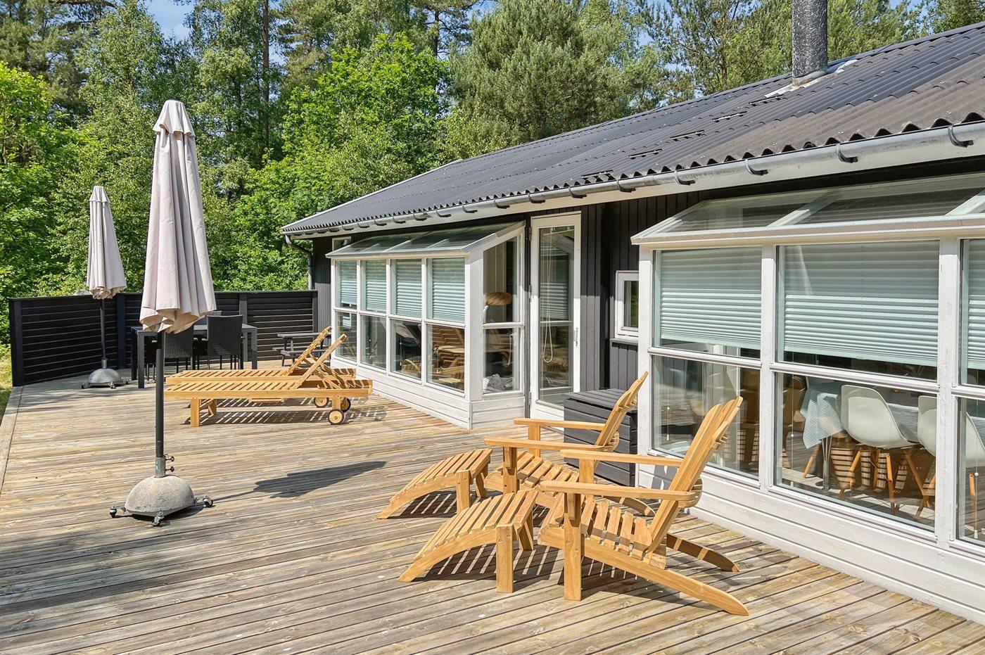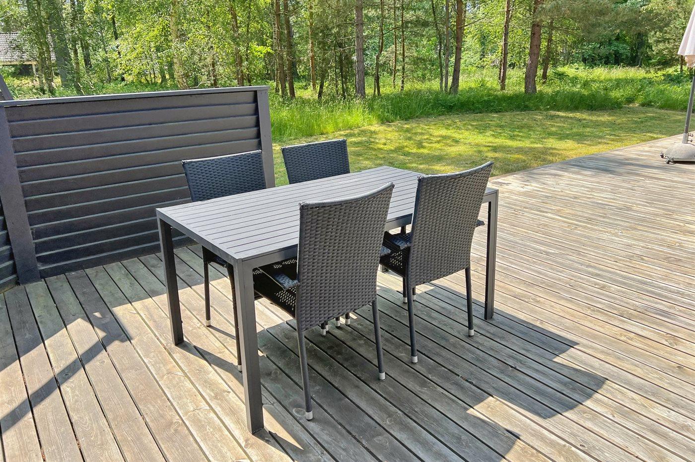 Foran huset er der en meget stor og delvist afskærmet terrasse med havemøbler og solsenge og rig mulighed for solbadning eller hygge ved spisebordene på terrassen.