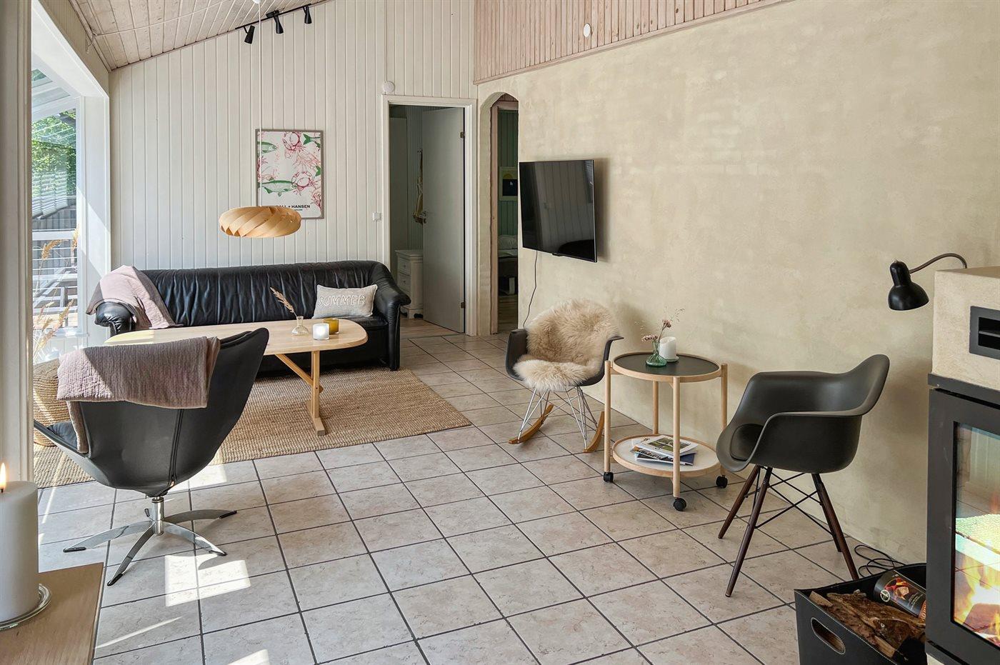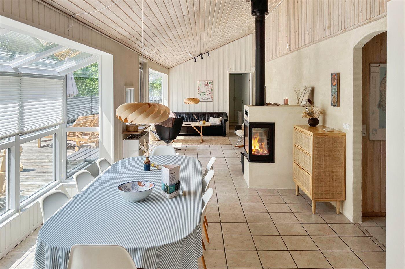 Køkkenet ligger i åben forbindelse til spiseafdelingen og den dejlige, store opholdsstue / rum med sofa-miljø og hyggelig brændeovn. Her findes også TV (Google-TV hvor der er installeret chromecast) samt en Sonos højttaler. Der er direkte udgang til den dejlige terrasse fra både køkken og stue.