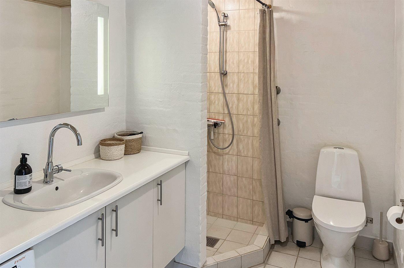 I huset er der 2 dejlige store badeværelser med bruseniche og toilet. Der er gulvvarme i begge badeværelser. Det ene er endvidere indrettet med 2-pers. spa og direkte adgang til saunaen og det andet er udstyret med vaskemaskine/ tørretumbler.