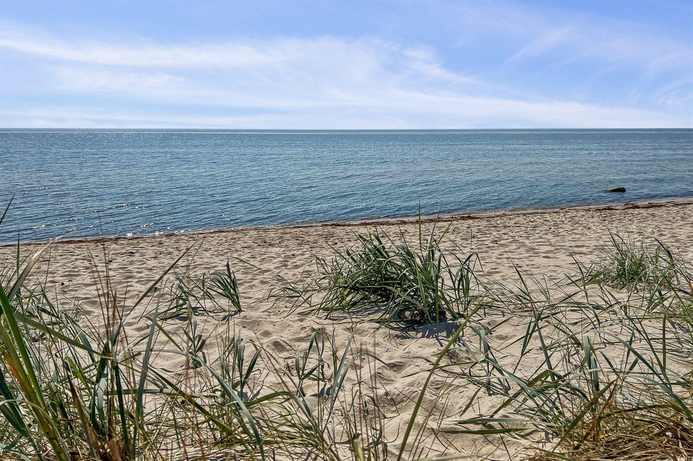 Flot sommerhus i træ nær Dueoddes hvide sandstrande med stor terrasse og sauna.
