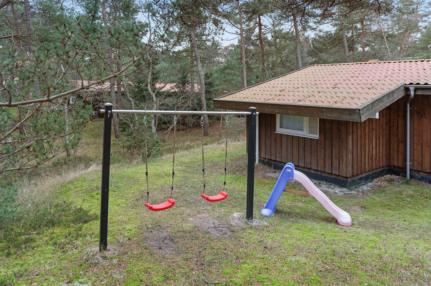 Ferieboligen er beliggende på en 2500 m² stor naturgrund. Der er 1000 m til havet. Nærmeste forretning er beliggende i en afstand af 200 m. Til ferieboligen hører 50 m² terrasseareal. Desuden er der 17 m² overdækket terrasse. Der er redskabsrum. Gynge. Der er carport til rådighed. Parkering ved ferieboligen.