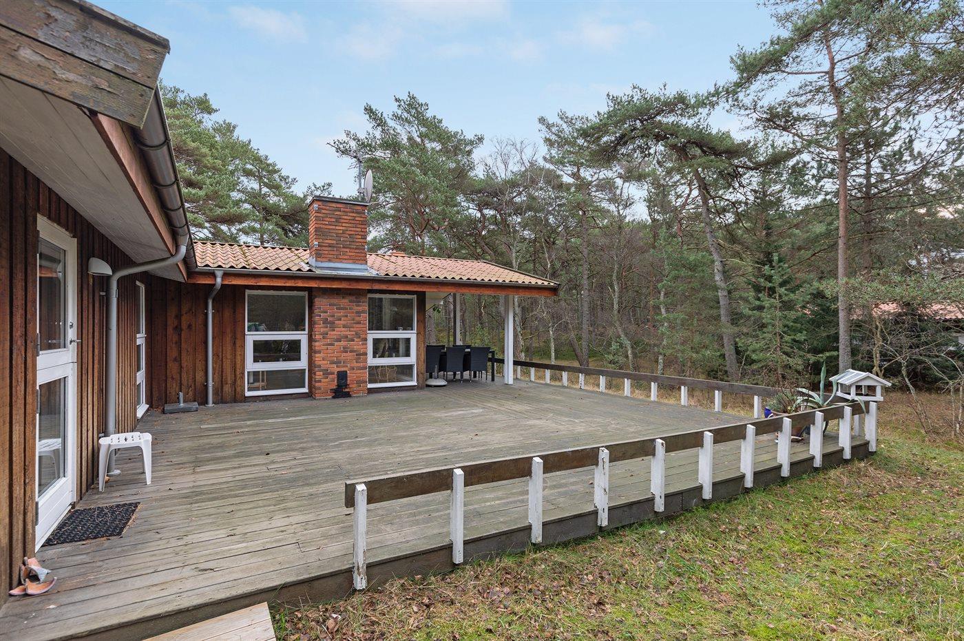 Husets store terrasse giver direkte indblik i naturgrunden, der er let bevokset af både fyrretræer og birketræer.