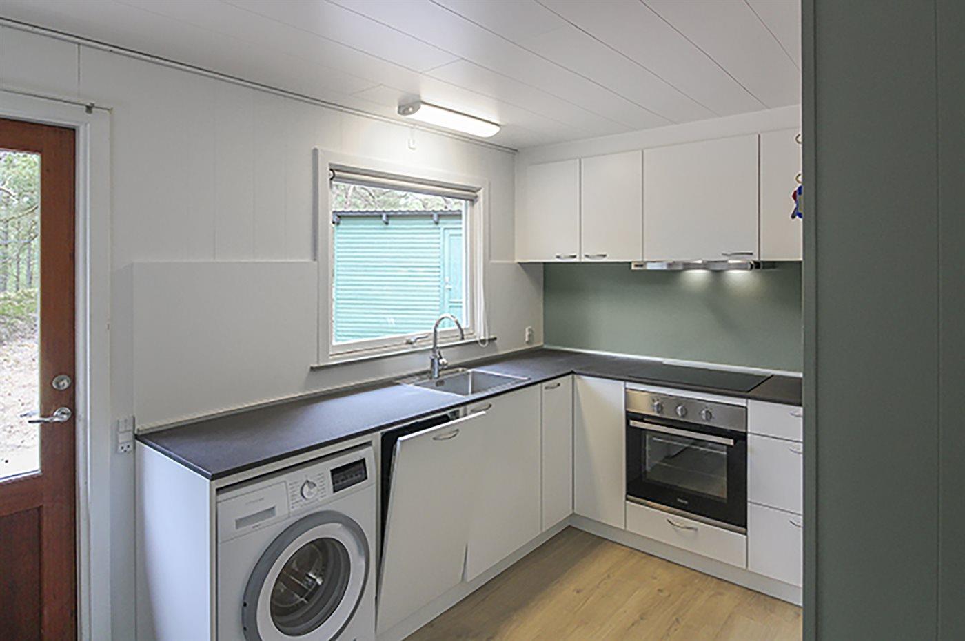 Køkkenet er udstyret med 1 køleskab. Der er 4 keramiske kogeplader, varmluftovn, mikrobølgeovn samt opvaskemaskine.
