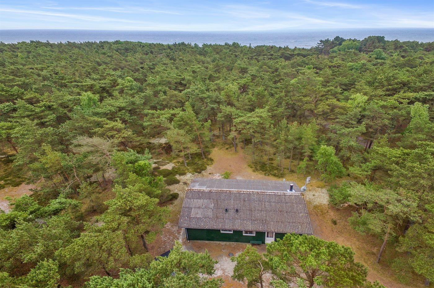Ferieboligen er beliggende på en 2500 m² stor grund i skov/plantage. naturgrund. Der er 300 m til havet. Nærmeste forretning er beliggende i en afstand af 4000 m. Til ferieboligen hører 20 m² terrasseareal. Desuden er der 10 m² overdækket terrasse. Der er redskabsrum. Gynge. Sandkasse. Parkering ved ferieboligen.