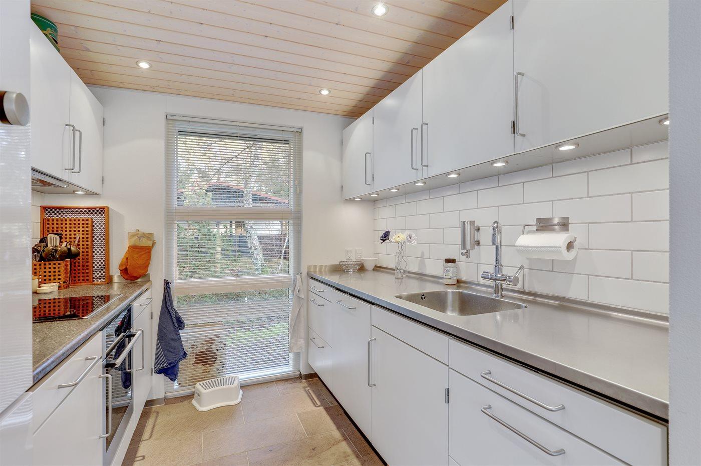 Køkkenet er udstyret med 1 køleskab. Der er 4 induktionskogeplader, varmluftovn samt opvaskemaskine.