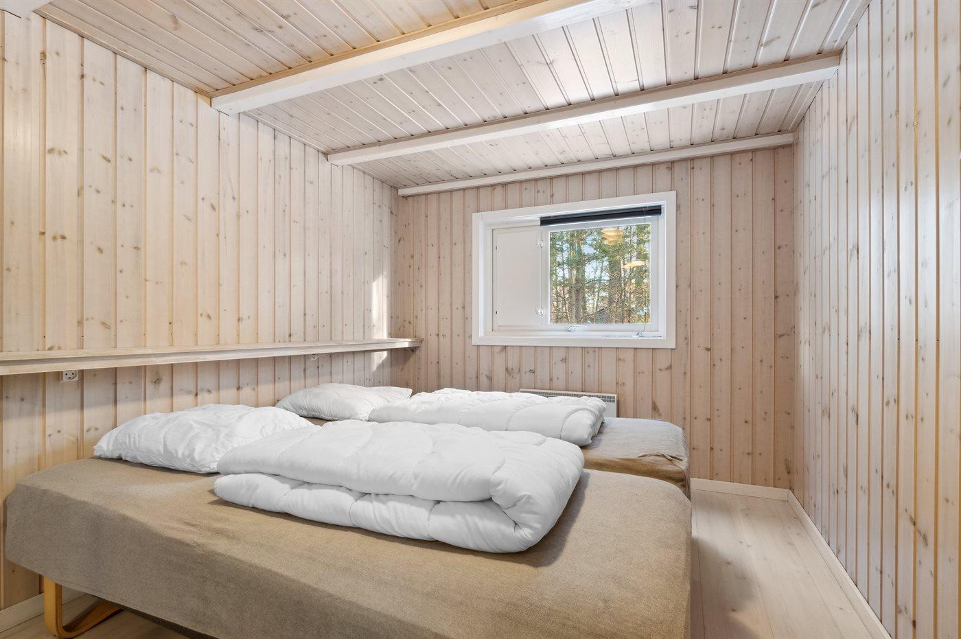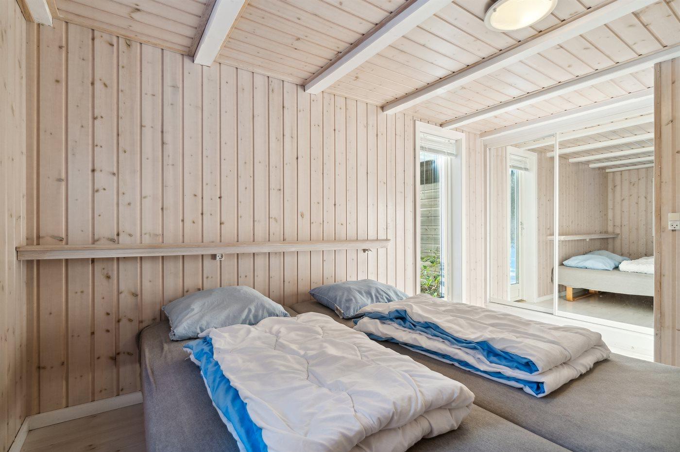 Der er i alt 3 soveværelser. Sovepladserne fordeler sig på: 4 sovepladser i dobbeltsenge. 2 sovepladser i enkeltsenge. 2 sovepladser på madrasser. 2 af disse sovepladser befinder sig på husets hems.