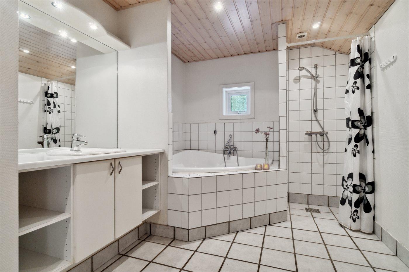 Der er 2 badeværelser med bruseniche og 2 toiletter. Der er gulvvarme på 2 badeværelser. I saunaen er der mulighed for afslapning.