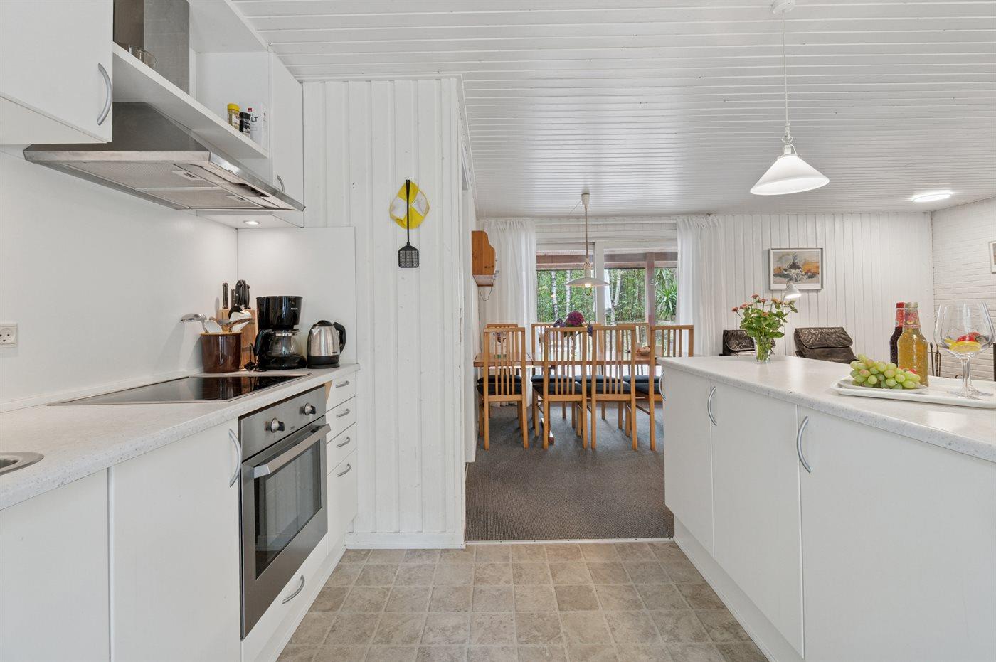 Køkkenet er udstyret med 1 køleskab. Der er 4 keramiske kogeplader, varmluftovn, mikrobølgeovn samt opvaskemaskine.