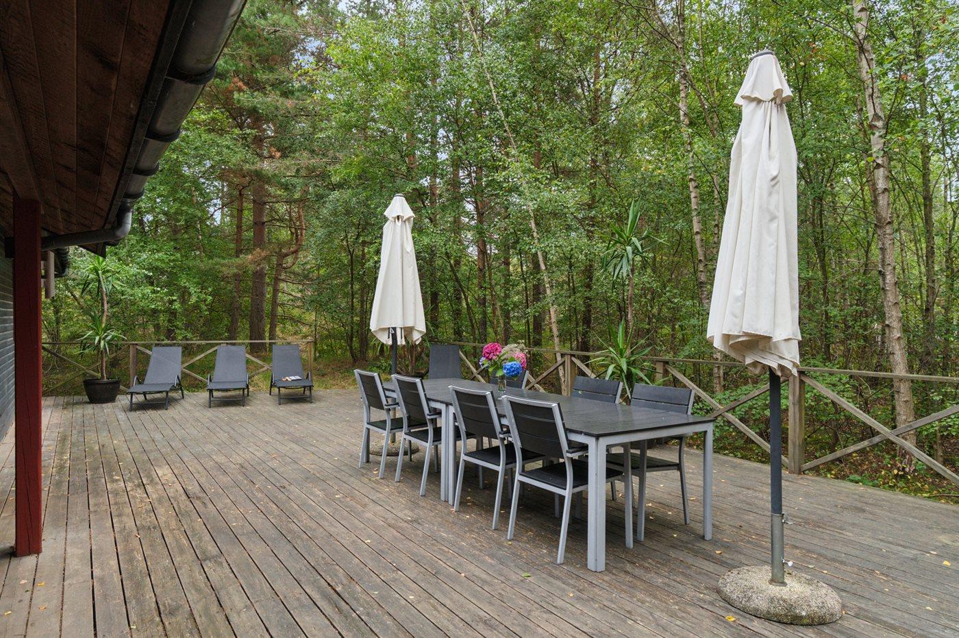 300 meter fra Dueoddes aktive centrum finder man dette blåmalede hus, som er omgivet af store træterrasser. Huset er beliggende ugenert på en meget stor og flot naturgrund med blandet fyrre- og birketræsbevoksning - sammen med to nabohuse.