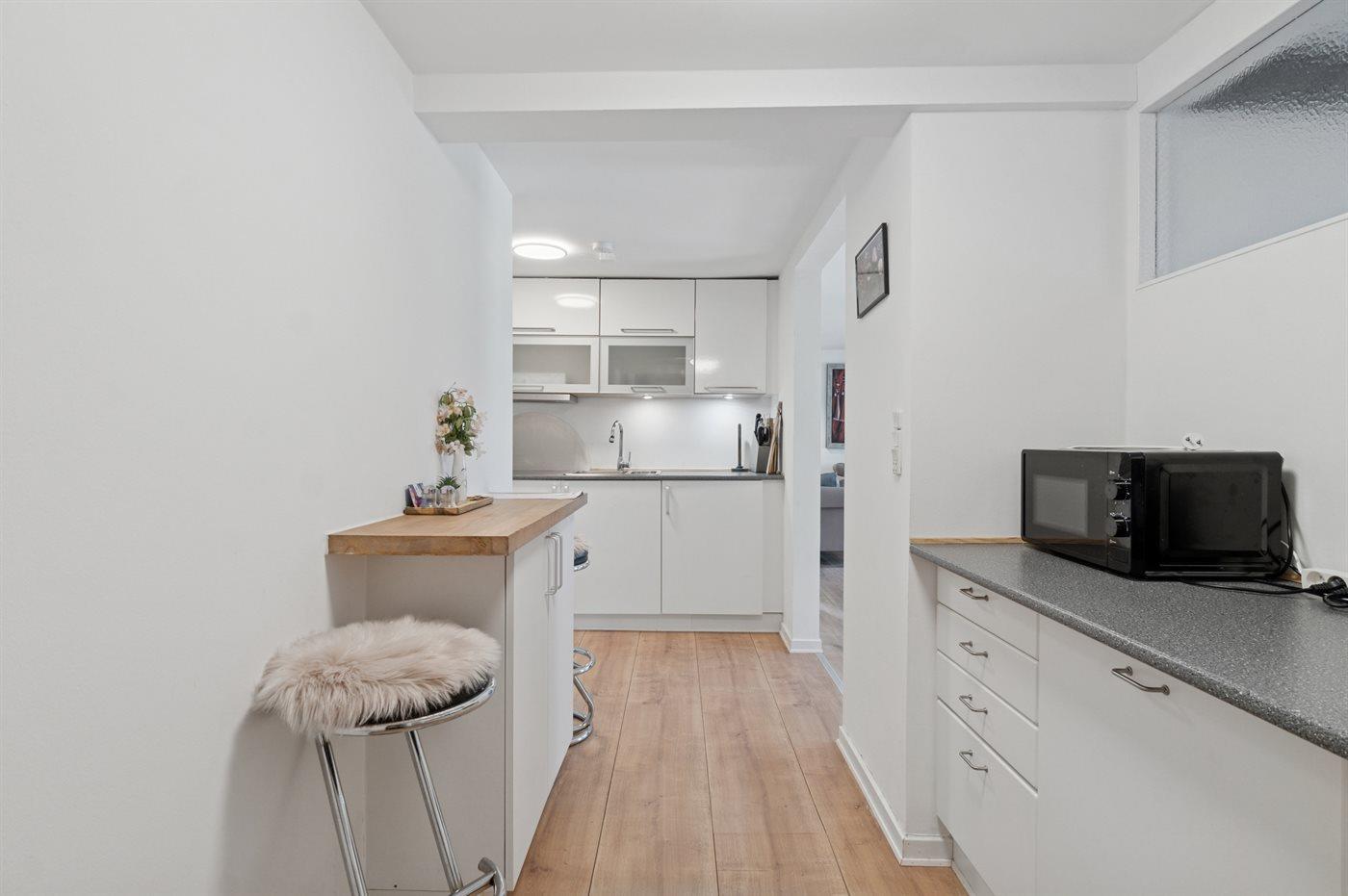 Køkkenet er udstyret med 2 køleskabe. Der er 4 induktionskogeplader, varmluftovn, mikrobølgeovn samt opvaskemaskine.