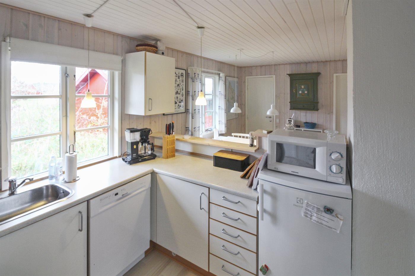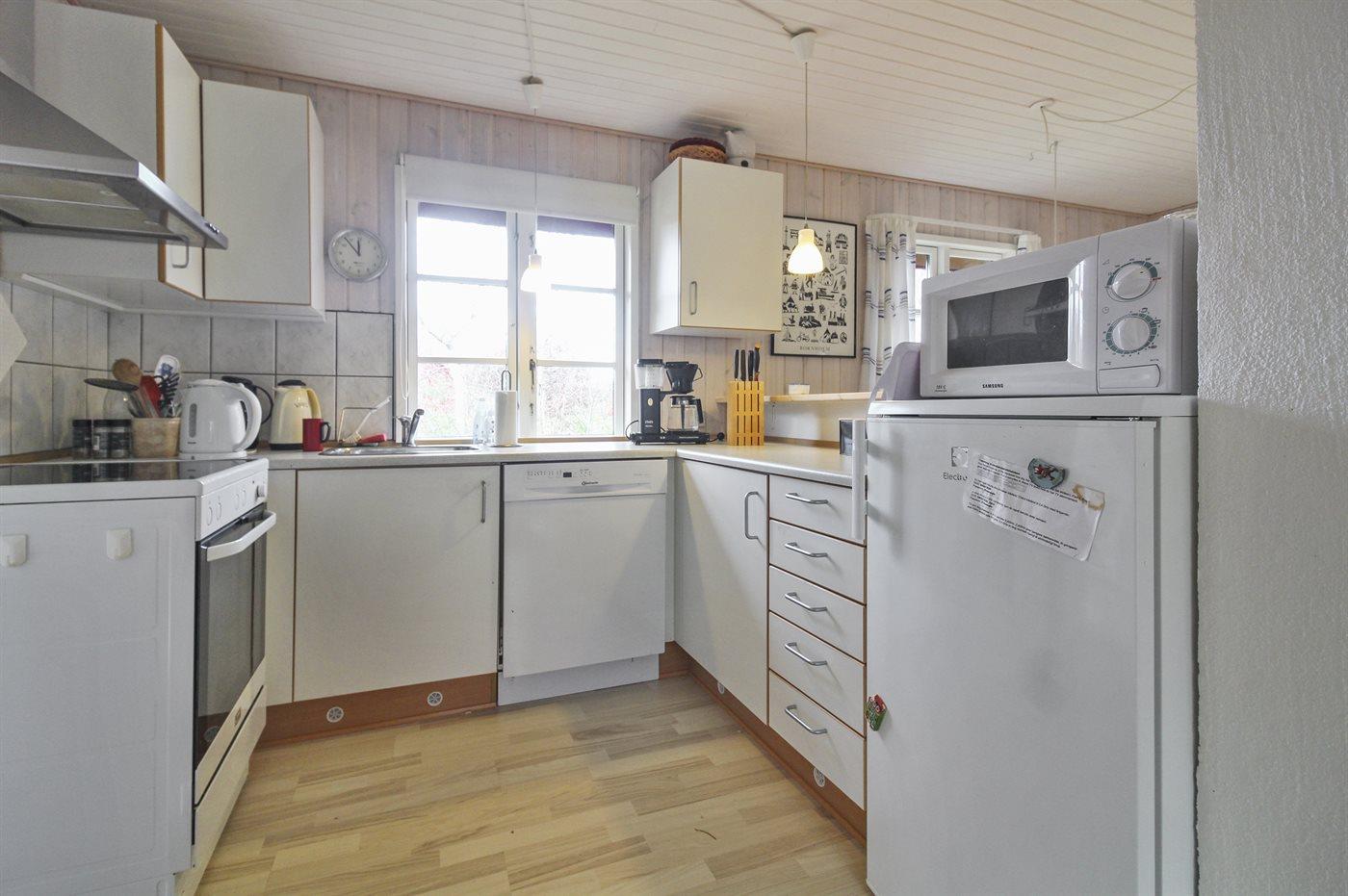 Køkkenet er udstyret med 1 køleskab. Der er 4 induktionskogeplader, varmluftovn, mikrobølgeovn samt opvaskemaskine.