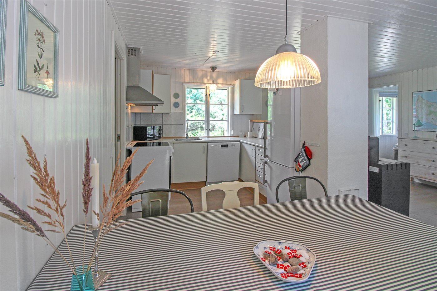 Køkkenet er udstyret med 1 køleskab. Der er 4 elkogeplader, bageovn, varmluftovn, mikrobølgeovn samt opvaskemaskine.