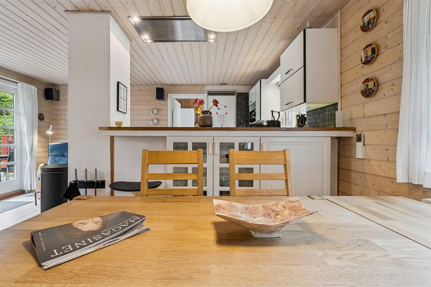 Køkkenet er udstyret med 1 køleskab. Der er 4 induktionskogeplader, varmluftovn, mikrobølgeovn samt opvaskemaskine.