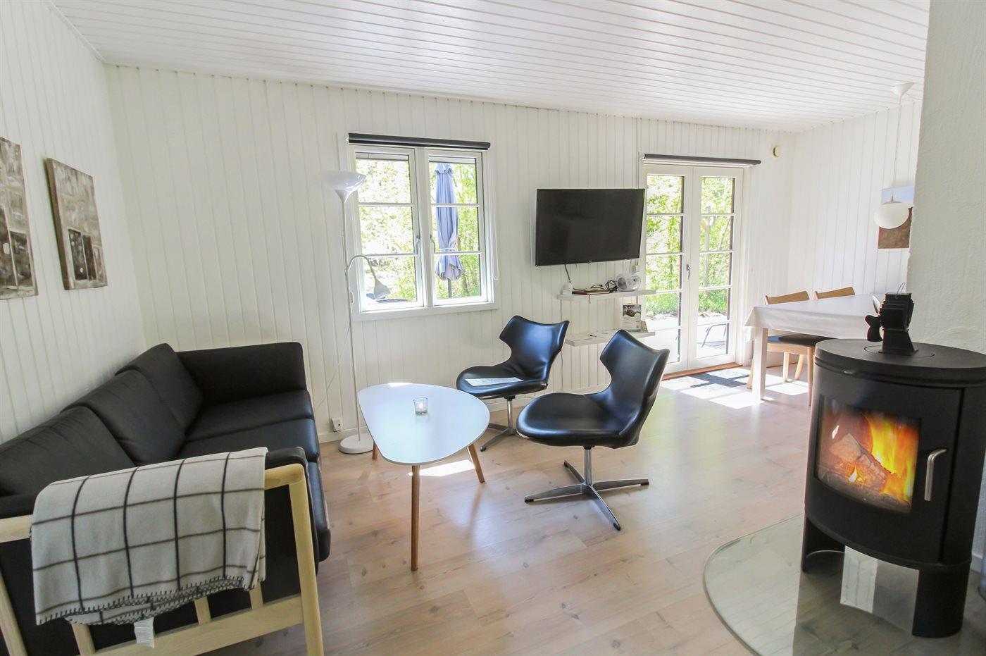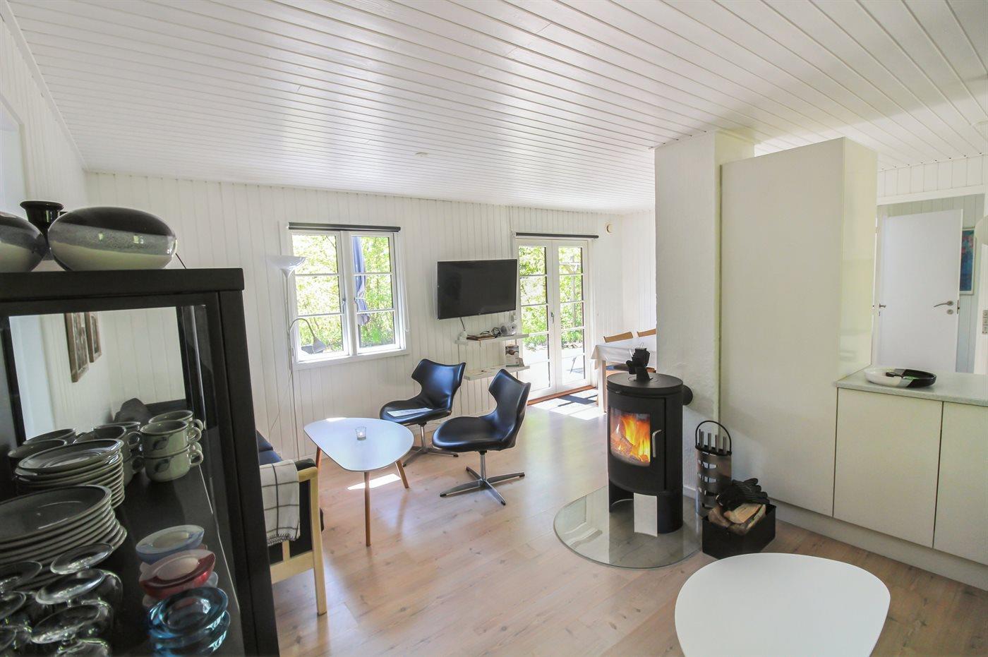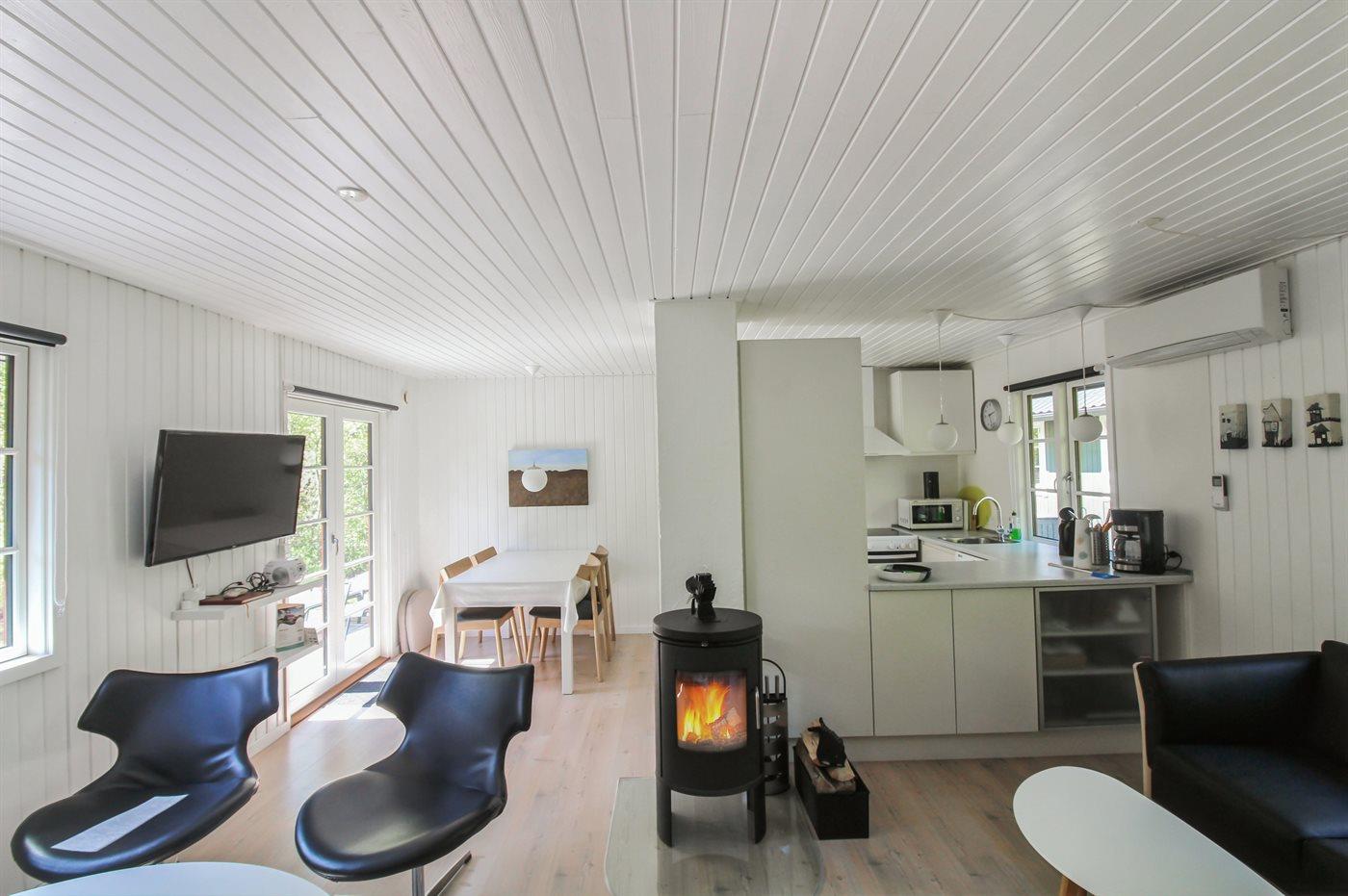 Tæt på den pragtfulde, brede sandstrand med perfekte bade- og vandsportsmuligheder ligger dette dejlige sommerhus i træ, bygget i 1973, totalrenoveret i 1991 og i 2015 er der lagt lyse trægulve i stue og på værelserne. Vægge og lofter i opholdsstuen er malet med hvidpigmenteret maling i meget lyse farver. Ligeledes er døre og vinduer blevet malet. Badeværelse med gulvvarme, bruseniche og klinkegulv. Moderne indrettet køkken (2016) med bl.a. mikrobølgeovn, lille fryser og opvaskemaskine. Hyggelig opholdsstue med brændeovn, TV, DVD-afspiller og stereoanlæg med CD-afspiller. Fra stuen er der udgang til åben terrasse med havemøbler. Til de mindste feriegæster er der barneseng til rådighed.