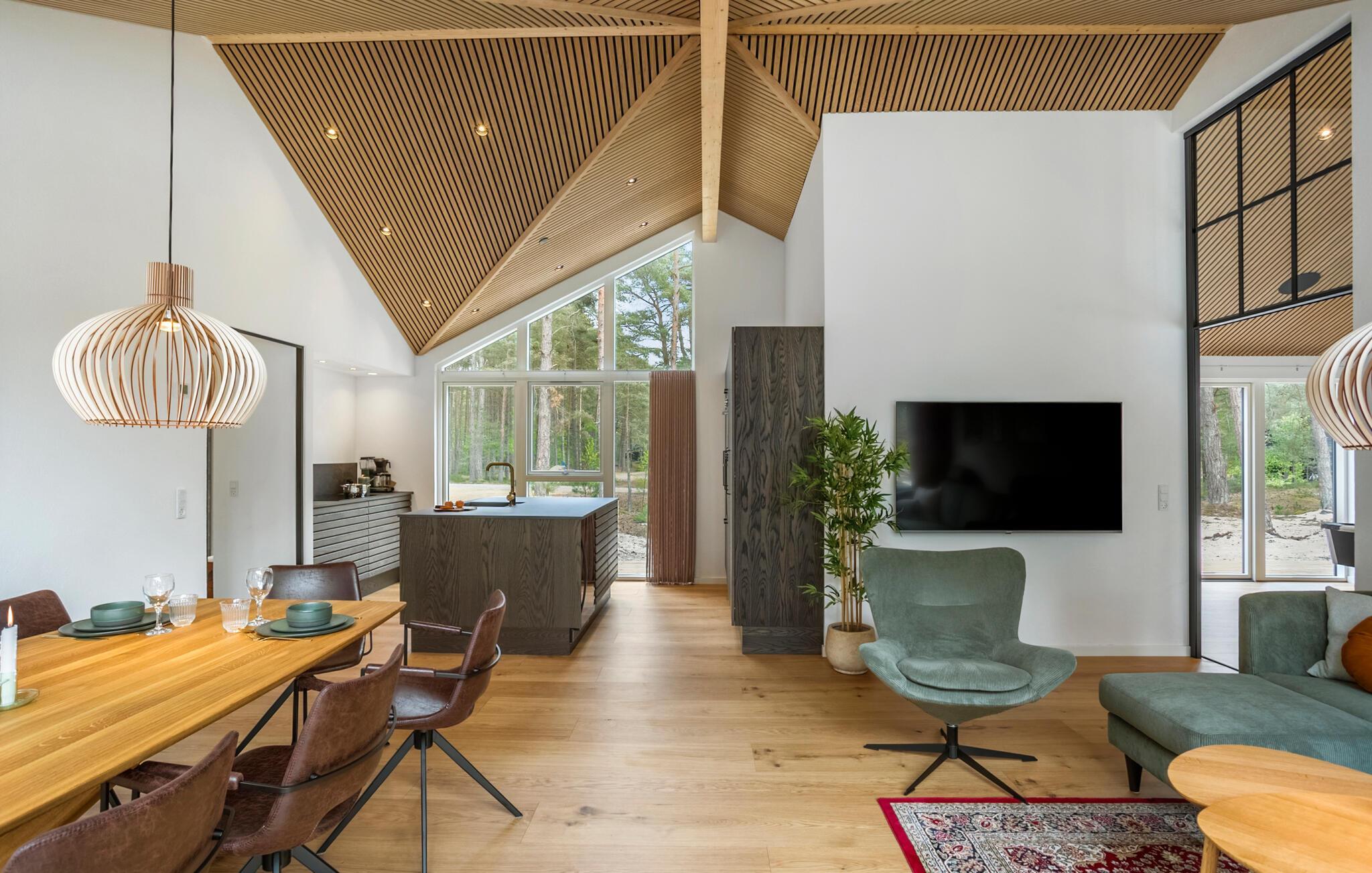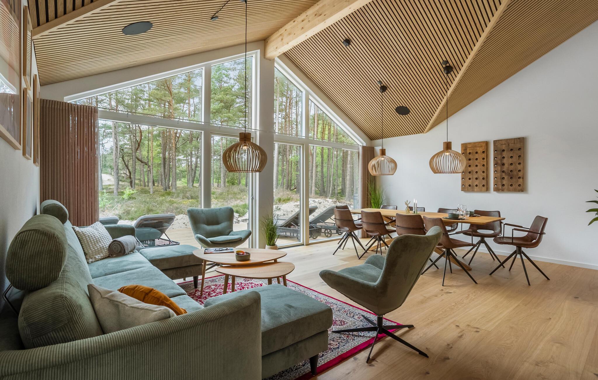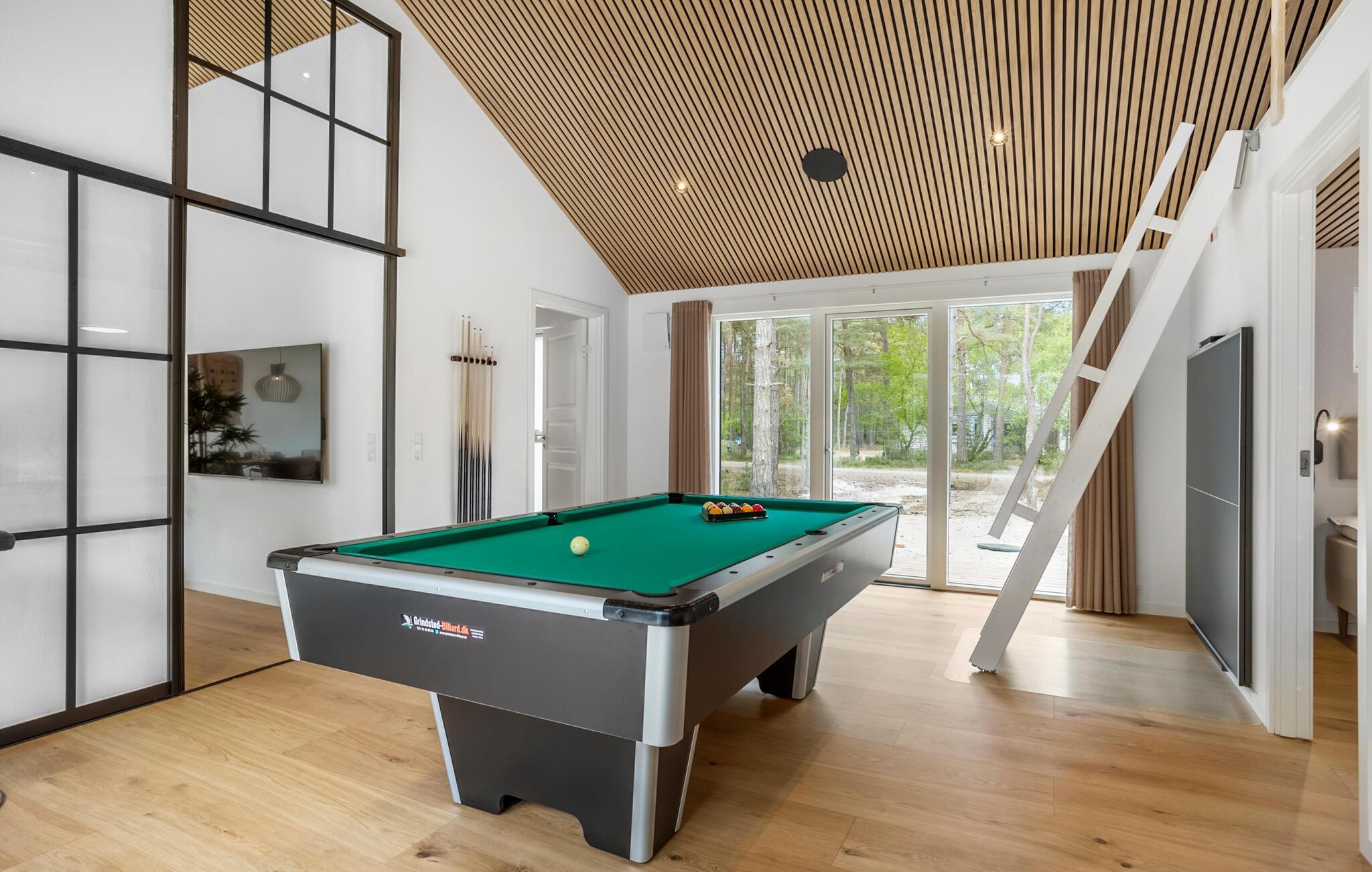 Beliggende på en idyllisk naturgrund og beskyttet mod udsigt af høje træer, kan I nyde privatliv, adskillige ekstrafunktioner og den højeste grad af komfort i dette stilfulde feriehus. Spil billard, bordtennis eller dart, forkæl jer selv med afslappende øjeblikke i saunaen, nyd jeres måltider med udsigt over de grønne områder, og slap af efter en aktiv dag med en filmaften eller et brætspil i den store, komfortable stue.