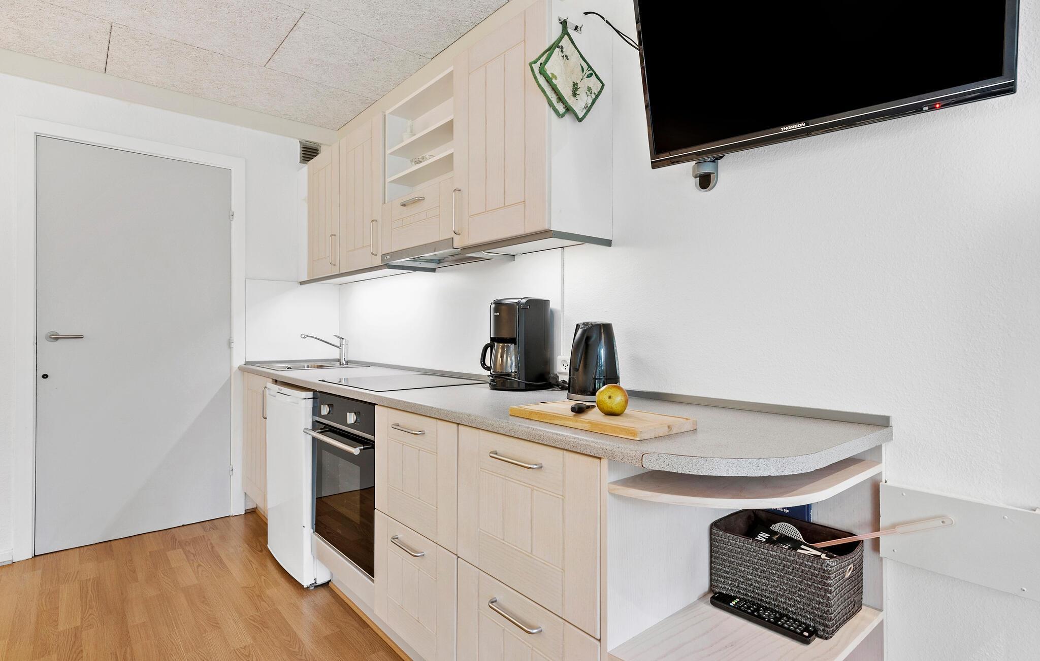 Denne lyse og hyggelige bolig giver jer det ideelle sted til en rolig pause fra hverdagen. Begynd dagen med morgenmad på terrassen, omgivet af frisk luft og smuk natur. Efter en aktiv dag kan I slappe af i den åbne opholdsstue. Gør det behageligt for jer i sofaen eller lænestolene og genoplev dagens oplevelser i fred og ro. I det veludstyrede køkken kan I tilberede jeres livretter, som I kan nyde enten ved spisebordet eller ude på terrassen.