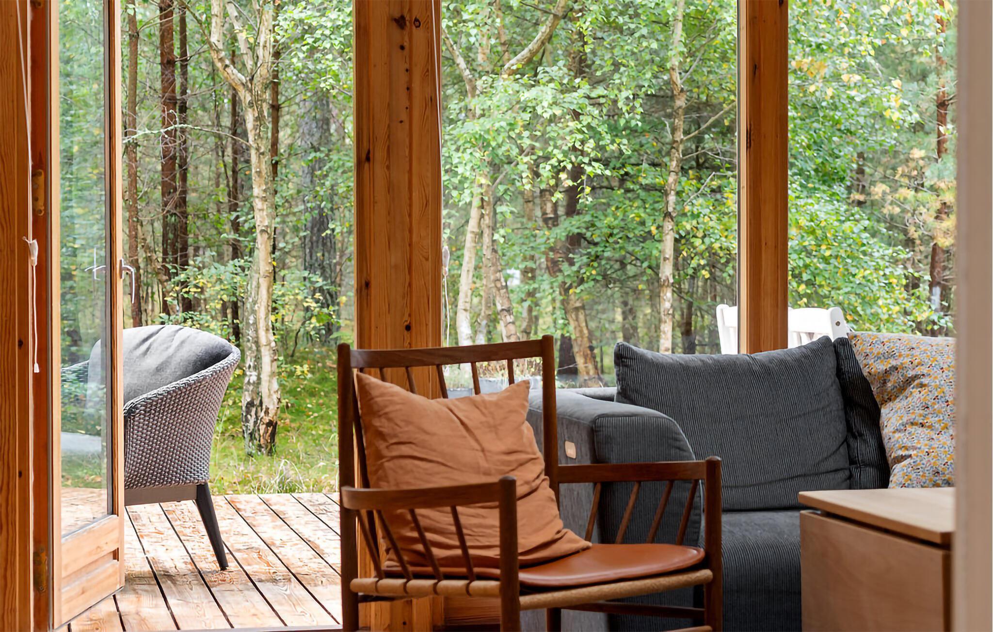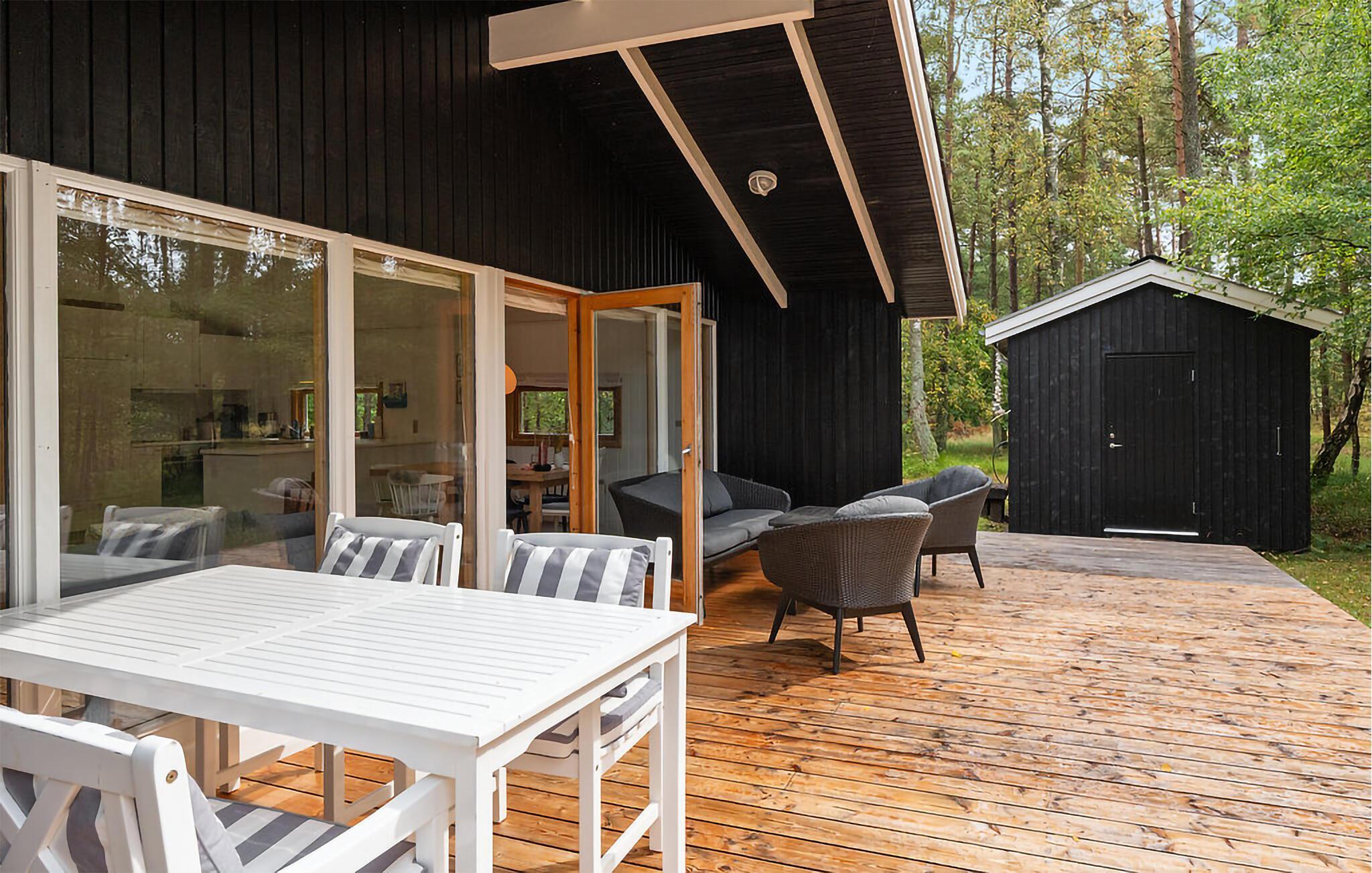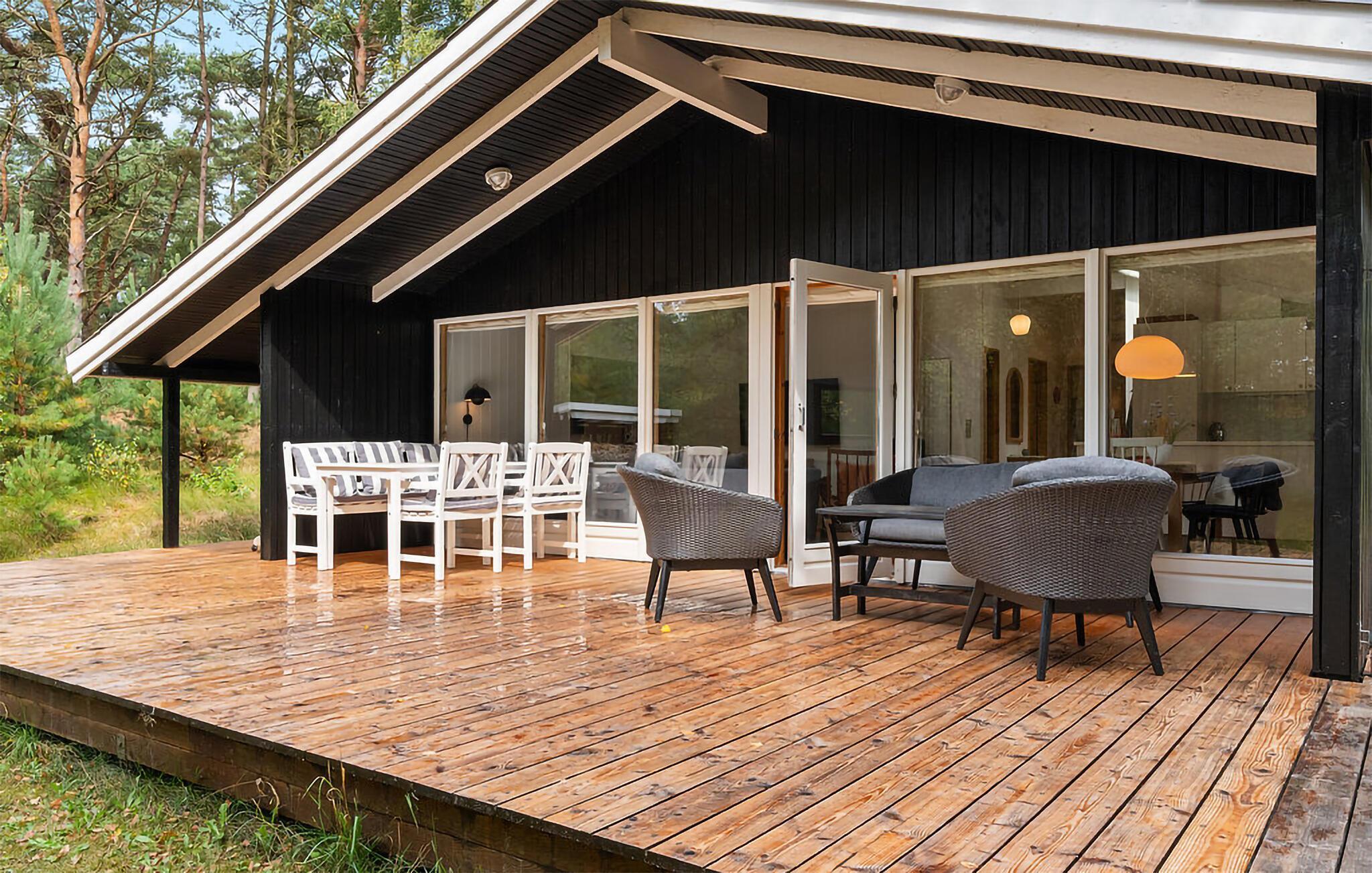 Træd ud på den store træterrasse og nyd jeres fritid i den friske luft. Spis morgenmad udendørs, læs i en lænestol eller lyt til vinden i træerne. Huset er omgivet af naturgrunde, der tilbyder masser af privatliv. Her kan I grille, spille spil eller blot nyde freden og roen.
