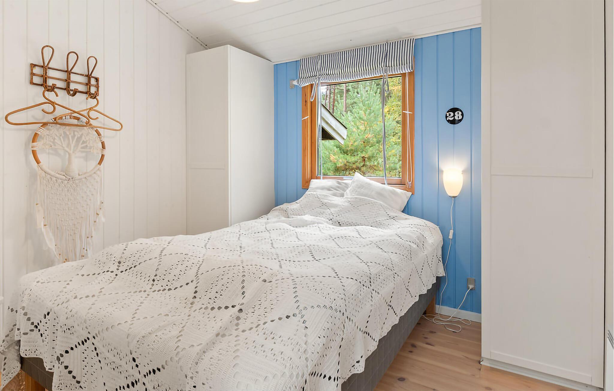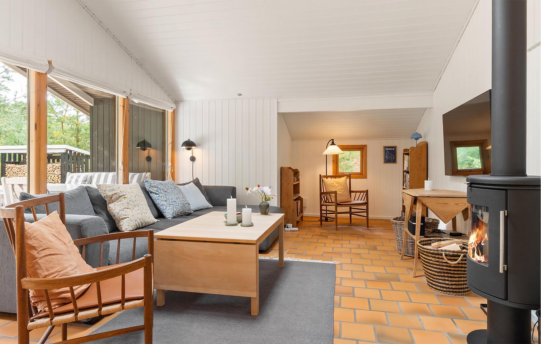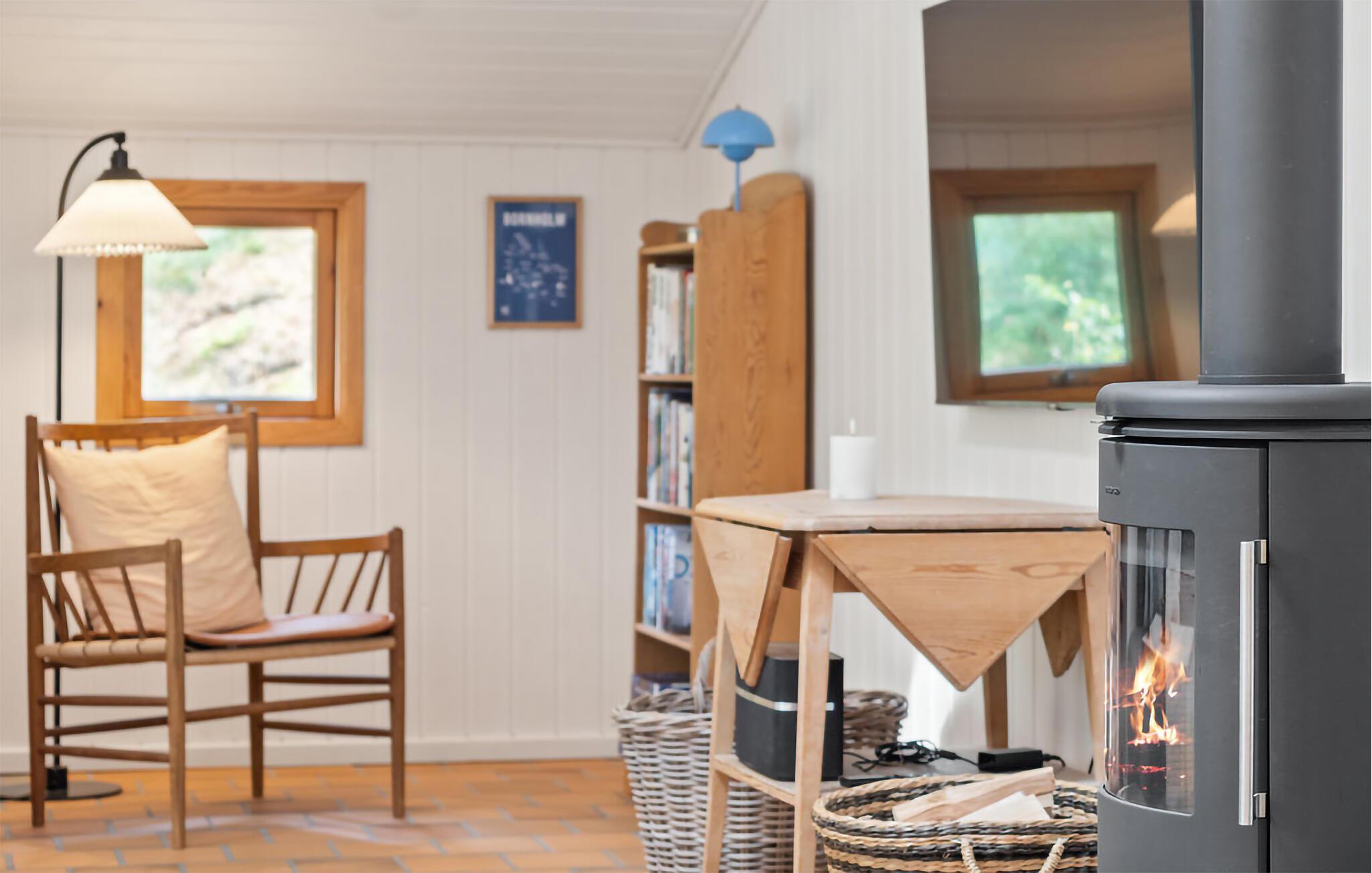 Glæd jer til afslappende dage i et stilfuldt feriehus omgivet af natur, der samtidig byder på komfort og hygge. Indenfor finder I et lyst, åbent opholdsrum med smukke møbler og store vinduer med udsigt over det grønne. Find jer til rette i sofaen og nyd gløden fra brændeovnen. Køkkenet tilbyder masser af arbejdsplads, så I nemt kan tilberede måltider. Spisebordet giver plads til, at familie og venner kan samles om aftenen. Efter en aktiv dag tilbyder saunaen beroligende afslapning.