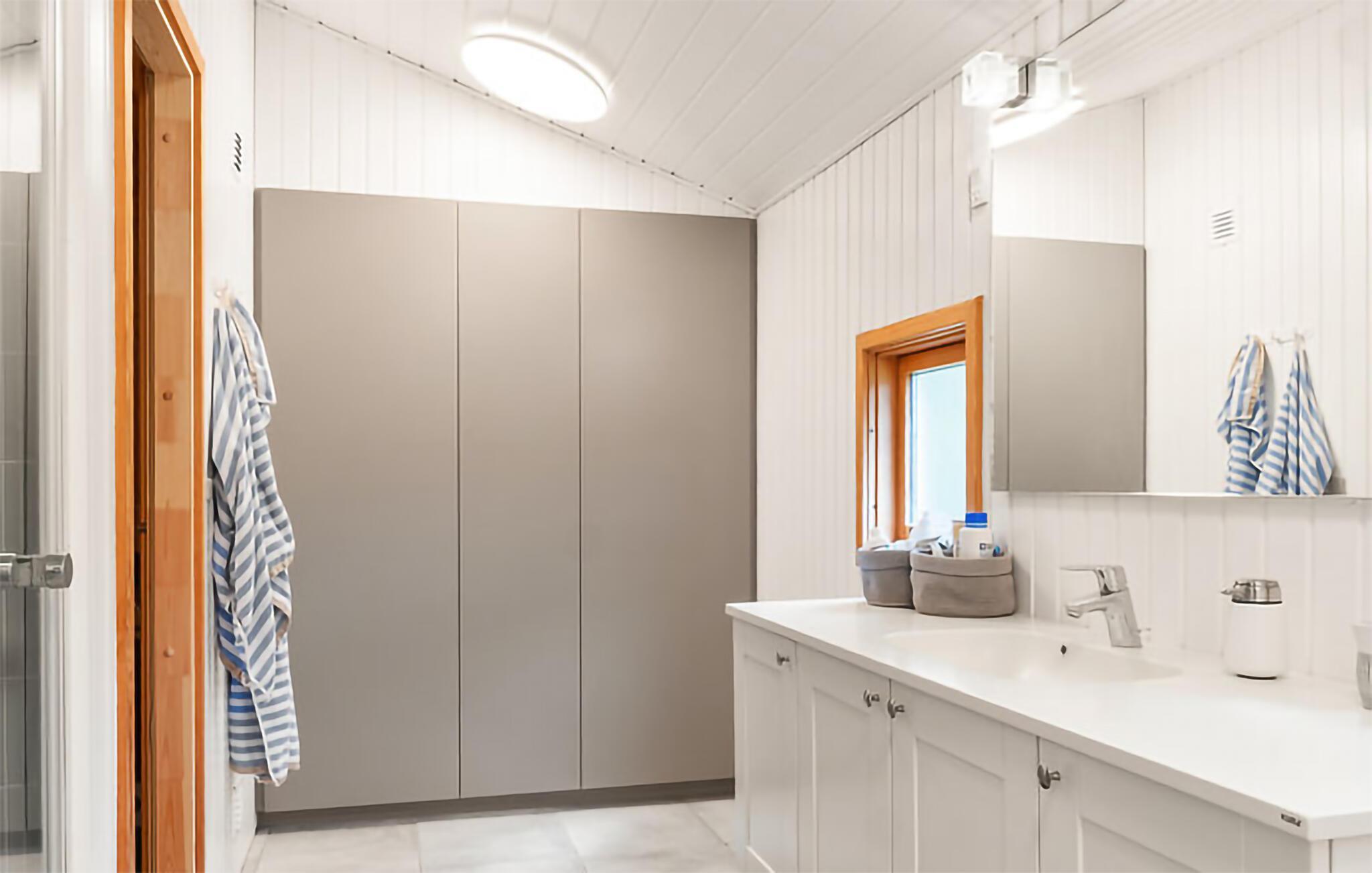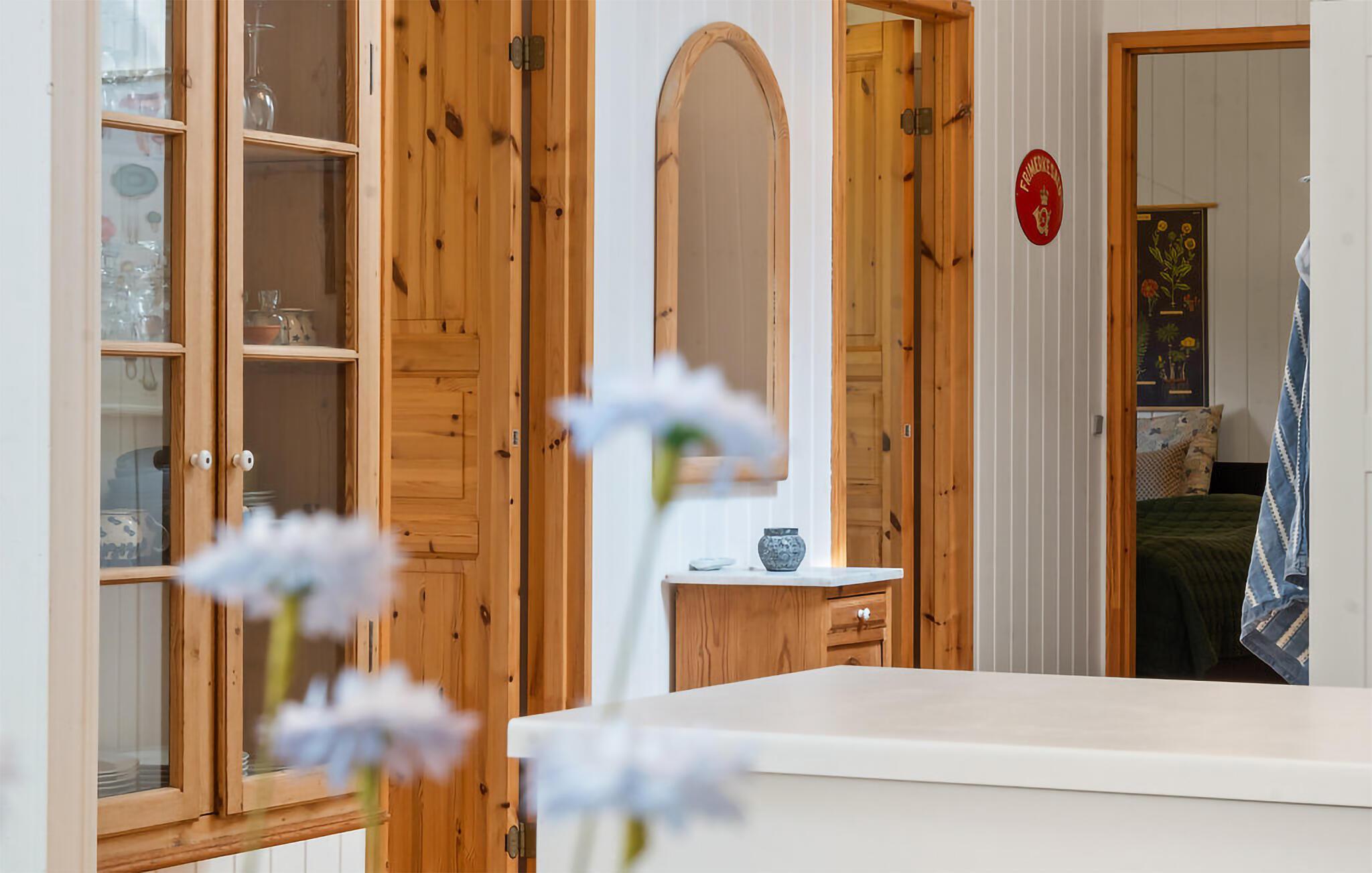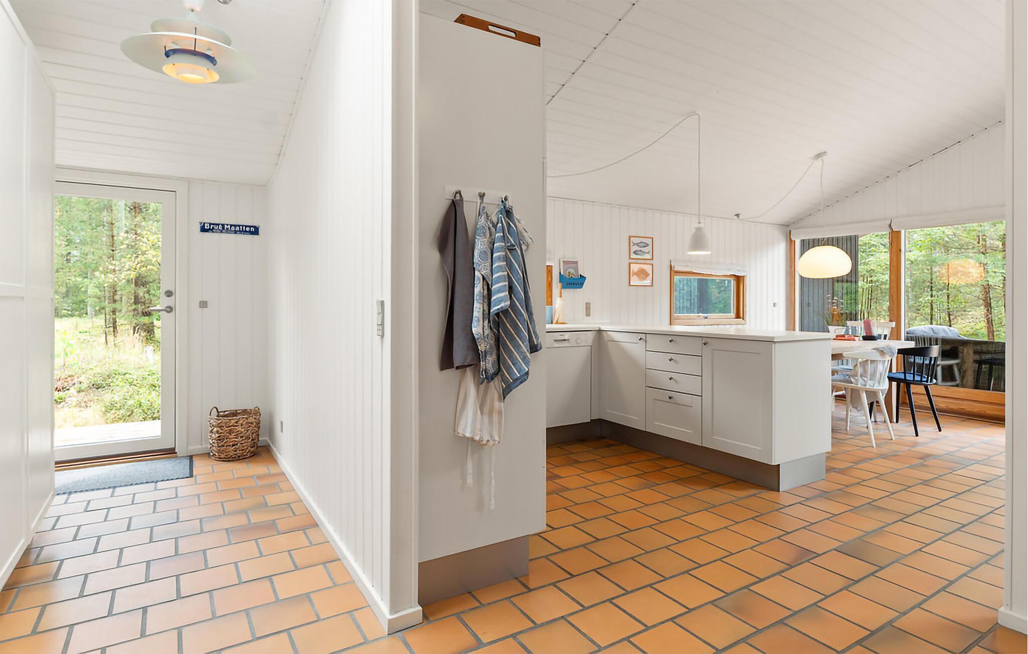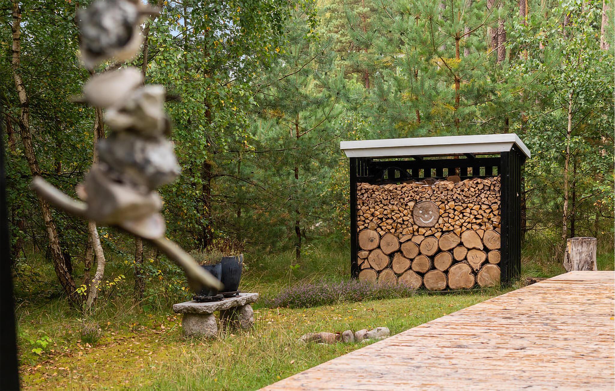 Glæd jer til afslappende dage i et stilfuldt feriehus omgivet af natur, der samtidig byder på komfort og hygge. Indenfor finder I et lyst, åbent opholdsrum med smukke møbler og store vinduer med udsigt over det grønne. Find jer til rette i sofaen og nyd gløden fra brændeovnen. Køkkenet tilbyder masser af arbejdsplads, så I nemt kan tilberede måltider. Spisebordet giver plads til, at familie og venner kan samles om aftenen. Efter en aktiv dag tilbyder saunaen beroligende afslapning.