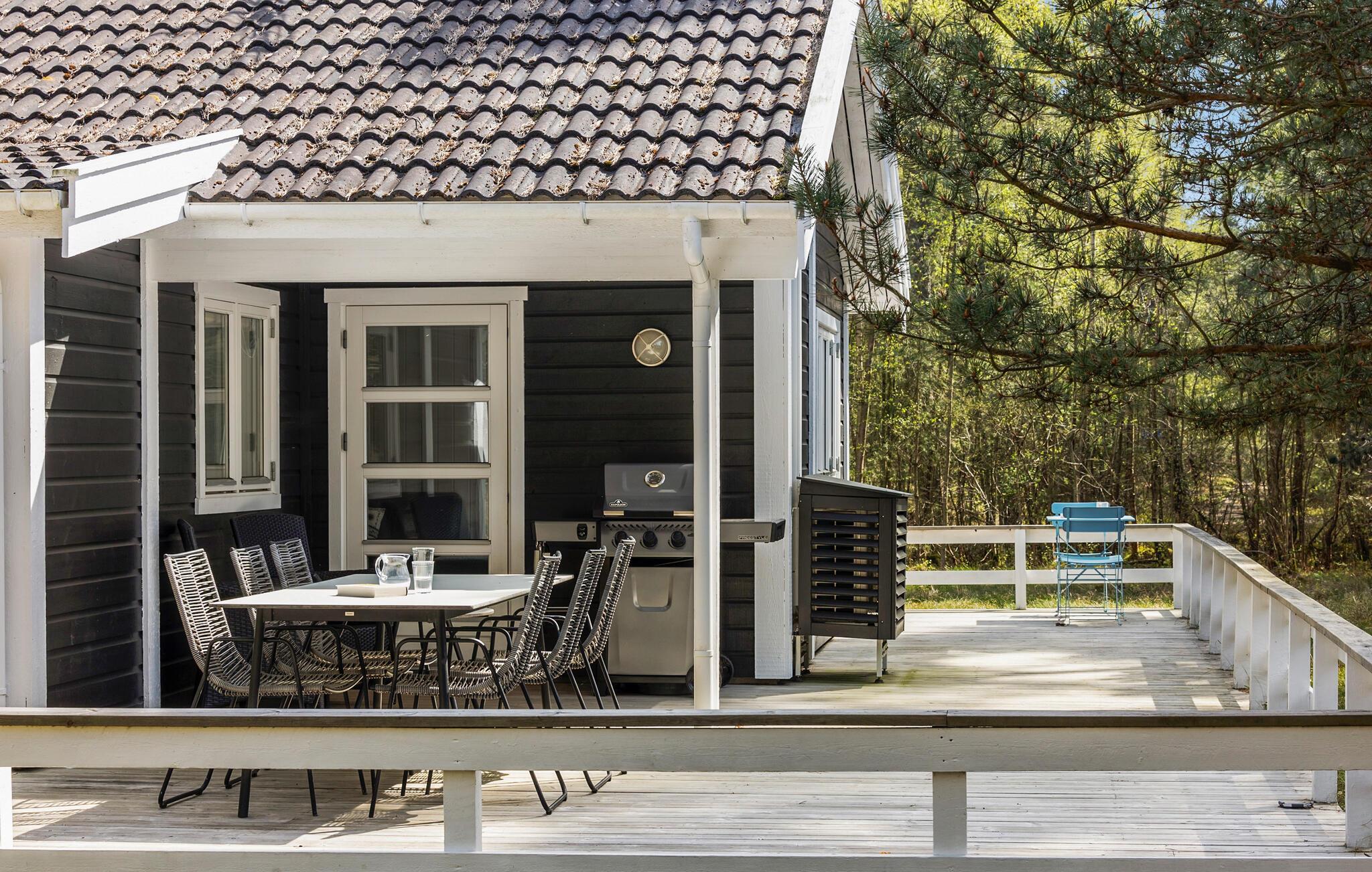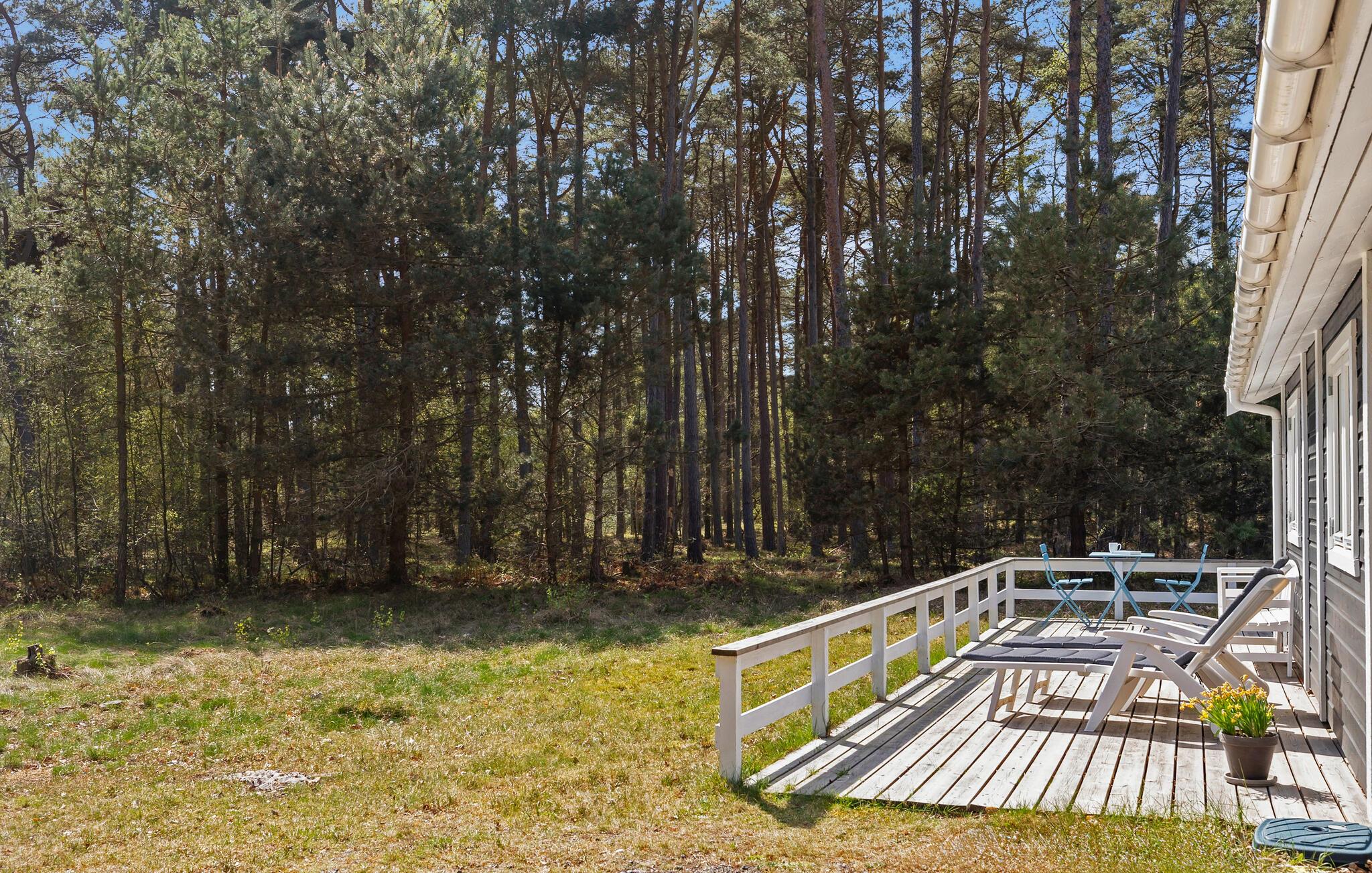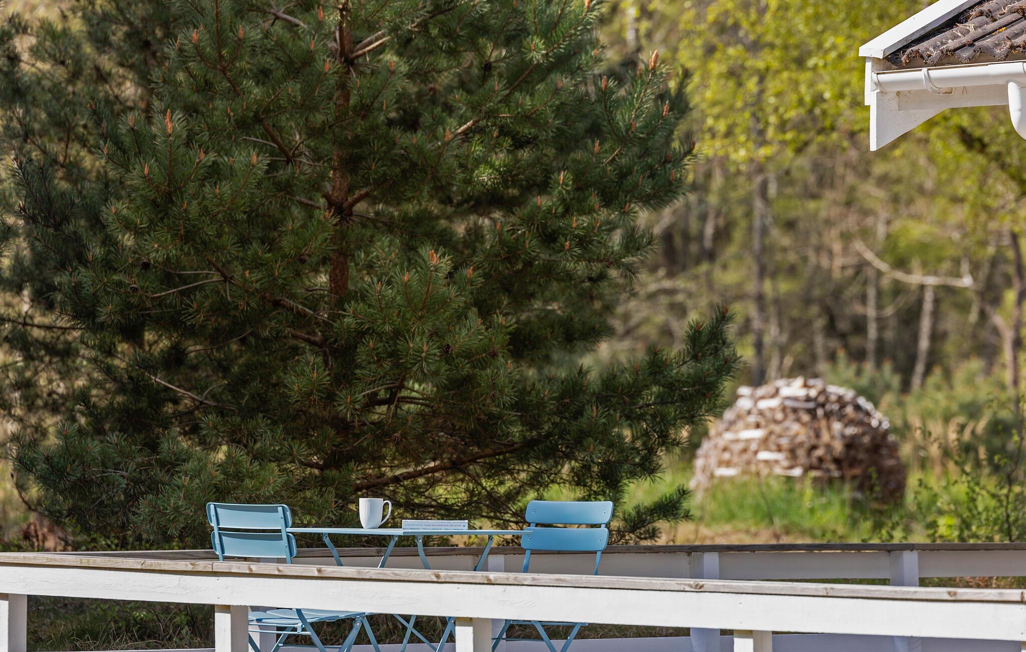 Udendørsområdet byder på masser af privatliv og plads til at trække vejret. Den store terrasse omgiver huset og er udstyret med havemøbler. Nyd måltiderne udendørs, læs en bog i solen eller nyd blot freden og roen. Den idylliske naturejendom grænser direkte op til skoven.