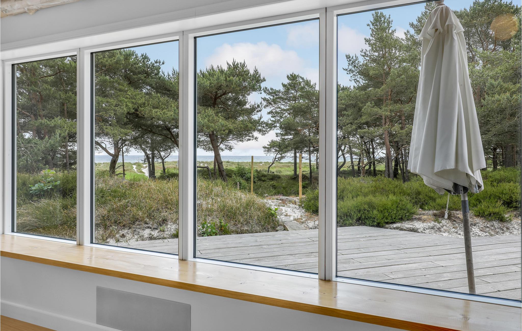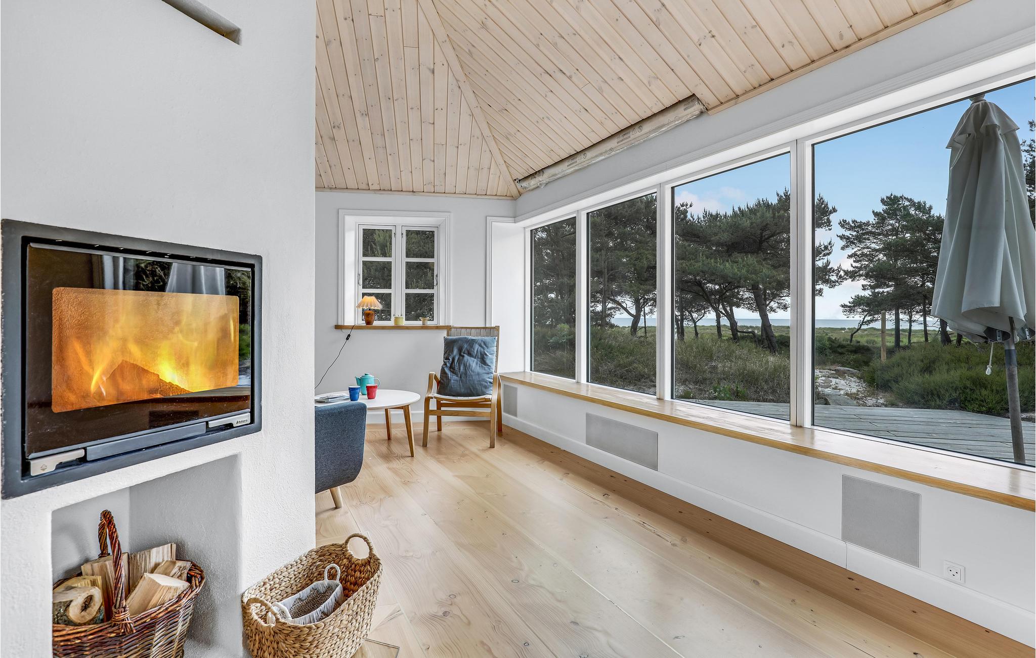 Charmerende træsommerhus i 1. række til sandstrand med havudsigt og privat sauna, perfekt til en unik ferieoplevelse på Bornholm.