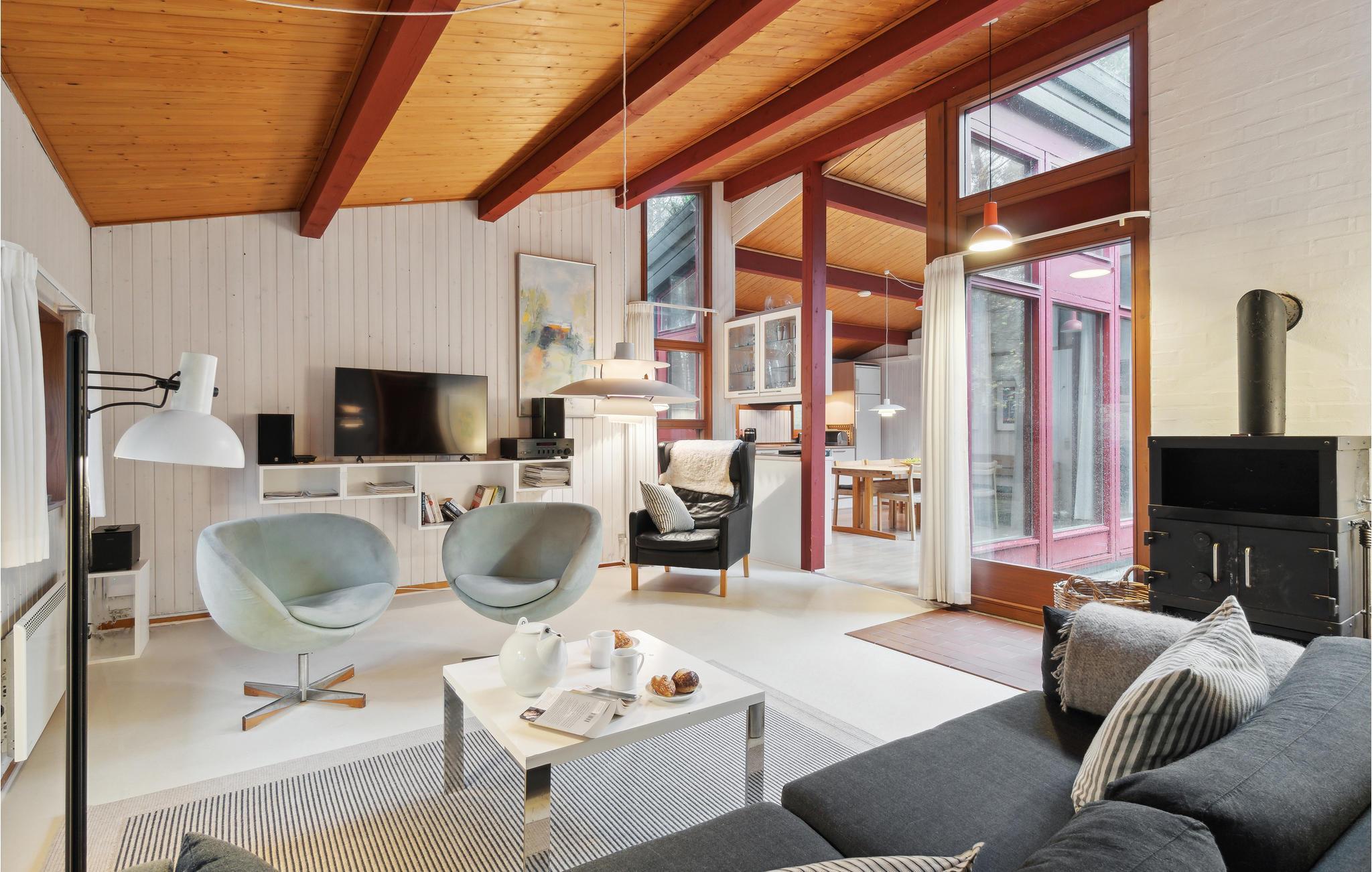Arkitekttegnet sommerhus i træ nær Dueodde strand og golfbane med hyggelig brændeovn og solrig terrasse.