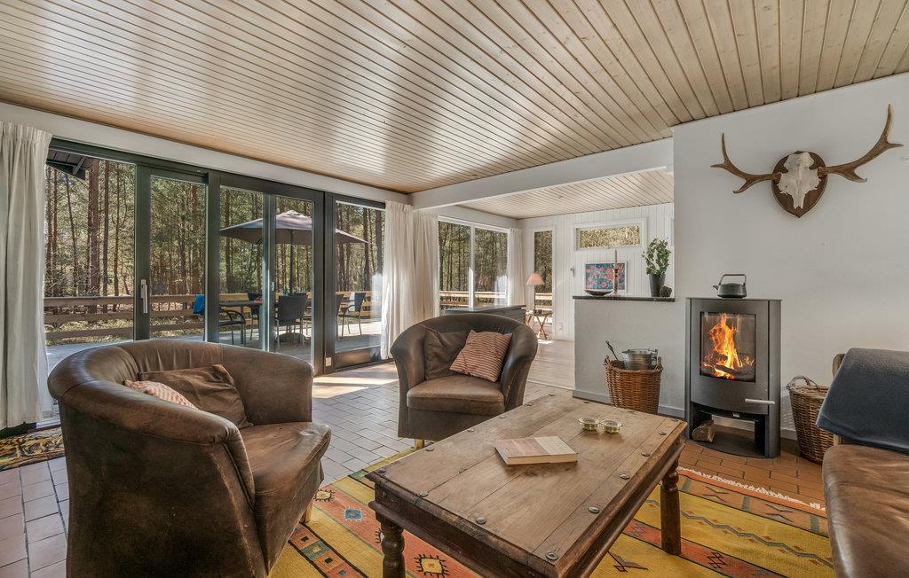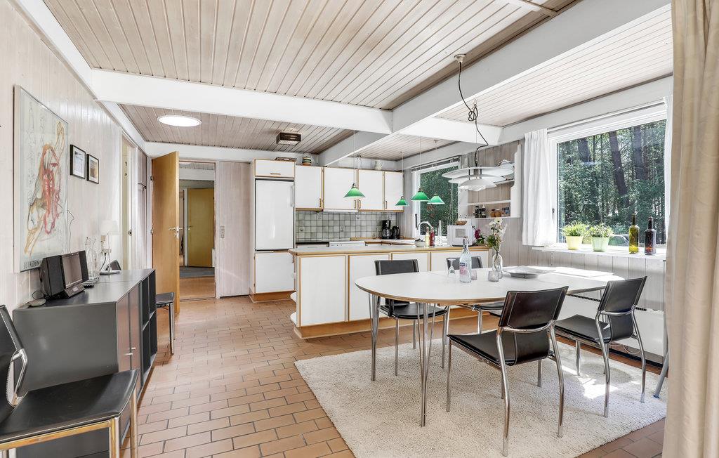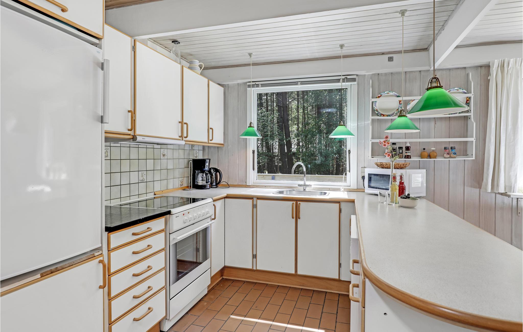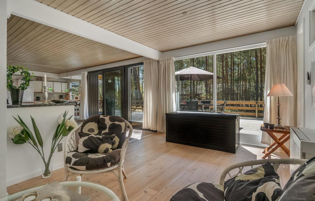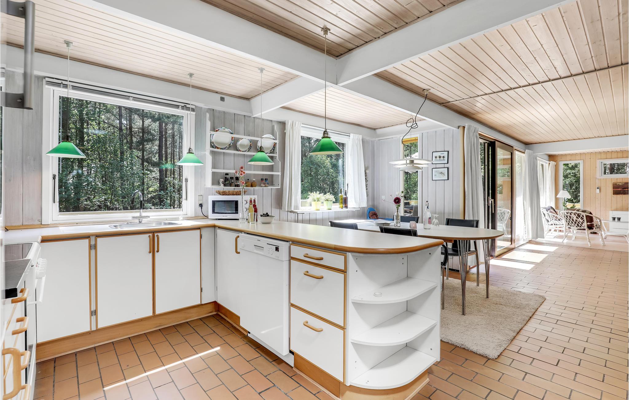I opholdsstuen med brændeovn kan I flade ud i komfortable møbler og se fjernsyn eller høre radio eller musik. I forbindelse hermed ligger spisepladsen og det åbne køkken. Derudover består huset af tre gode soveværelser og to badeværelser - det ene af dem med sauna til dejlig afslapning. I har også en vaskemaskine og tørretumbler til rådighed.