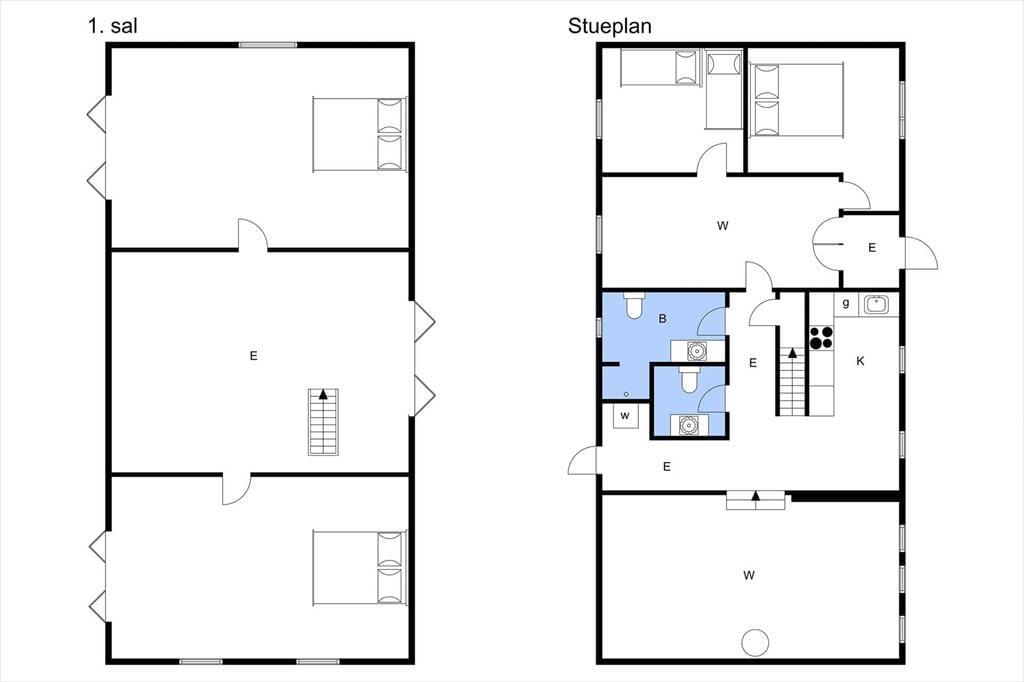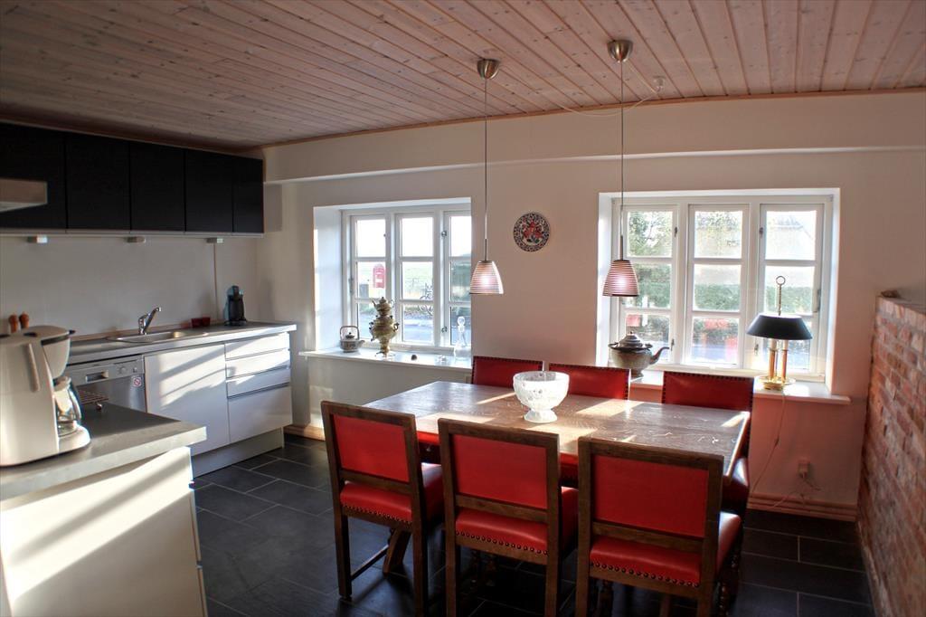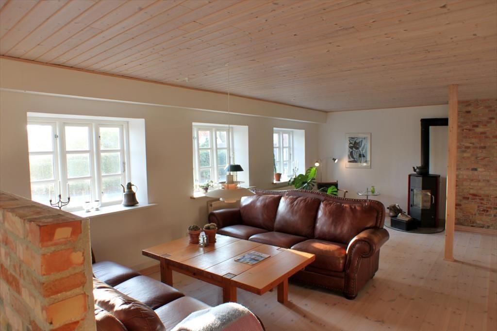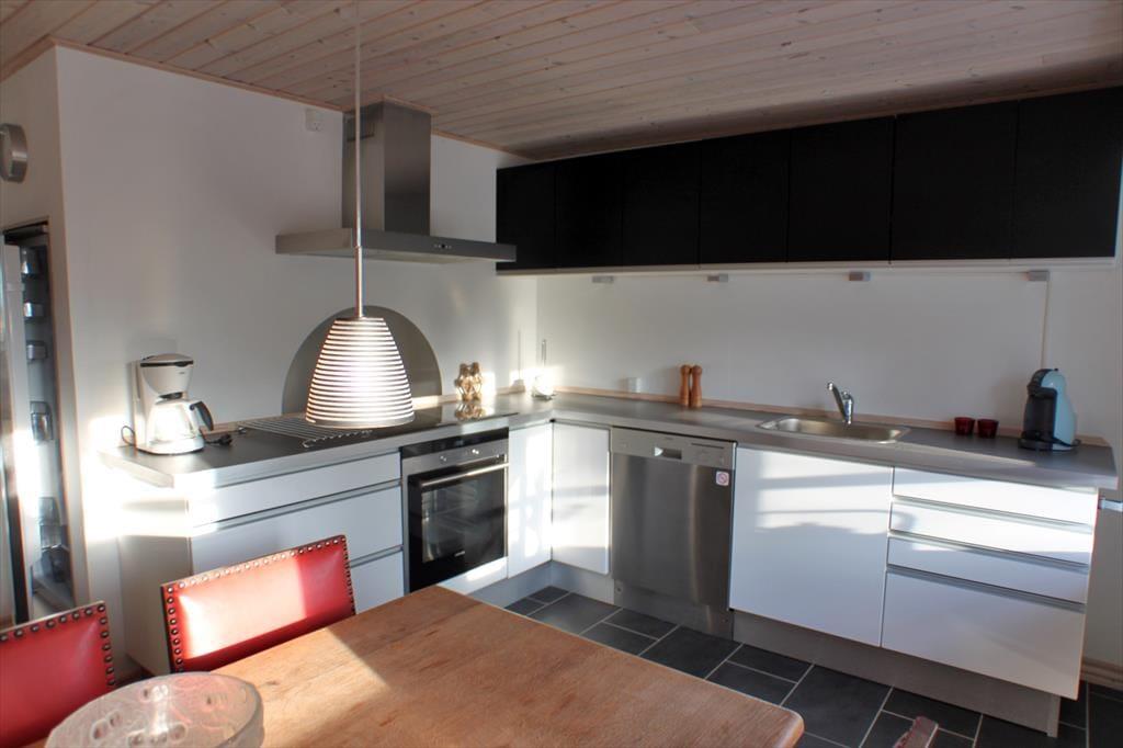 Når du træder ind i det rummelige køkken-alrum, bliver du straks mødt af en lys og indbydende atmosfære. Køkkenet er moderne og veludstyret, hvilket gør det nemt at tilberede lækre måltider under ferien. Brændeovnen i alrummet skaber en hyggelig stemning, hvor du kan nyde lange aftener med familie og venner, mens ilden knitrer i baggrunden. På første sal finder du store, lyse soveværelser med loft til kip, som indbyder til en god nats søvn efter en dag fyldt med oplevelser. De lyse lofter og de store tagvinduer giver rummene en følelse af rummelighed og ro.