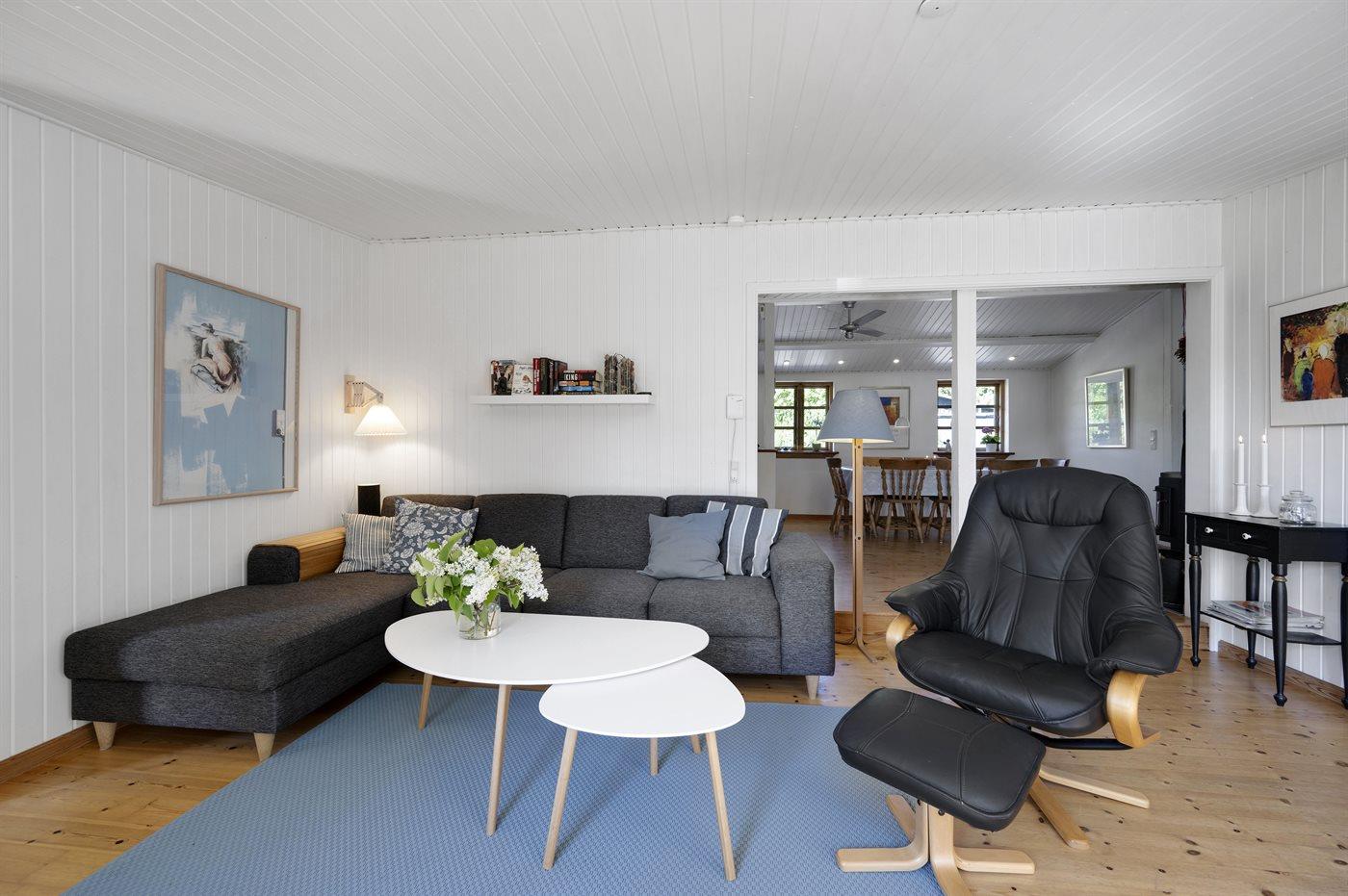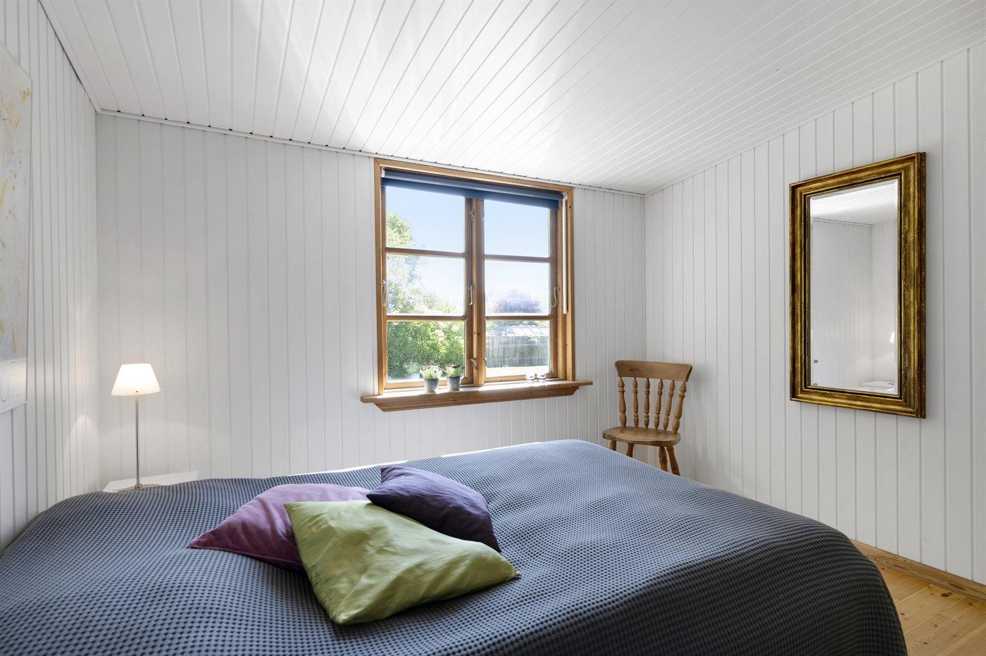 Det er hyggeligt at slentre de 400 m ned til standen, der er fælles for hele områdets sommerhuse. Der er borde og bænke, og man kan surfe eller padle. Det er en glimrende soppestrand for børn og hunde.