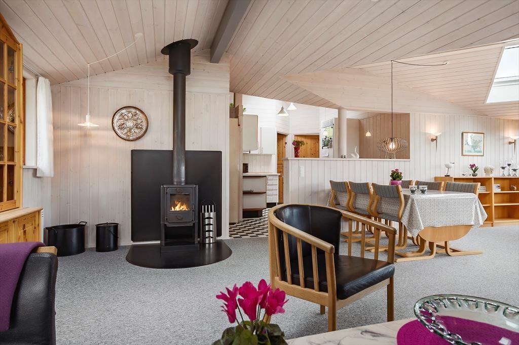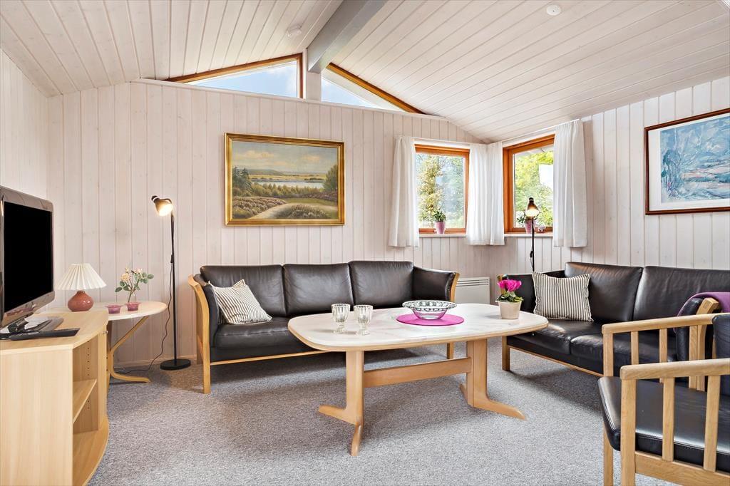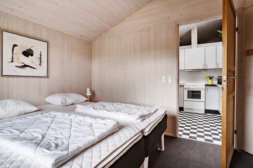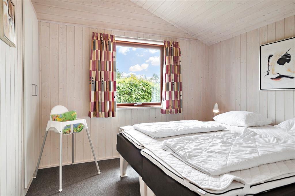 Leder du efter et sommerhus, hvor der er bredde og vidde omkring dig - så har du her fundet det helt rigtige sommerhus. Dette sommerhus er på hele 100 kvm med i alt 6 sovepladser. Huset består af entre som fører ind til husets køkken. Køkkenet er udstyret med alt i hårde hvidevarer inklusiv opvaskemaskine. Køkkenet er i åben forbindelse med den store stue, hvor der er plads til hele familien. Her er siddepladser til alle og et TV med både danske og tyske kanaler. Sommerhuset er også udstyret med internet. På de kolde aftener kan familien lune sin foran brændeovnen i stuen. Husets sovepladser fordeler sig på to værelser med dobbeltseng samt et værelse med 2 enkeltsenge. Badeværelset er med vaskemaskine og sauna.