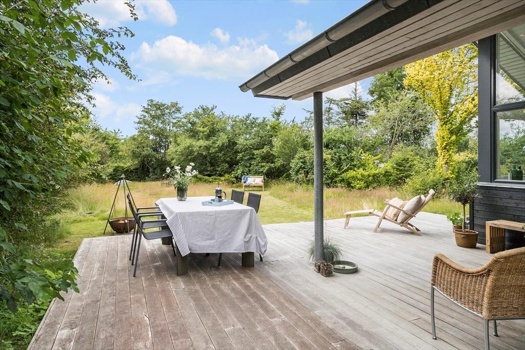 Mulighederne for at opholde sig ude under sit ophold er store. Huset ligger på en naturgrund og har træterrasse med fine havemøbler og liggestole. Det vil være oplagt at tilberede flere af dagens måltider ved udekøkkenet og på husets grill, så de kan nydes på den delvist overdækkede terrasse.