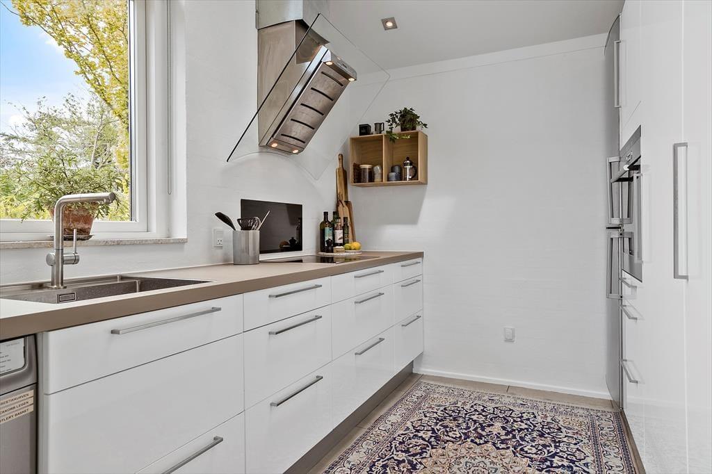 Centralt placeret i huset er der køkken/alrum, hvor køkkenet indeholder det I har brug for under jeres ophold, af moderne faciliteter til god madlavning. Her kan I nyde lysindfaldet og den fine udsigt til haven.